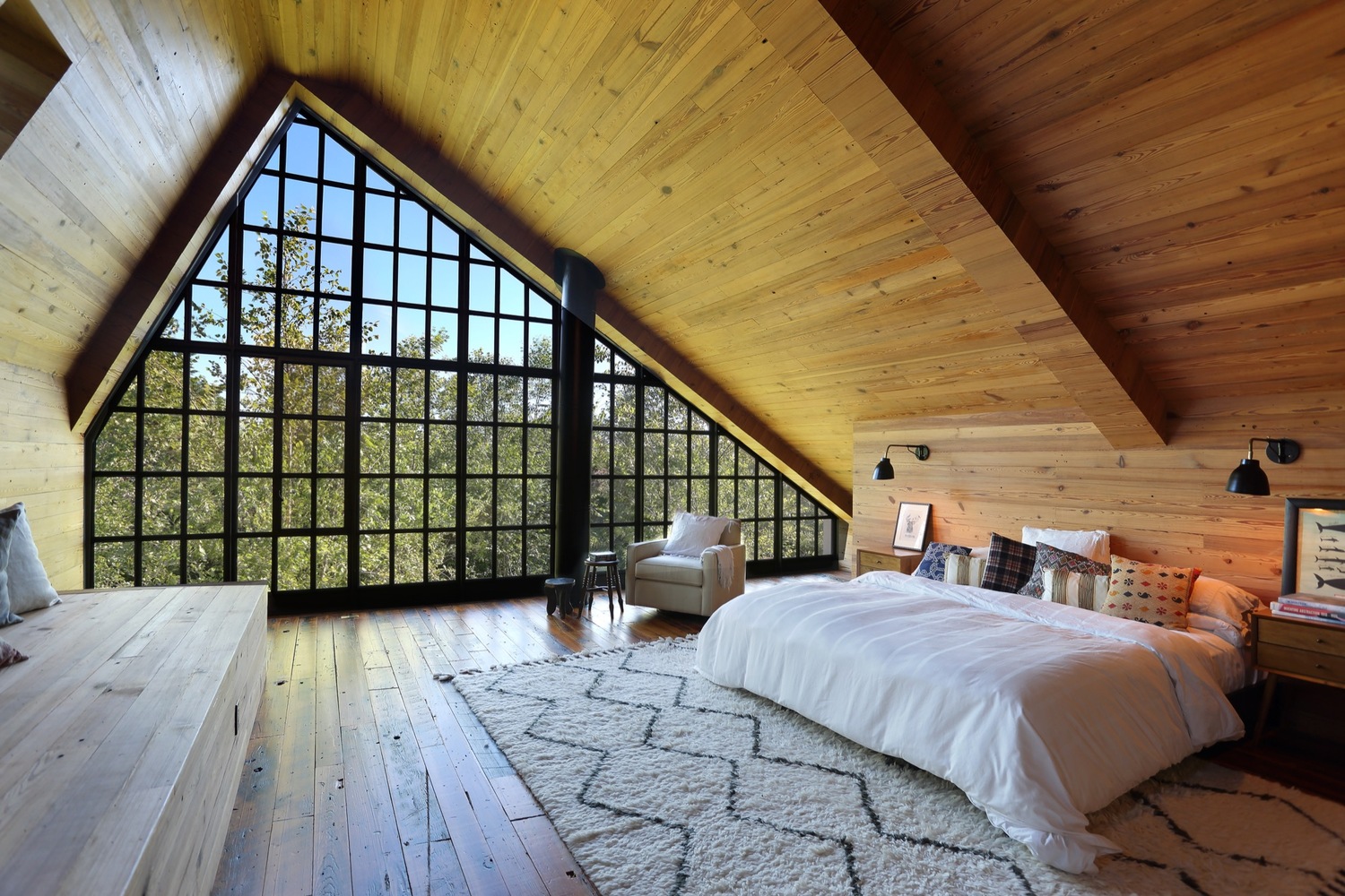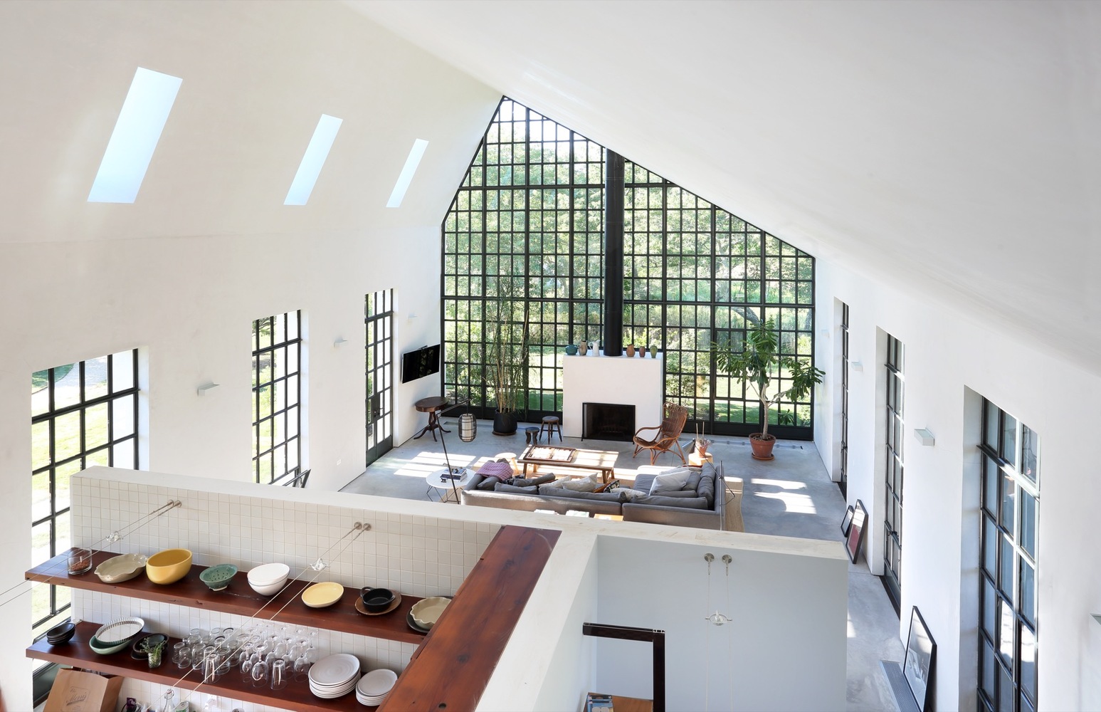 Bryła nawiązuje do archetypu farmy: prosta sylweta i powtarzalny rytm otworów okiennych porządkują elewacje, a dwukondygnacyjne przeszklenia w szczytach budują „latarniany” efekt po zmroku i kadrują dalekie widoki. Z zewnątrz dom wydaje się zwarty i osadzony, wewnątrz – lekki i płynny.