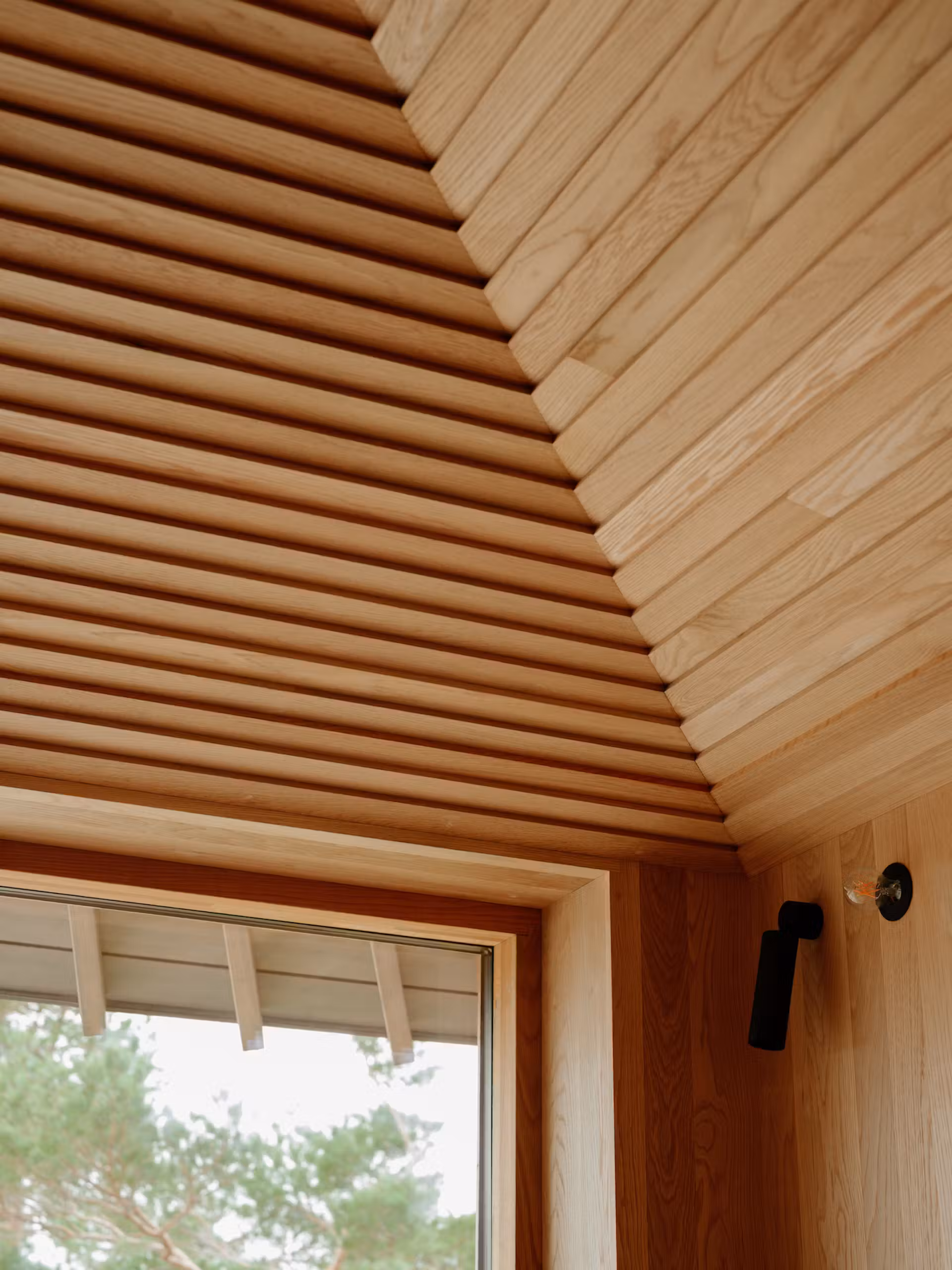 Betonowa podstawa budynku, odlana na miejscu, posiada kolor zbliżony do skały, dzięki czemu z czasem pokrywa się naturalną patyną, jeszcze lepiej integrując się z otoczeniem. Na surowy beton na elewacji nałożono okładzinę z cedru, a wnętrze wykończono dębowym sufitem, który optycznie ociepla przestrzeń.