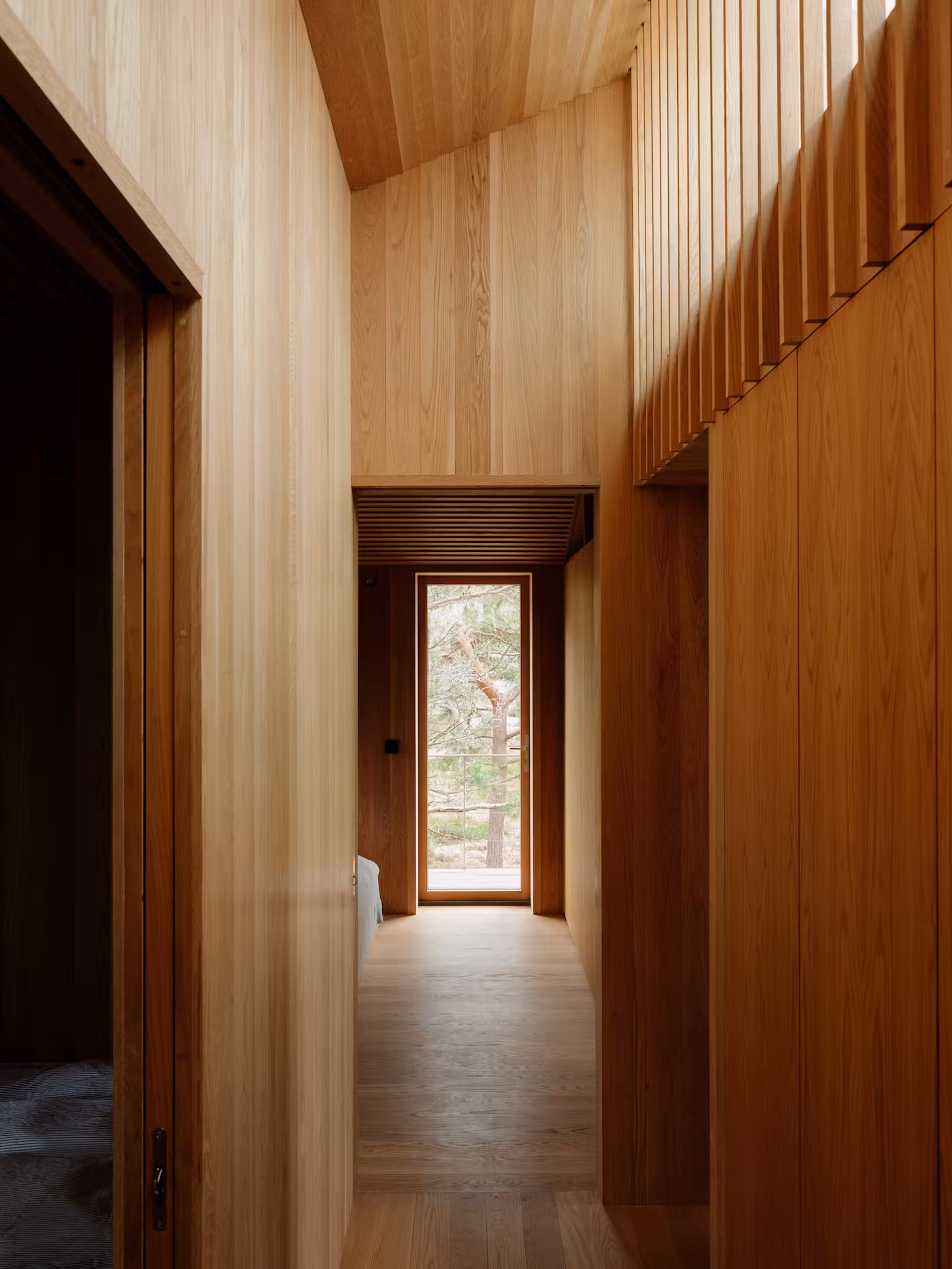 Centralnym punktem domu jest przeszklony dach, który działa jak szyberdach, zapewniając naturalną wentylację i dostęp do światła dziennego. Dzięki temu wnętrze zmienia się w ciągu dnia, a gra światła i cienia na pochyłym dachu nadaje przestrzeni wyjątkowy charakter.