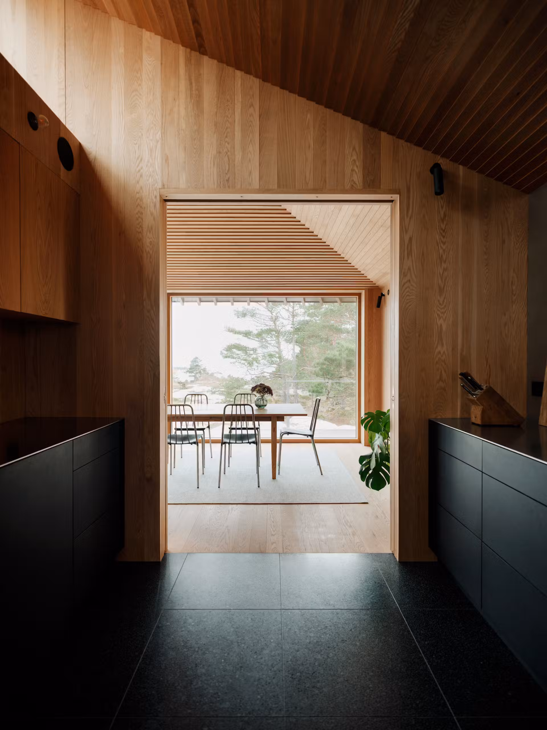 Rodzina Solgaard ceni sobie gotowanie, dlatego kuchnia została oddzielona od salonu, by zachować ciszę i czyste powietrze w strefie wypoczynkowej. Latem dom naturalnie chłodzi się dzięki połączeniu betonowej podstawy i wentylacji dachowej, a w chłodniejszych miesiącach komfort zapewnia izolacja z rozdrobnionego drewna świerkowego, która stabilizuje wilgotność i utrzymuje przyjemne ciepło nawet podczas surowych, norweskich zim.