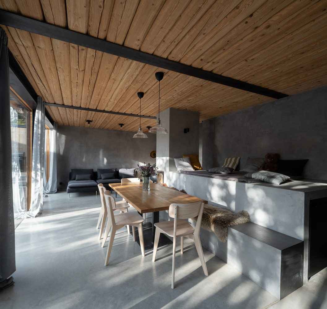 Projekt łączy nowoczesne technologie z historycznymi metodami budowlanymi. Ręcznie ciosany sufit został wkomponowany w stalową konstrukcję, która przechodzi w bezramowe przeszklenia, a barwiony i polerowany tynk wewnętrzny zachowuje naturalny charakter powierzchni. W projekcie zastosowano także tradycyjną japońską technikę opalanego drewna shou-sugi-ban, tworząc unikatowy kontrast między surowością materiałów a elegancją współczesnych rozwiązań.