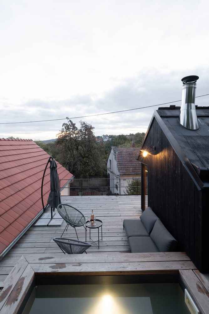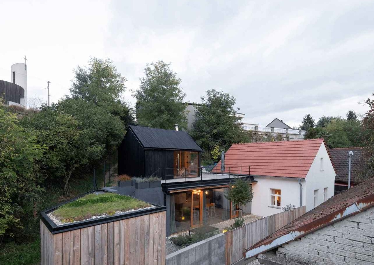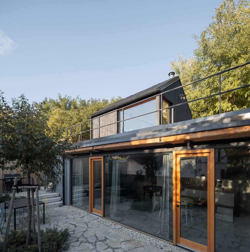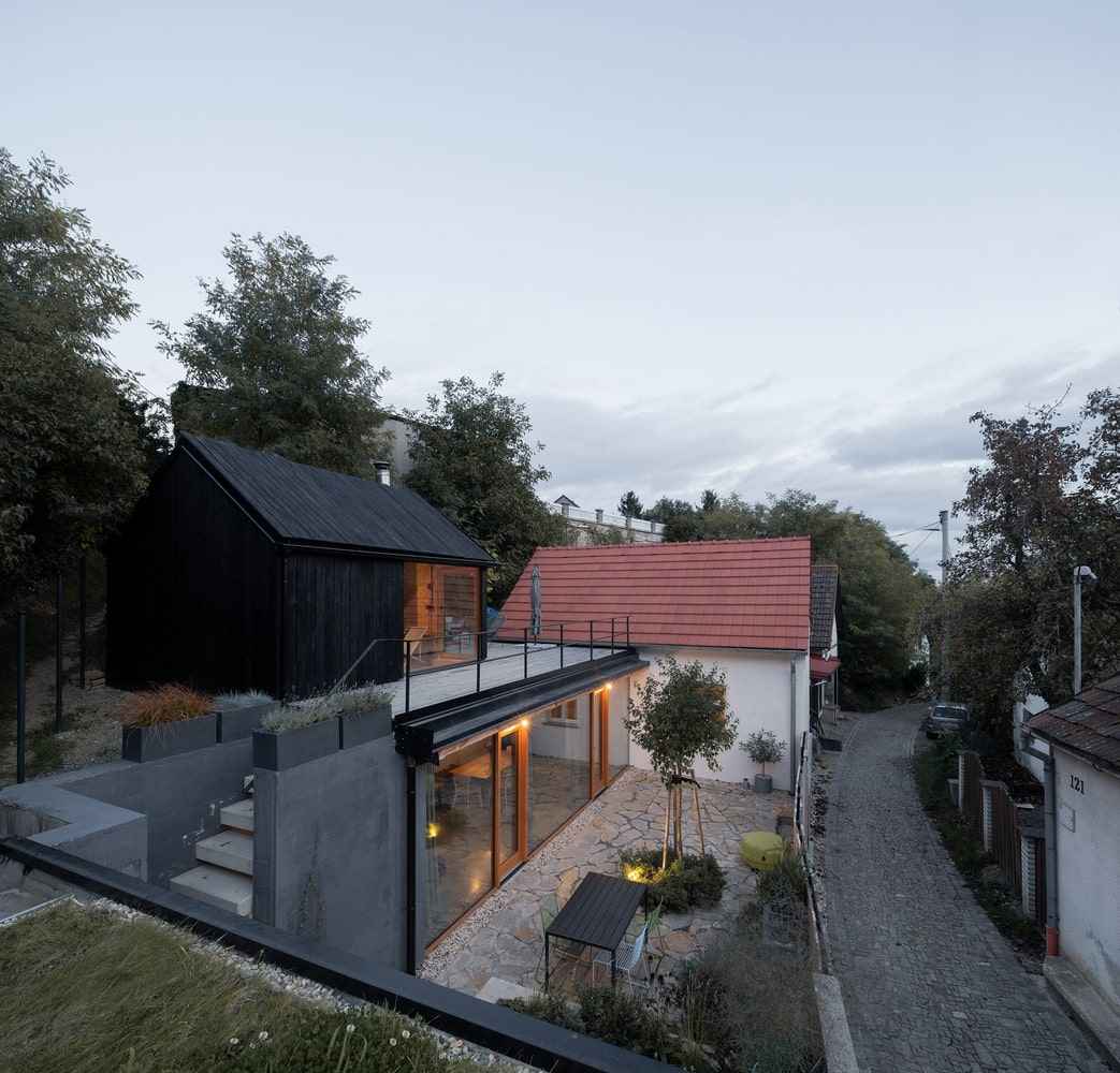 Dom położony jest w malowniczej alejce otoczonej piwnicami i winnicami, z trudnym dostępem dla ciężkiego sprzętu budowlanego. Pierwotny projekt zakładał odbudowę starego domu, jednak stan istniejący wymusił budowę nowego obiektu, który respektuje oryginalną powierzchnię i kształt działki. Nowoczesna stodoła koncepcyjnie podzielona jest na kilka rzutów i części konstrukcyjnych – dolna część murowana mieści sypialnię, łazienkę i toaletę, natomiast salon zlokalizowano na piętrze. Drewniana nadbudowa obejmuje saunę i strefę relaksu, tworząc harmonijną przestrzeń mieszkalną.