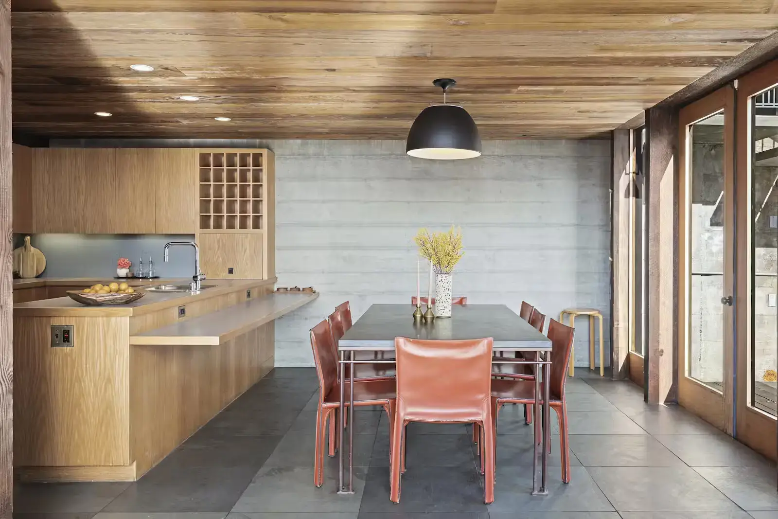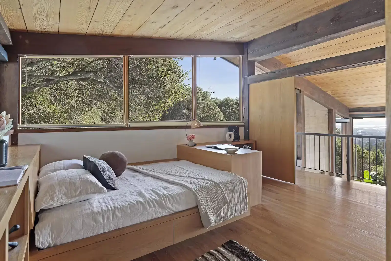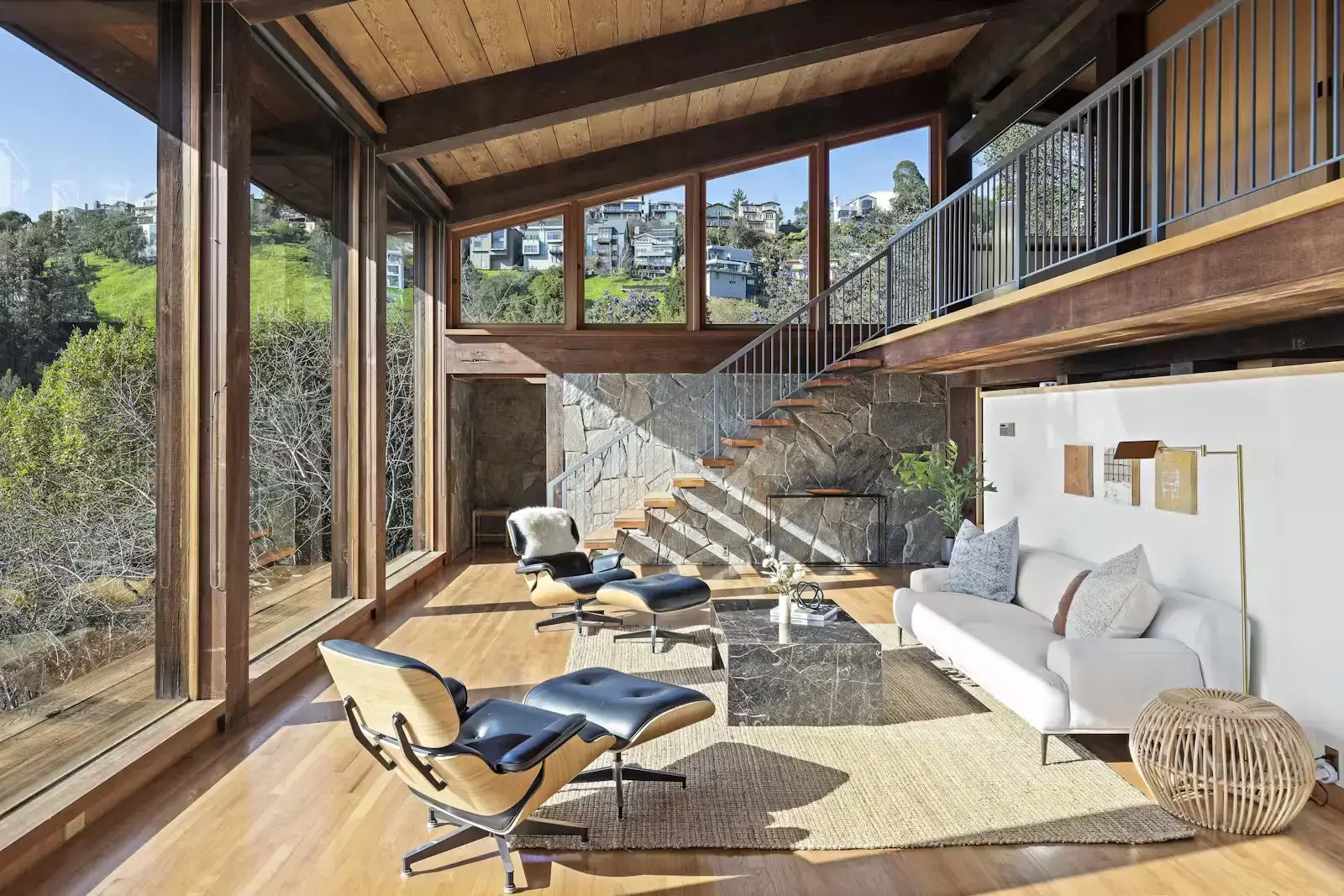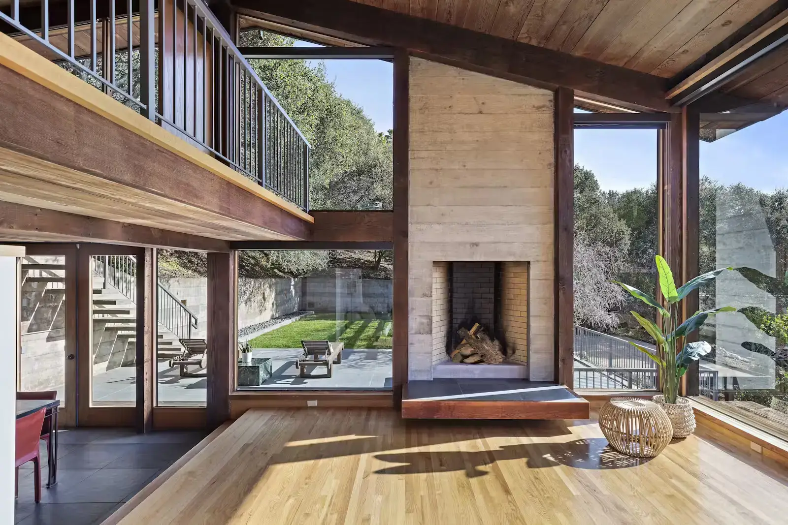 Przez kamienne wejście skręć za róg, aby dotrzeć do oszałamiającej części dziennej o otwartej koncepcji. Sklepione sufity wykonano z drewna dębowego, wspartego belkami z sekwoi. Kamienny kominek otacza przestrzeń. Otoczono go oknami sięgającymi od podłogi do sufitu, z których roztaczają się zapierające dech w piersiach widoki na zatokę. Część dzienna rozciąga się na całą długość domu. Tuż za nią, otoczone wbudowanymi półkami na książki, znajduje się biuro. Tuż obok znajduje się łazienka na pierwszym piętrze, wyłożona kafelkami w delikatnym niebieskim kolorze. Za rogiem znajduje się kuchnia z blatami z naturalnego drewna, betonowymi ścianami i płytką na podłodze oraz jadalnia wychodząca na podwórko. Trawnik i luksusowe miejsce na ognisko to kamienie węgielne tej przestrzeni, która jest zarówno prywatna, jak i ekspansywna. Na górze pływających schodów znajdują się dwie sypialnie. Dzielą jasną łazienkę ze świetlikiem i ścianą luster. Stąd wyjdź na przydomowy dziedziniec, spokojną przestrzeń z tryskającą fontanną. Mieszkanie na zewnątrz i na parterze posiada nowoczesną kuchnię i łazienkę.