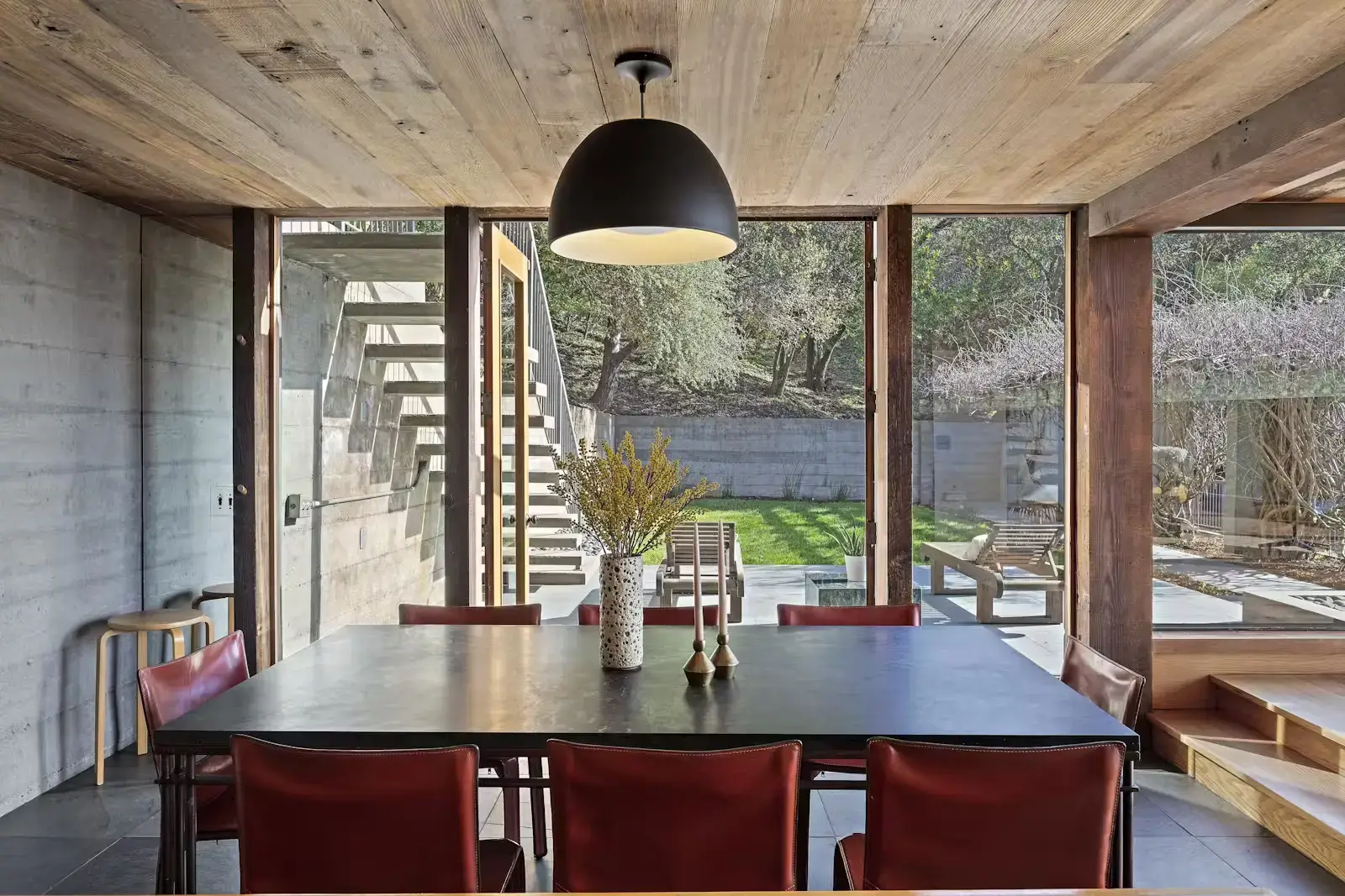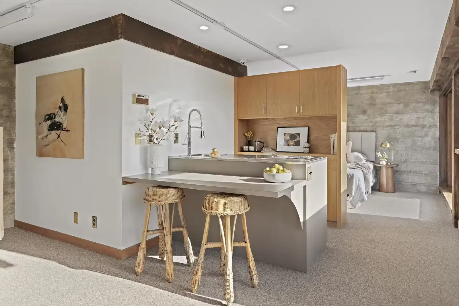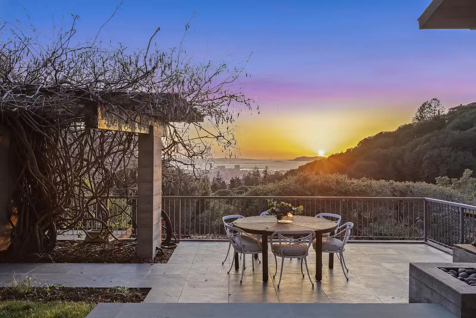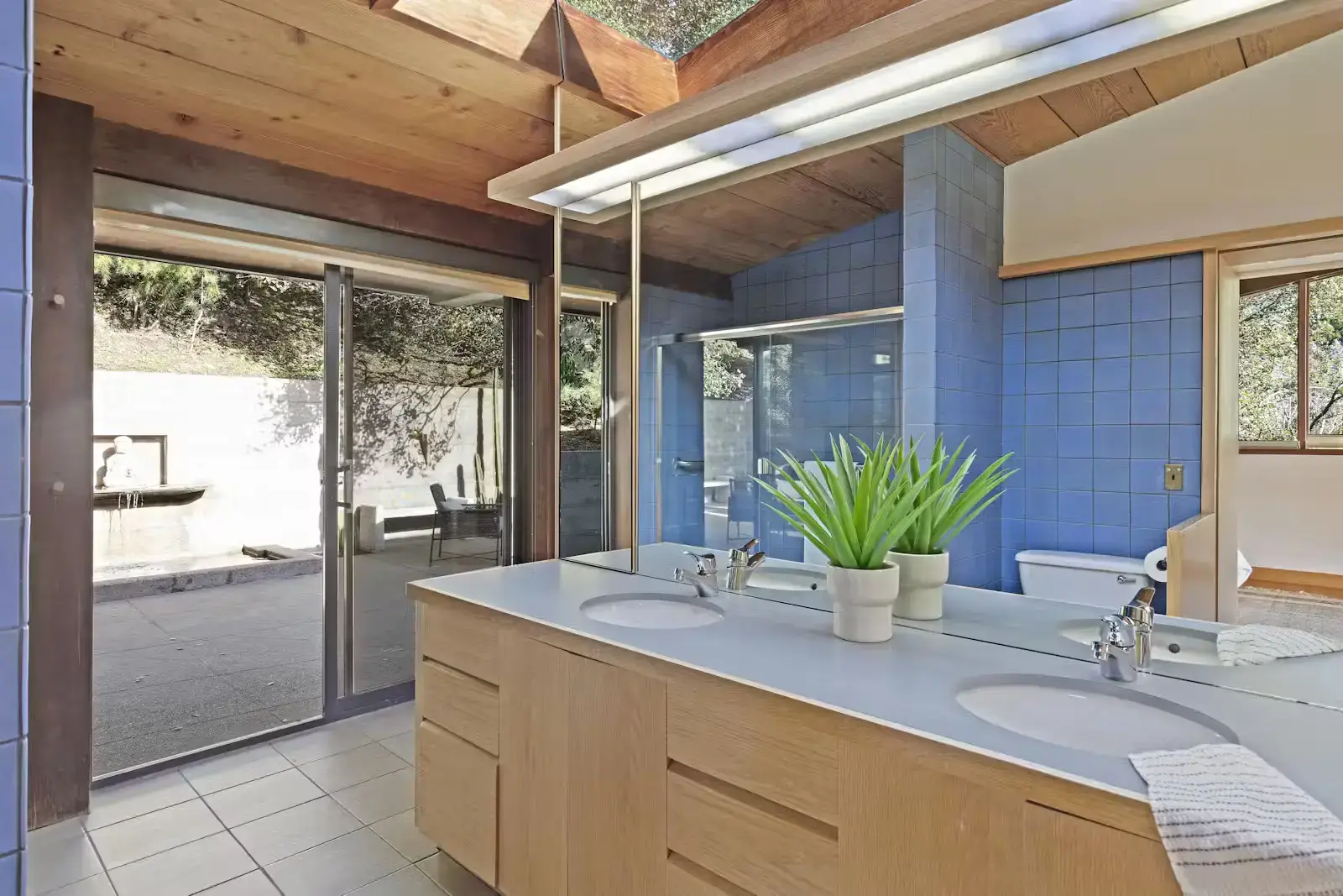 Przez kamienne wejście skręć za róg, aby dotrzeć do oszałamiającej części dziennej o otwartej koncepcji. Sklepione sufity wykonano z drewna dębowego, wspartego belkami z sekwoi. Kamienny kominek otacza przestrzeń. Otoczono go oknami sięgającymi od podłogi do sufitu, z których roztaczają się zapierające dech w piersiach widoki na zatokę. Część dzienna rozciąga się na całą długość domu. Tuż za nią, otoczone wbudowanymi półkami na książki, znajduje się biuro. Tuż obok znajduje się łazienka na pierwszym piętrze, wyłożona kafelkami w delikatnym niebieskim kolorze. Za rogiem znajduje się kuchnia z blatami z naturalnego drewna, betonowymi ścianami i płytką na podłodze oraz jadalnia wychodząca na podwórko. Trawnik i luksusowe miejsce na ognisko to kamienie węgielne tej przestrzeni, która jest zarówno prywatna, jak i ekspansywna. Na górze pływających schodów znajdują się dwie sypialnie. Dzielą jasną łazienkę ze świetlikiem i ścianą luster. Stąd wyjdź na przydomowy dziedziniec, spokojną przestrzeń z tryskającą fontanną. Mieszkanie na zewnątrz i na parterze posiada nowoczesną kuchnię i łazienkę.