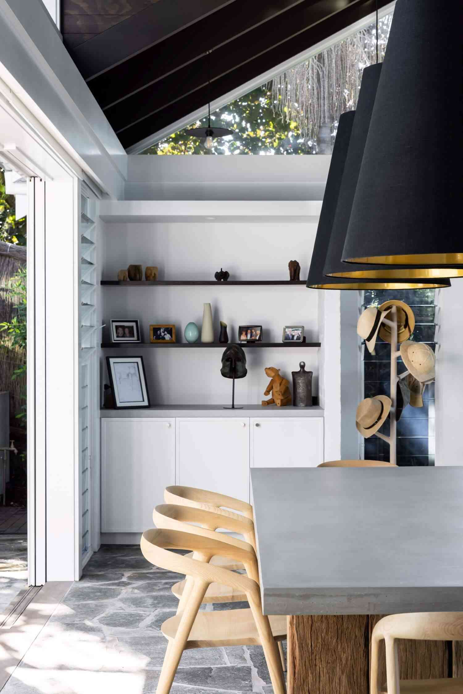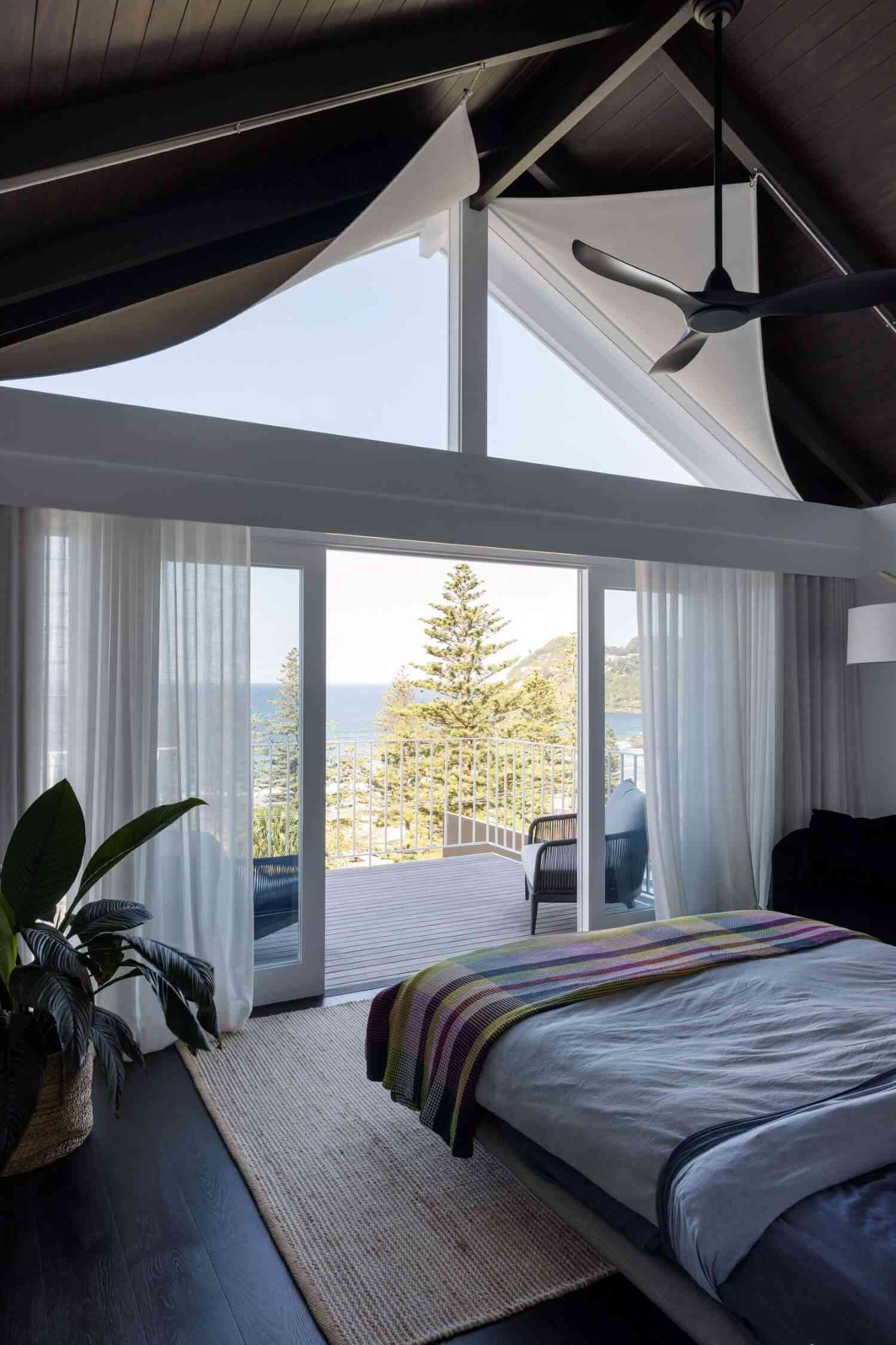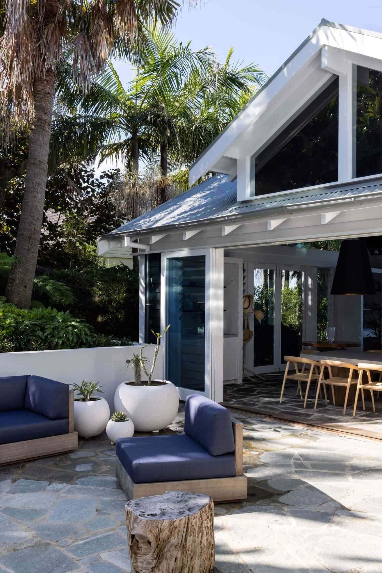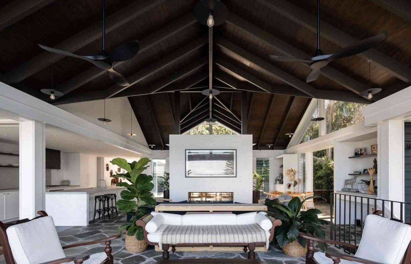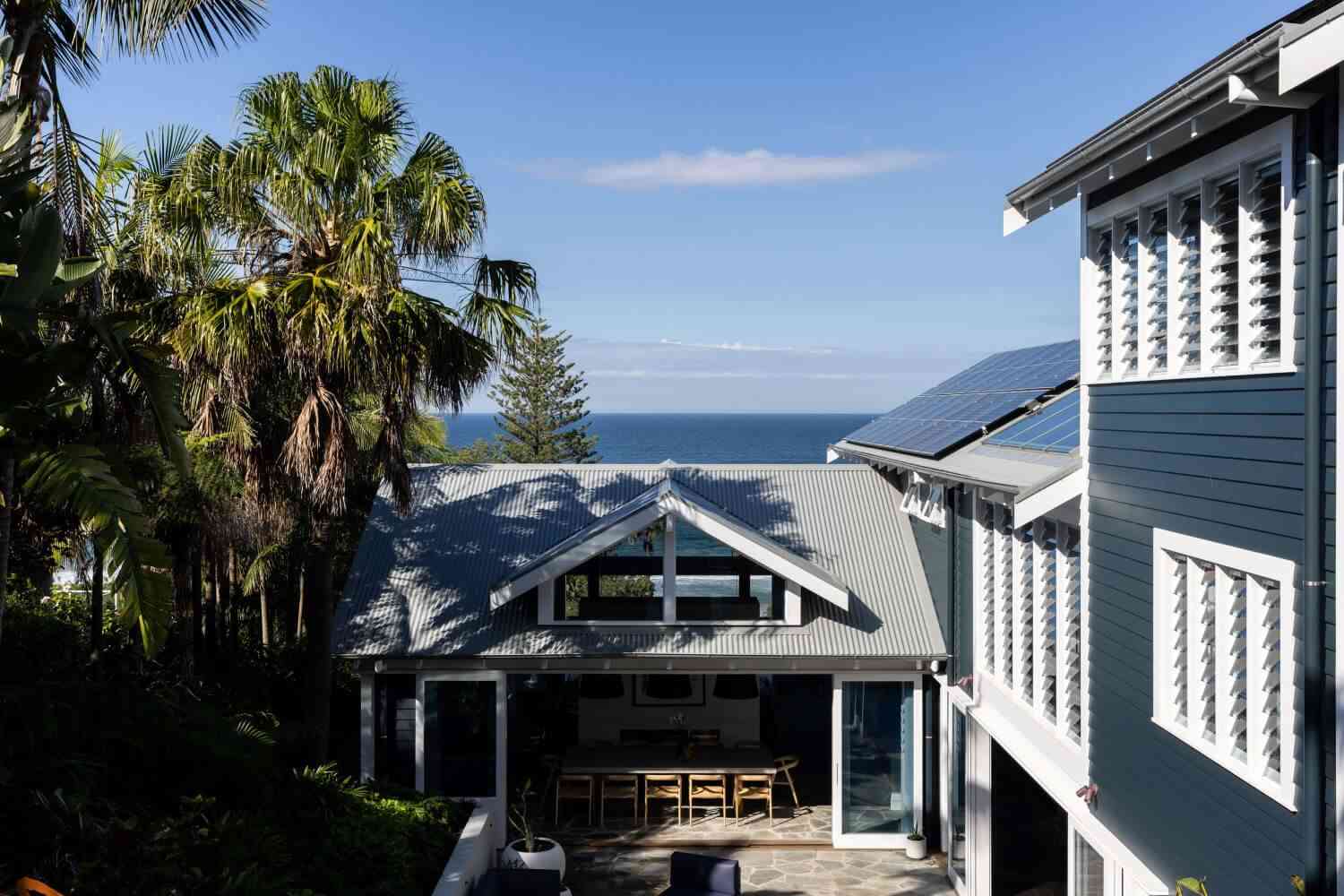 Wnętrza Whale Beach House to esencja stylu nowoczesna stodoła – wysokie sufity, naturalne materiały, drewno, bielone ściany i roślinność, która płynnie przechodzi z ogrodu do środka domu. Otwarta przestrzeń dzienna z kuchnią, jadalnią i salonem tworzy tło dla letniego życia w rytmie australijskiego wybrzeża. Liczne palmy – zarówno w środku, jak i w ogrodzie – potęgują poczucie tropikalnej swobody i bliskości natury. Ten projekt to idealne połączenie nowoczesności, komfortu i zachwycającej lokalizacji nad oceanem.
