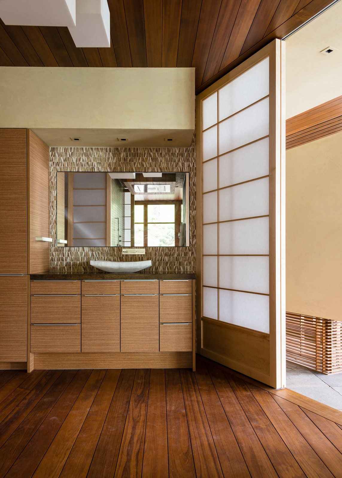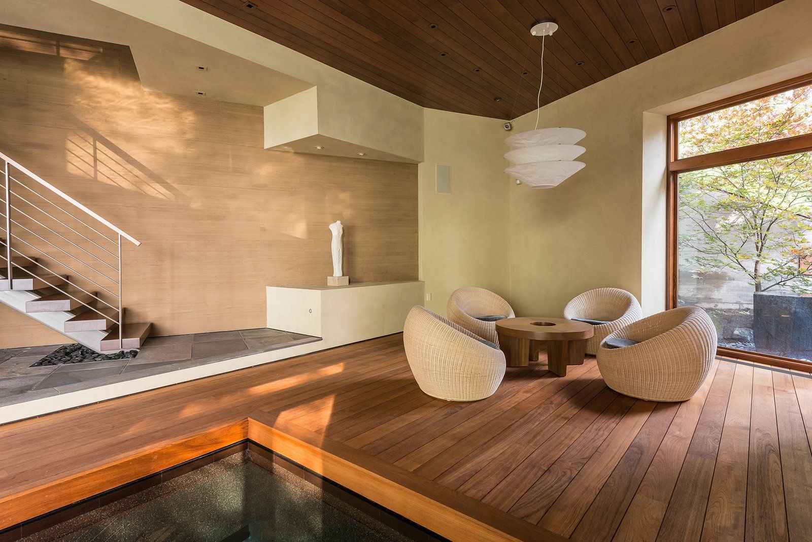 Mimo umiarkowanej skali, dom oferuje bogaty program funkcjonalny i liczne nowoczesne udogodnienia. Wnętrze mieści kryty basen o długości niemal 23 metrów, dużą wannę w stylu japońskim, strefę ćwiczeń oraz kameralną galerię sztuki. Zespół budynków sprawia wrażenie grupy niewielkich domków, które miejscami wtapiają się w zbocze, a miejscami śmiało wysuwają się ponad teren, tworząc dynamiczny kontrast między architekturą a krajobrazem.