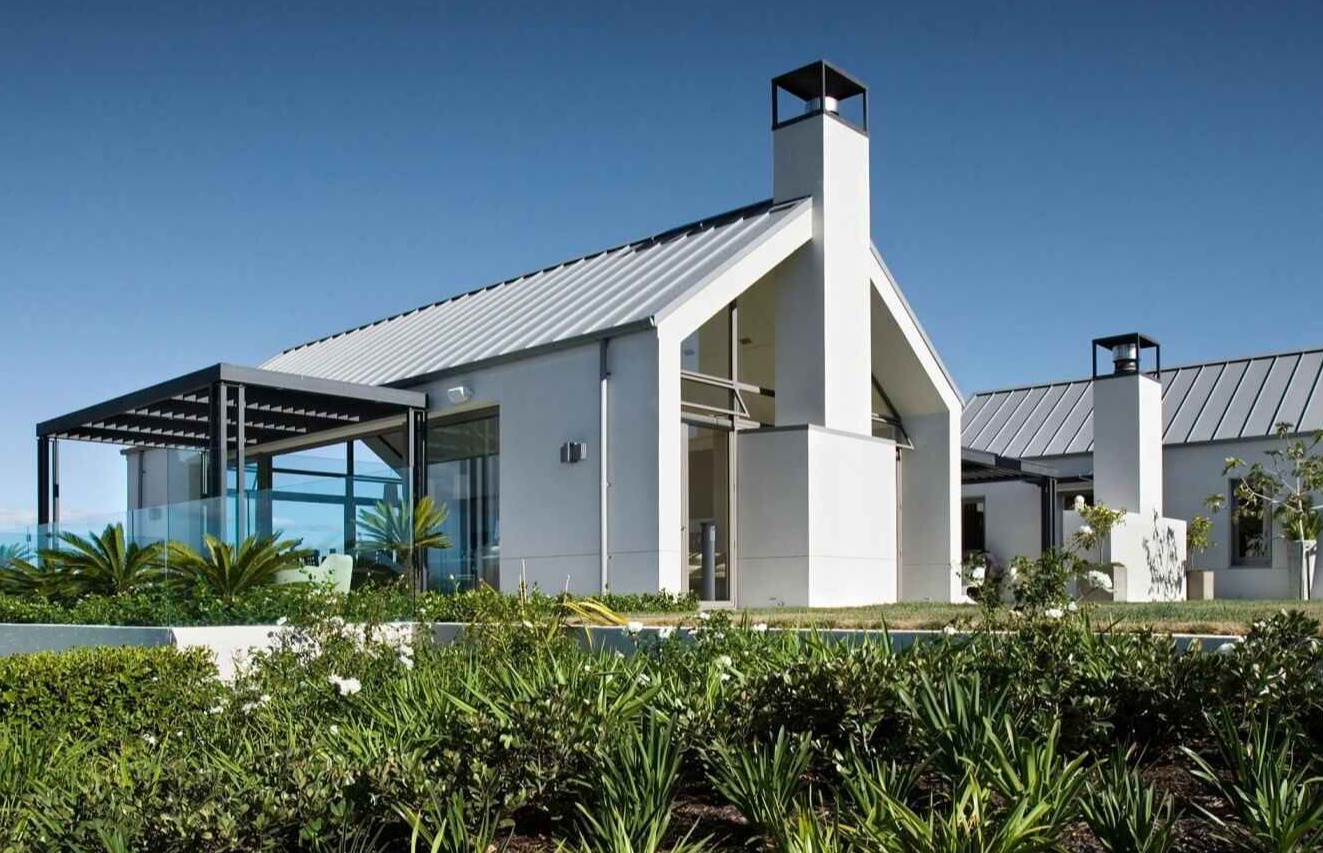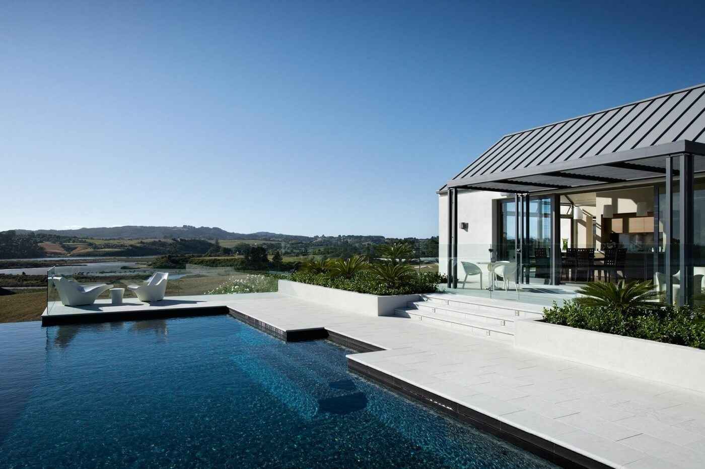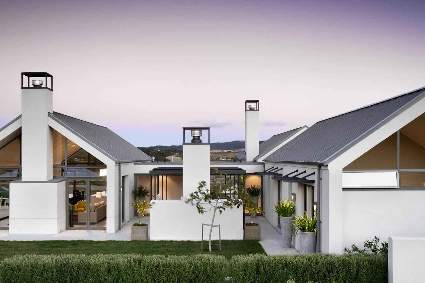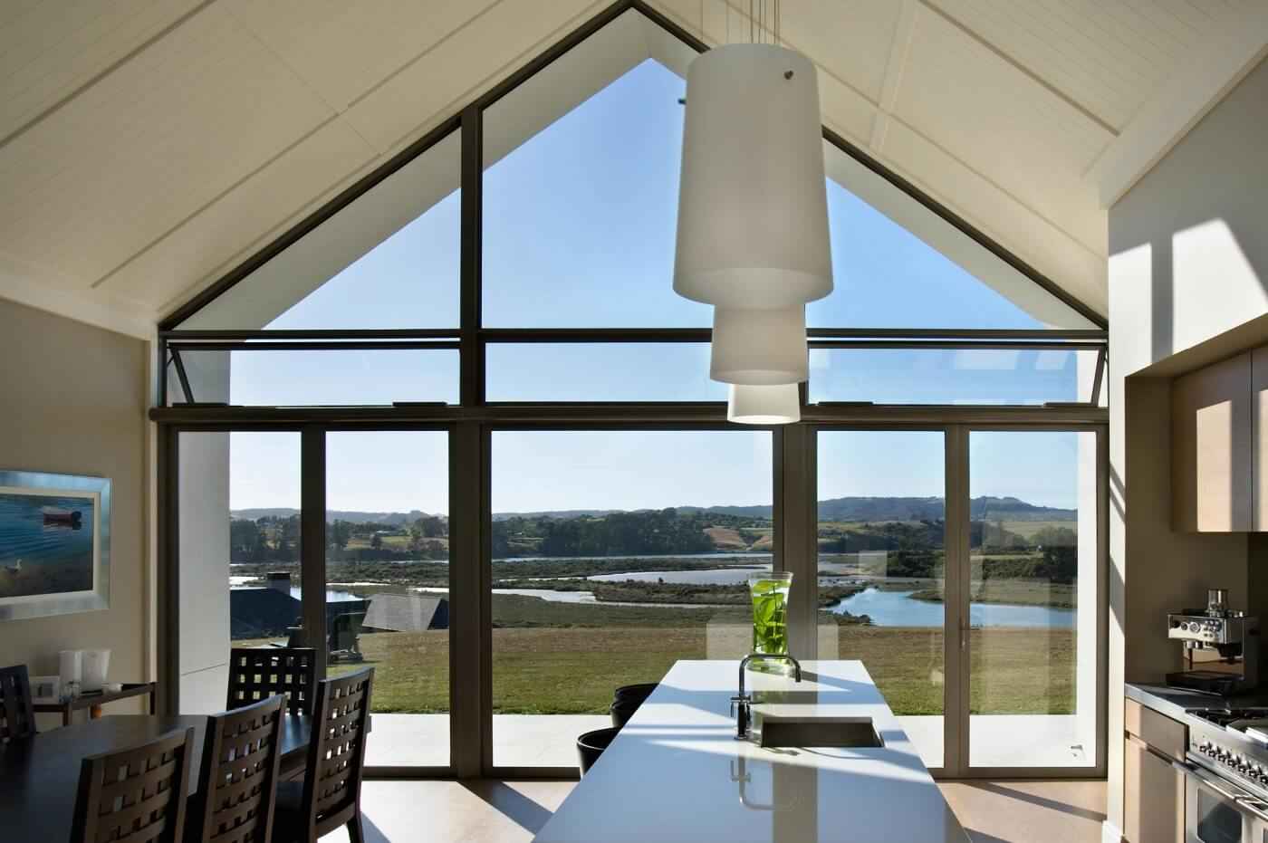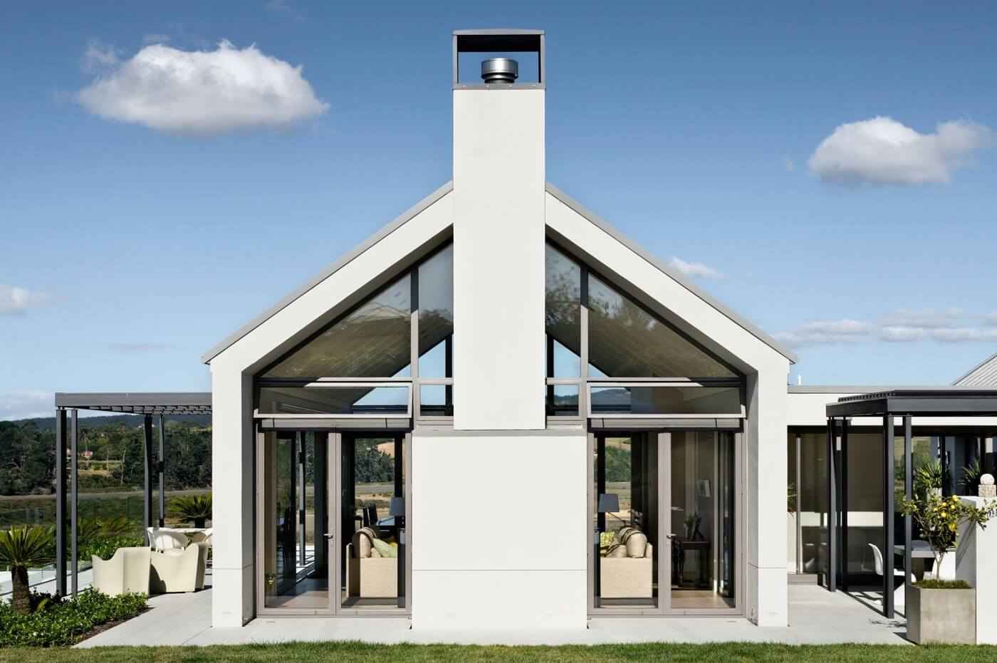 Dom Whitford został zaprojektowany na malowniczej, wiejskiej działce o powierzchni 2 hektarów na Wyspie Północnej w Nowej Zelandii. Z tego miejsca rozciąga się zapierający dech w piersiach widok na rozlewisko rzeki przepływającej przez rezerwat przyrody Mangemangeroa. Architekci z pracowni Sumich Chaplin Architects doskonale wykorzystali potencjał tej wyjątkowej lokalizacji, projektując budynek w formie nowoczesnej stodoły. Wykuli w nachylonym terenie platformę, na której powstał zespół połączonych ze sobą pawilonów – wszystkie utrzymane w minimalistycznej formie i rozmieszczone na jednym poziomie. Każdy z nich ma prostą bryłę z dwuspadowym dachem, a pomiędzy nimi znajdują się sekcje z płaskim zadaszeniem, które spajają całość w harmonijną kompozycję.