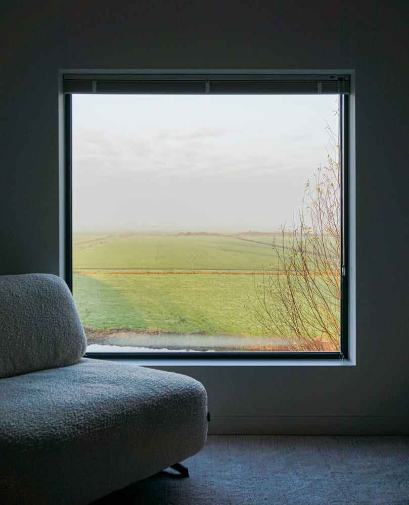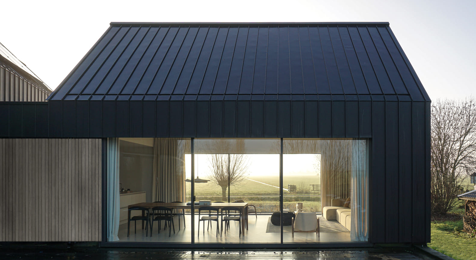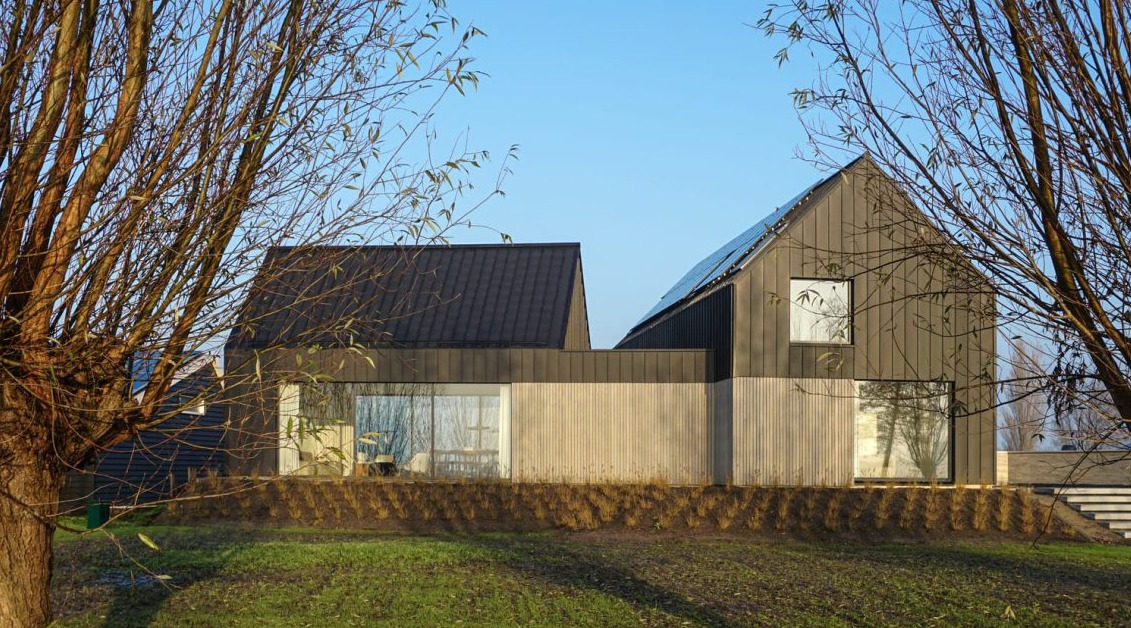 Elewacje i dach wykończono połączeniem cynku i drewna, co nadaje bryle nowoczesny, a zarazem naturalny charakter. Panele cynkowe o szerokości 400 mm zestawiono z drewnianymi deskami o szerokości 90 mm i szczeliną 10 mm. Duże, kwadratowe okna zostały rozmieszczone tak, aby kadrowały widoki pól i wiejskiego krajobrazu, wprowadzając światło do wnętrz i podkreślając związek domu z naturą.
