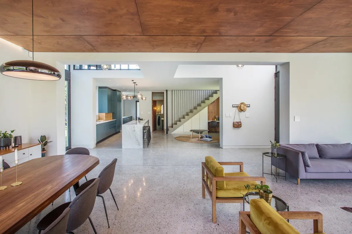 Dom wyróżnia się prostą, geometryczną formą i naturalnymi materiałami. Główne wejście prowadzi przez imponujące drewniane drzwi do przestrzeni o podwójnej wysokości, w której betonowy strop oddziela dwie nachylone połacie dachowe. Z jednej strony wejście łączy się z kuchnią i strefą dzienną, z drugiej – oddziela strefę nocną z sypialniami. Na parterze zastosowano białe tynkowane ściany, które podkreślają otwartość i gościnność przestrzeni. Piętro z kolei zostało wykończone czarnym drewnem, co nie tylko kontrastuje wizualnie, ale także akcentuje strefę prywatną z sypialniami i pokojem rodzinnym, z którego roztacza się zapierający dech widok na otaczające góry.