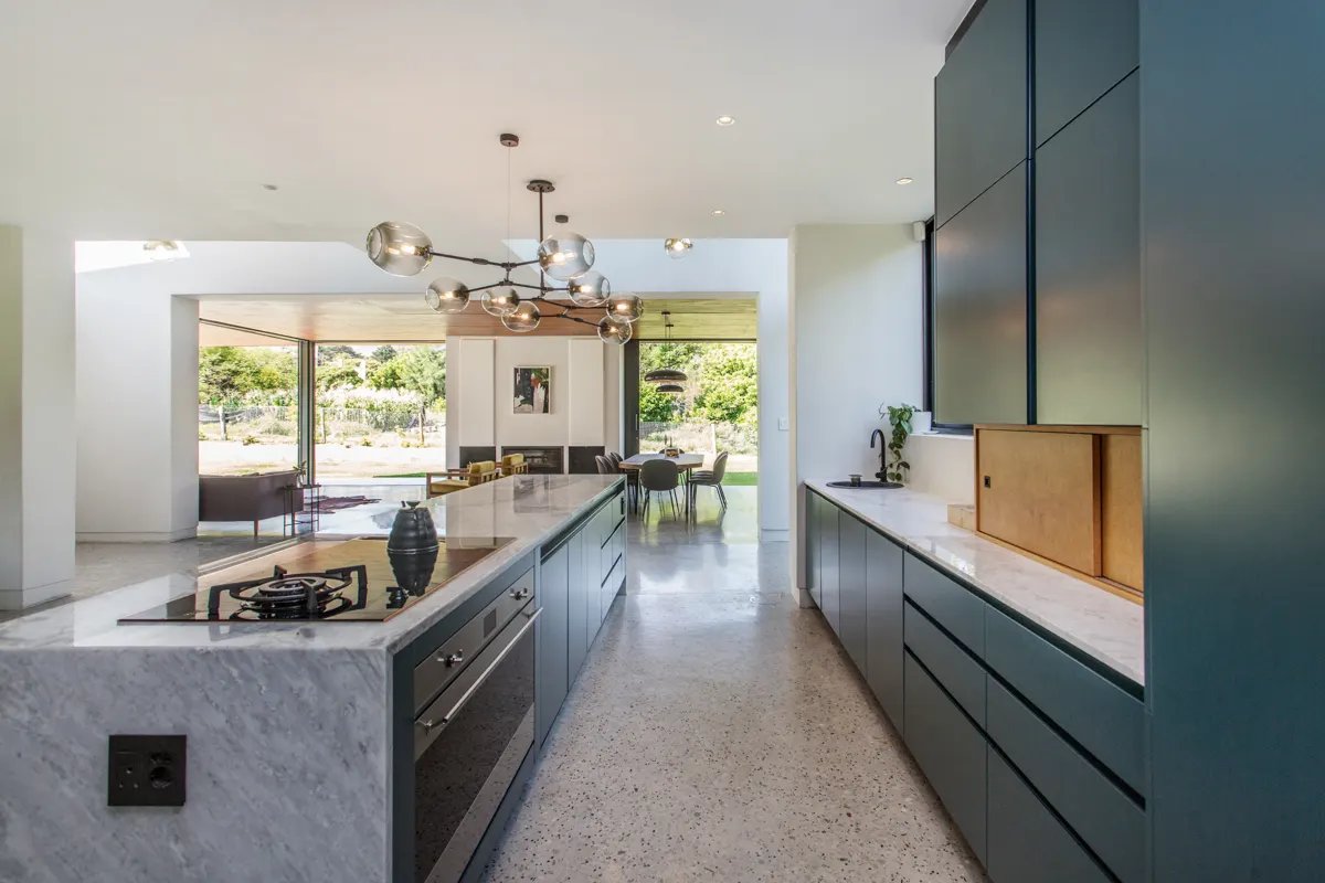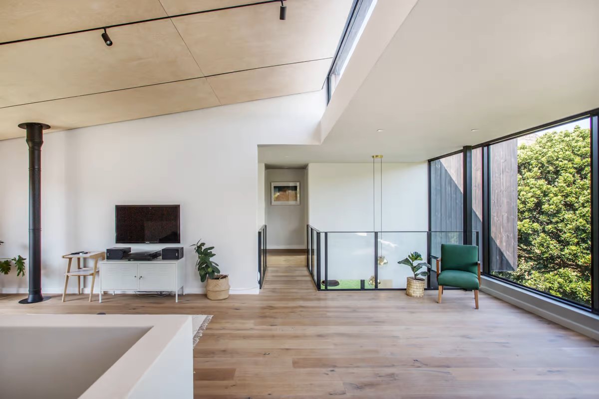 Zachodnia granica działki została przeznaczona na garaż, zmywarkę oraz plac manewrowy, co umożliwiło otwarcie planu domu na północ i wschód. Szczególnie ważny jest północno-wschodni narożnik, gdzie przestrzeń dzienna otwiera się przez szklane drzwi przesuwne na zewnętrzny taras. Nad nim góruje główna sypialnia, której szczytowa elewacja nawiązuje do klasycznej formy stodoły, nadając budynkowi charakterystyczny wygląd.