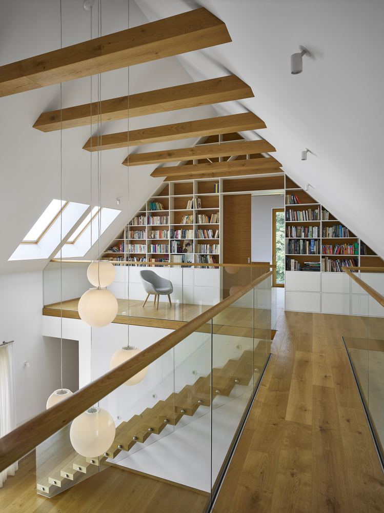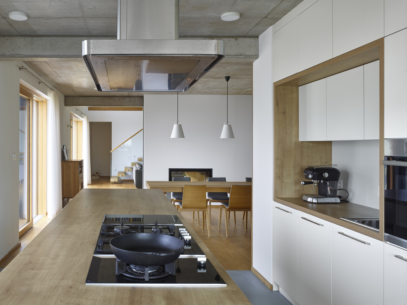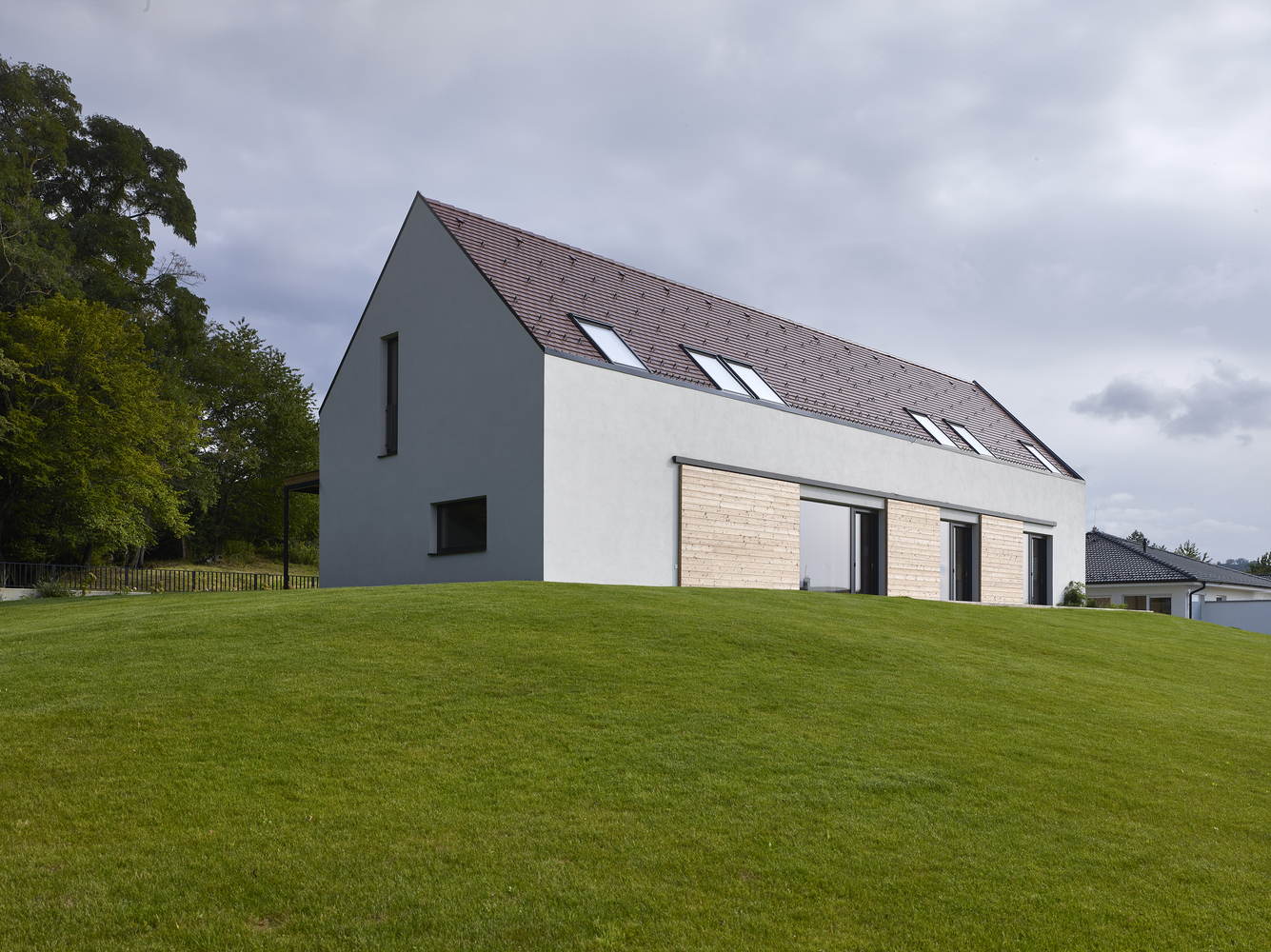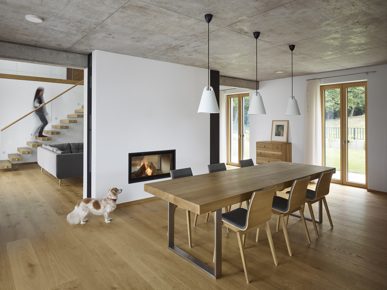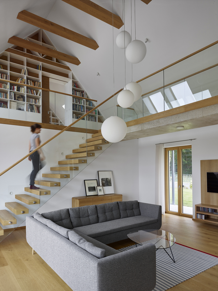 Architekci projektu postawili na naturalne materiały, które od wieków stanowią fundament tradycyjnej słowackiej architektury. Zewnętrzna część domu, w tym biały tynk na nowoczesnej stodole, harmonizuje z czerwono-brązowym gontem dachu, a naturalne drewno na fasadzie garażu pięknie starzeje się z upływem lat. Wnętrza domu utrzymane są w naturalnych barwach, gdzie drewno dębowe doskonale komponuje się z surowym betonem na suficie i wyszukanymi, nowoczesnymi meblami. Całość stanowi spójną kompozycję tradycji, nowoczesności i przestronności, spełniając oczekiwania współczesnych właścicieli w zgodzie z naturą.