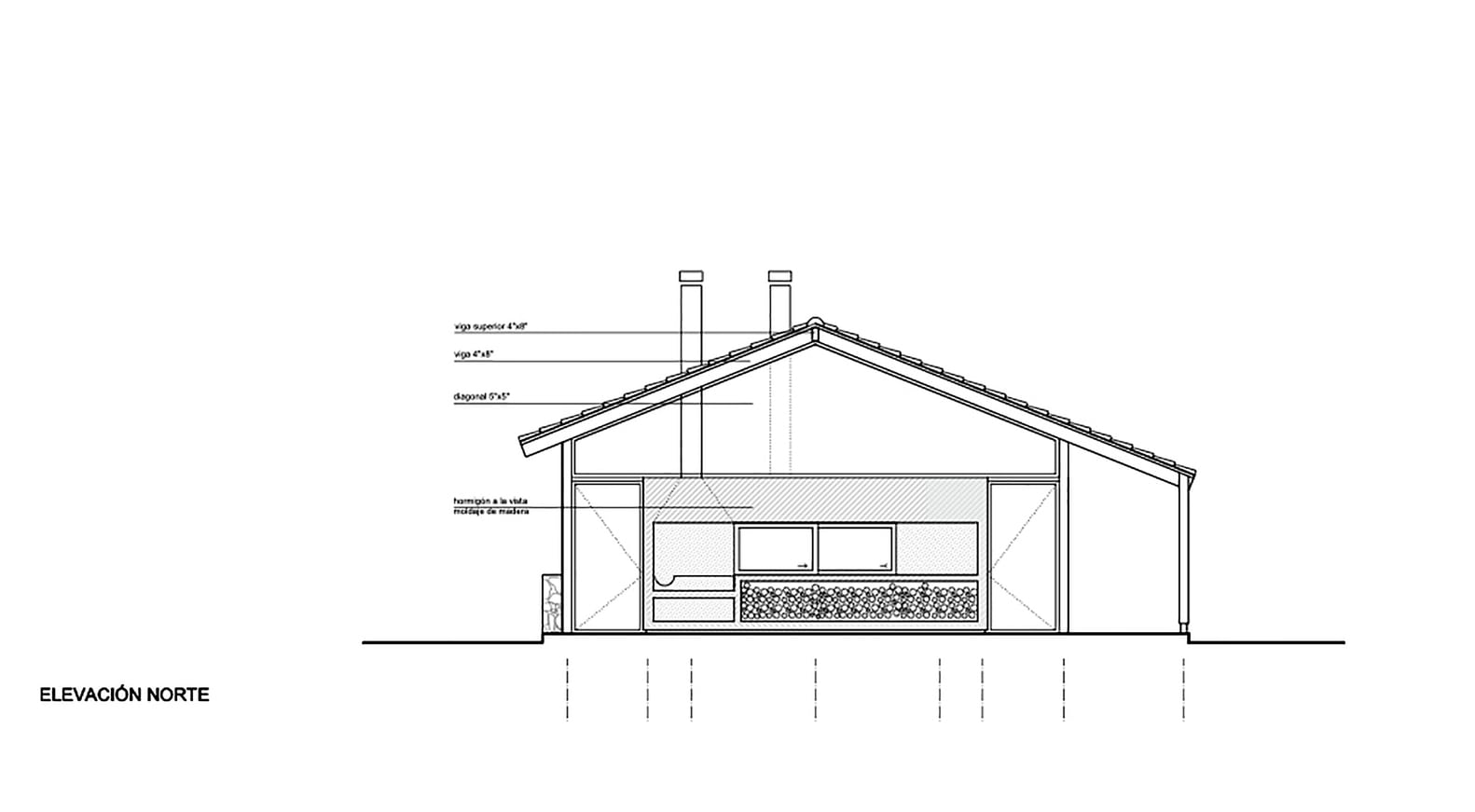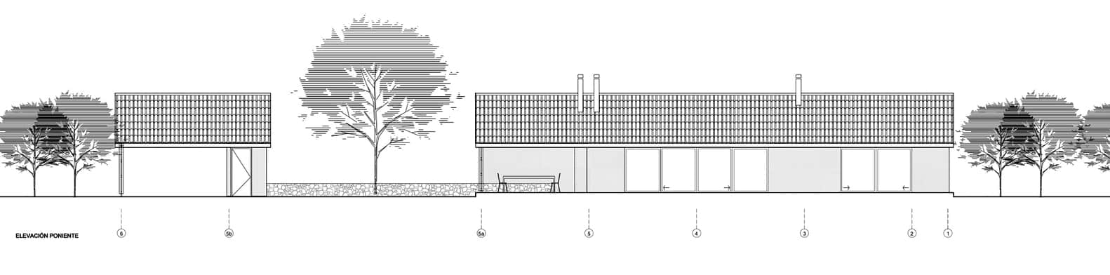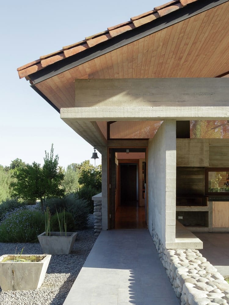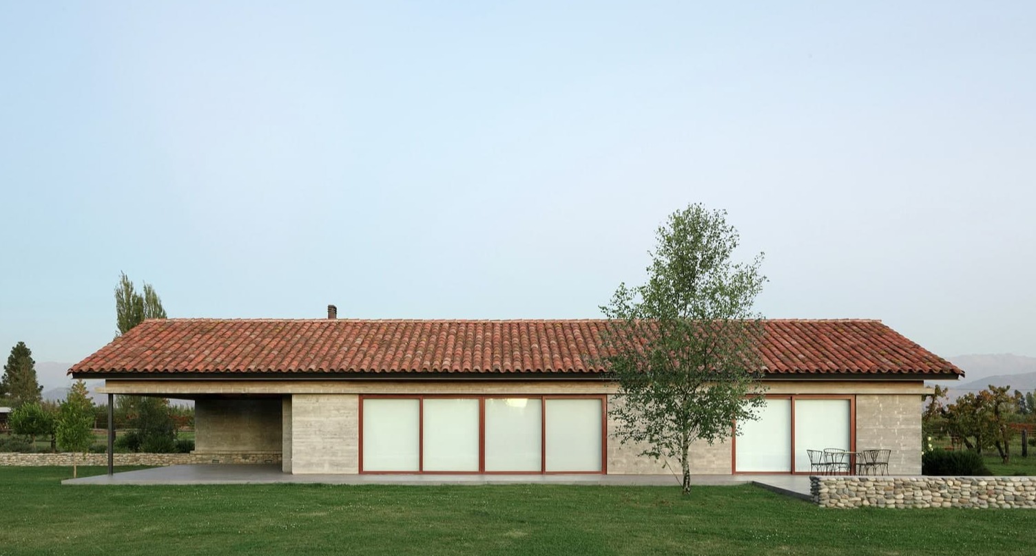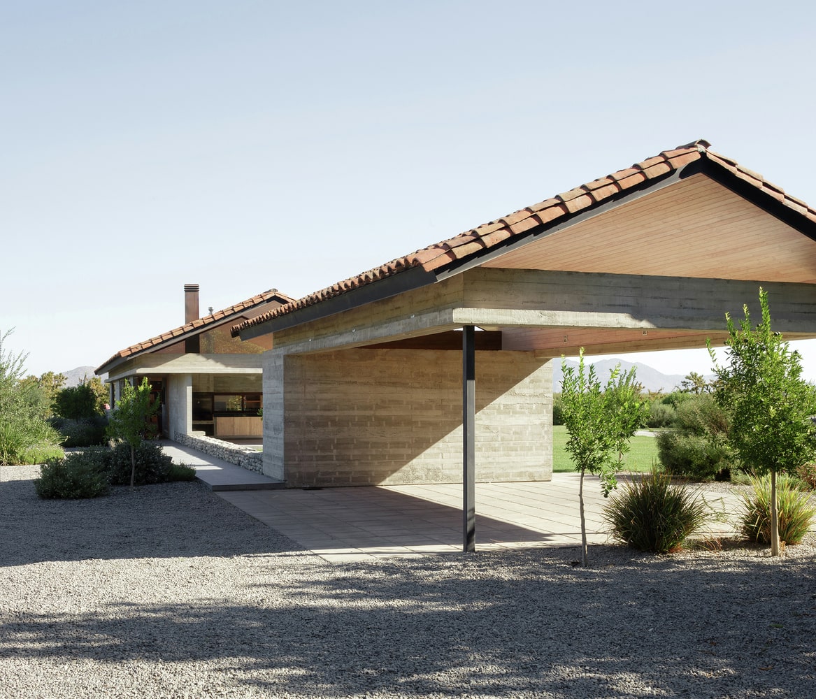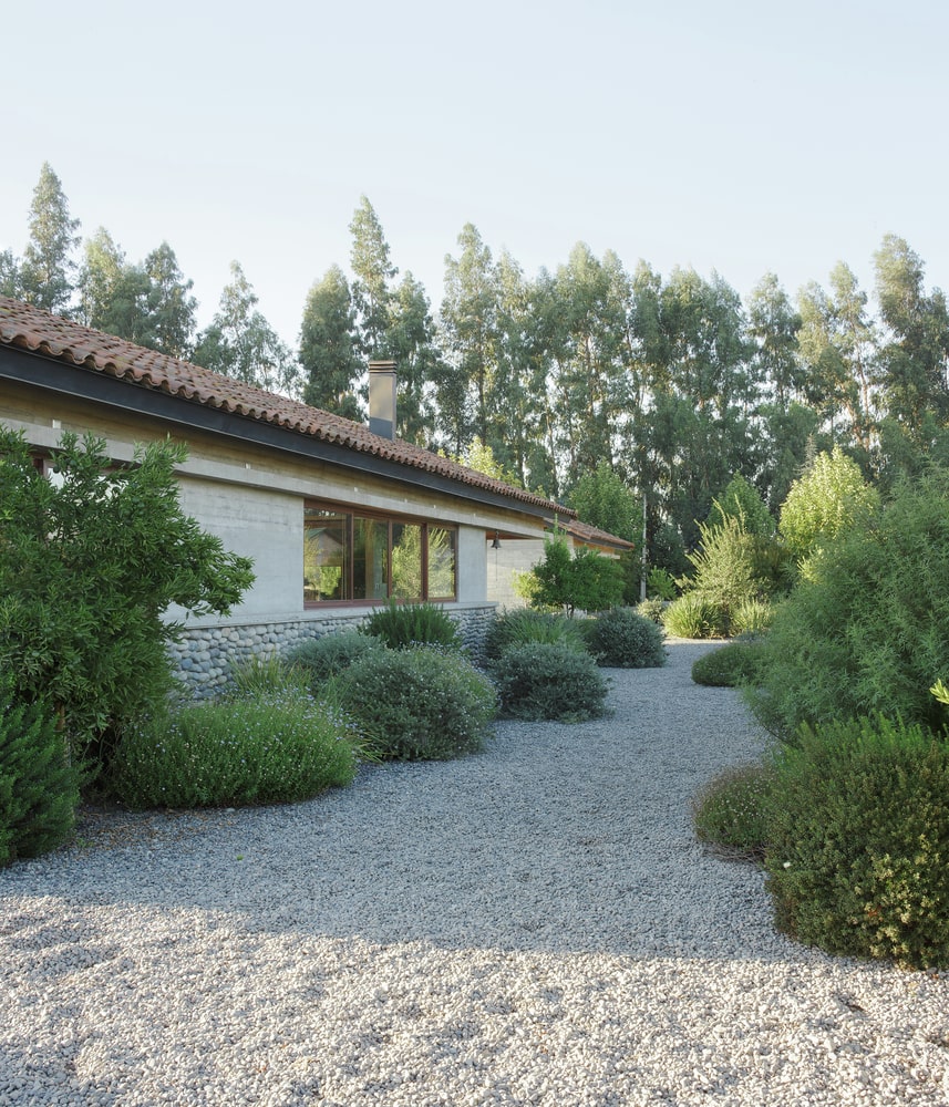 Bryła została starannie wkomponowana w istniejący krajobraz rolniczy, a układ budynku dostosowano do linii sadzenia drzew brzoskwiniowych, co pomaga zachować orientację i rytm miejsca. Zespół architektów zdecydował o zachowaniu istniejących drzew, które stanowią nie tylko naturalny cień i osłonę, ale również element kulturowy i krajobrazowy. Dom posiada wyraźne cechy tradycyjnej architektury chilijskiej, w której najważniejsze są prostota formy, funkcjonalność i silna relacja z otoczeniem.