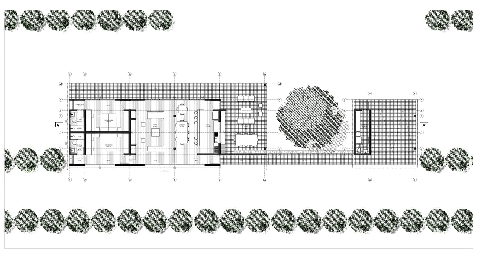 Dom składa się z trzech głównych elementów. Pierwszym są masywne ściany z kamienia i betonu, otwierające wnętrze na widok plantacji. Drugim są cztery żelbetowe moduły, o jednakowym rozmiarze, rozmieszczone zgodnie z przeznaczeniem – tworzą oddzielne strefy funkcjonalne i zapewniają izolację akustyczną oraz termiczną. Trzecim kluczowym elementem jest monolityczny dach, oparty na masywnej belce w kształcie litery L, biegnącej wokół domu. To właśnie ona przenosi ciężar drewnianej więźby dachowej i rozprowadza go na ściany zewnętrzne. Dach wieńczy gliniana dachówka, która pokrywa całą długość budynku aż po garaż, wzmacniając wiejski charakter inwestycji.