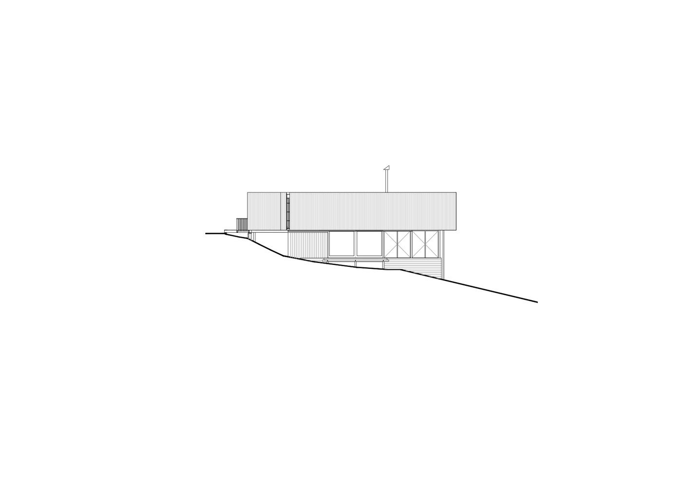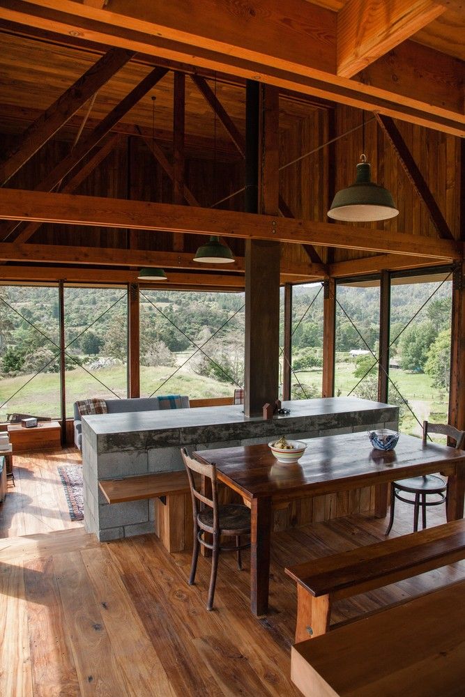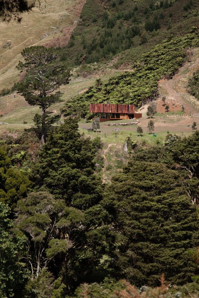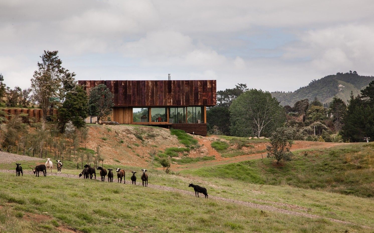Architekci z Herbst Architects odpowiedzieli na te potrzeby, projektując dom w formie prostej, geometrycznej bryły, która doskonale wpisuje się w malowniczy krajobraz Nowej Zelandii. Budynek umieszczono na grzbiecie wzgórza, unosząc go nad ziemią na opadającym zboczu, co podkreśla widowiskowy charakter projektu. Elewację wykonano z pokrytej rdzą blachy falistej, inspirowanej tradycyjnymi wiejskimi szopami z okolicy. Dzięki temu dom staje się częścią krajobrazu, a jednocześnie wyróżnia się swoją architektoniczną formą.
