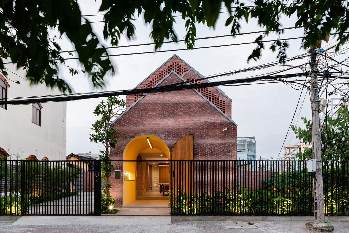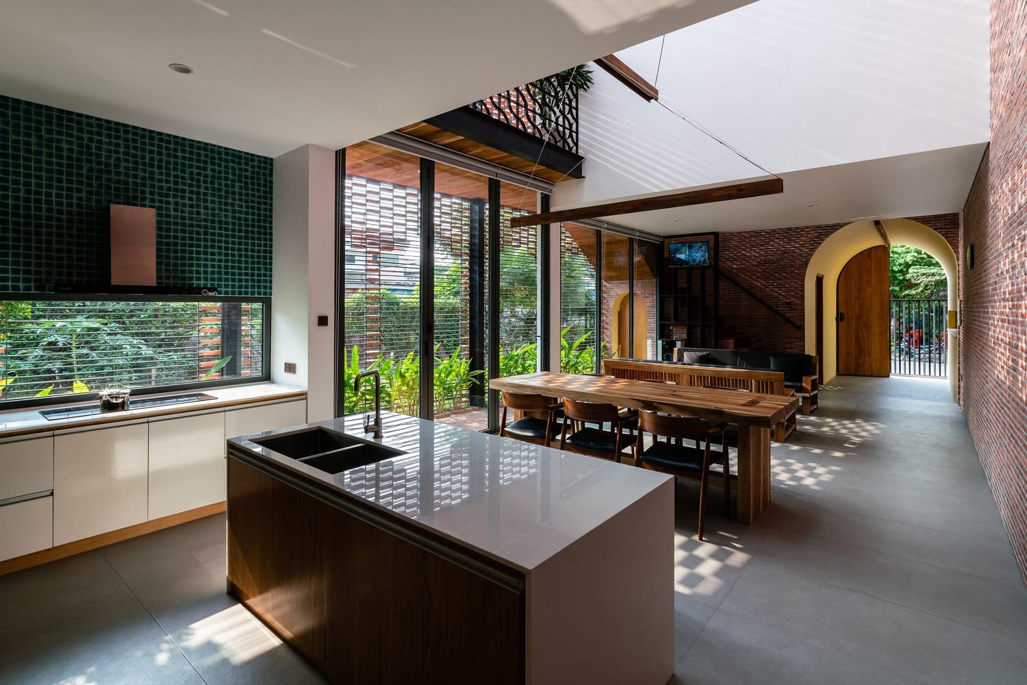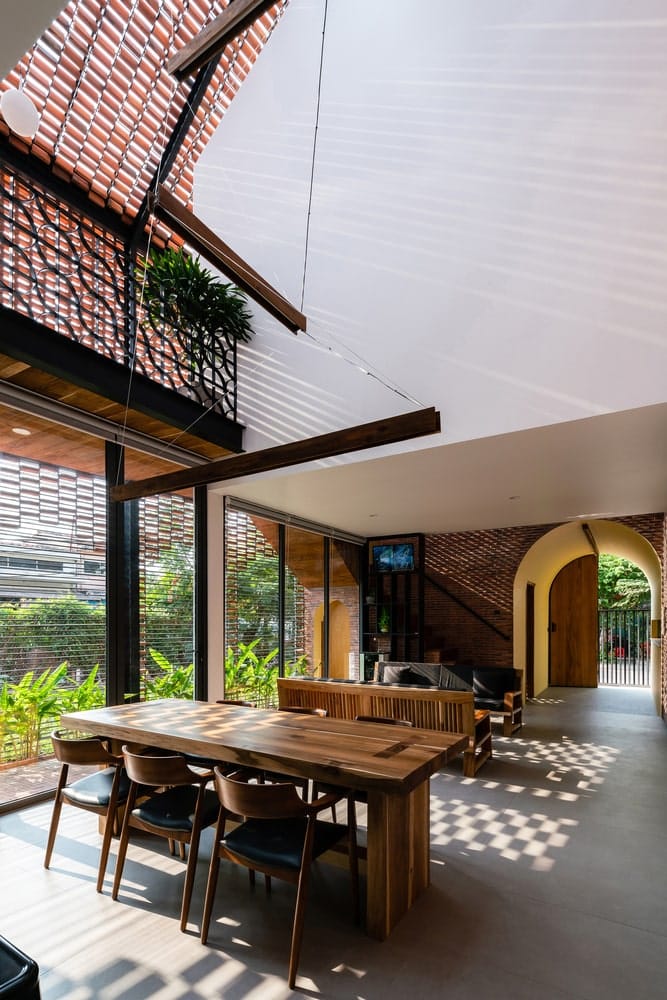 Zewnętrzną formę budynku definiuje ceglana elewacja, która nie tylko nadaje obiektowi unikalny wygląd, ale też spełnia funkcje praktyczne – chroni wnętrze przed słońcem i pozwala na naturalną wentylację. Wewnątrz dom zorganizowano według układu inspirowanego tradycyjnymi, wiejskimi domami w Wietnamie – z centralnym salonem i sypialniami po bokach. Otwarte przestrzenie, werandy, puste bufory i naturalna cyrkulacja powietrza gwarantują komfortowy mikroklimat bez konieczności intensywnego chłodzenia. Układ wnętrz wspiera nie tylko wygodę mieszkańców, ale także zachowuje rodzinny charakter domu, zapewniając zarówno prywatność, jak i przestrzenie wspólne.