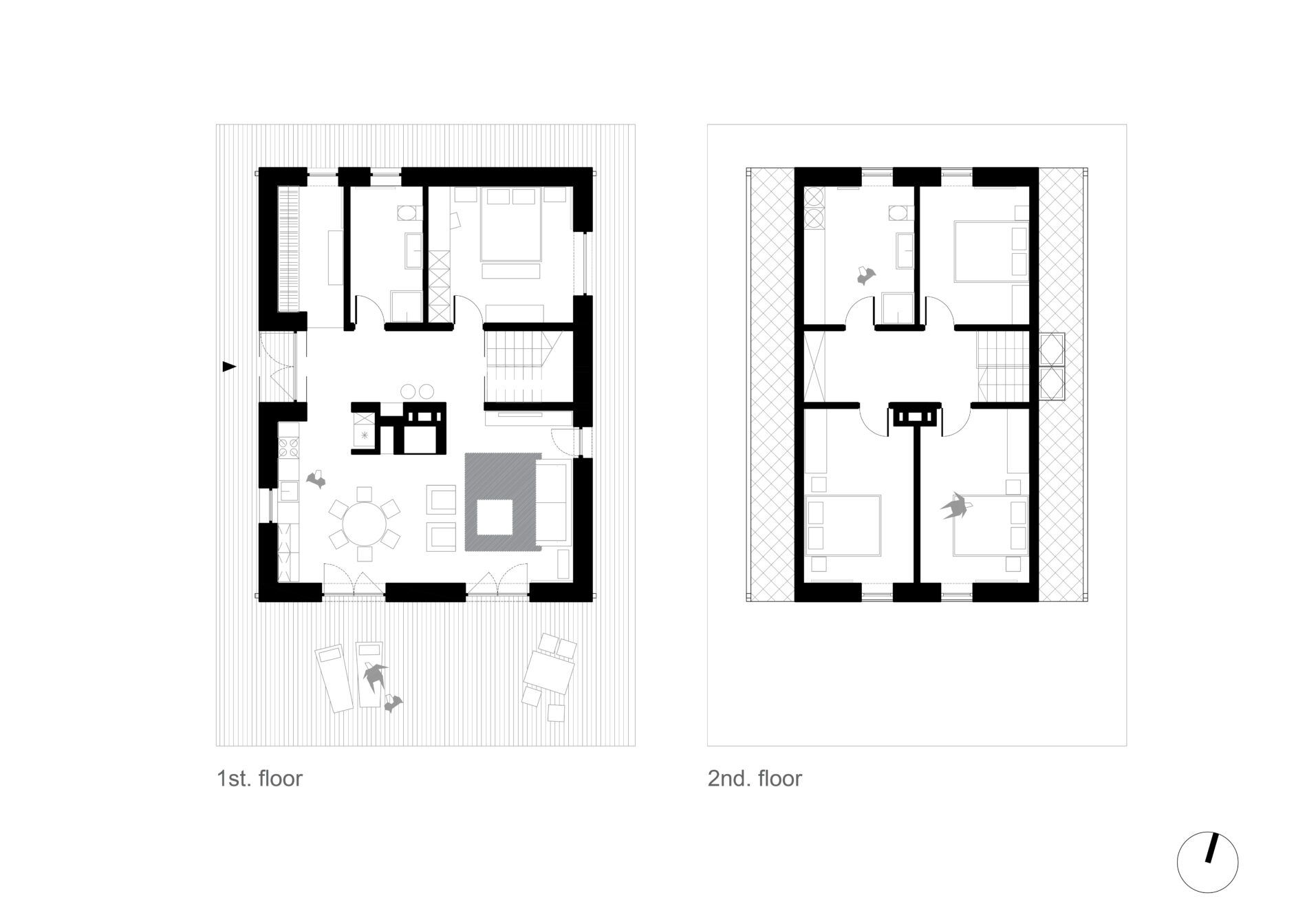 Dom został zaprojektowany tak, by wygodnie mieściła się w nim czteroosobowa rodzina oraz goście, którzy pojawiają się tu okazjonalnie. Wewnątrz parter łączy salon i jadalnię, które stają się częścią zewnętrznego tarasu, kiedy otwarte zostaną duże, szklane drzwi. Duże palenisko umieszczone jest w centrum domu, a otaczająca go ściana oddziela sypialnię, łazienkę i garderobę. Na piętrze urządzono dodatkowe trzy sypialnie oraz łazienkę. Drewniane podłogi oraz białe, tynkowane ściany podkreślają prostotę projektu.