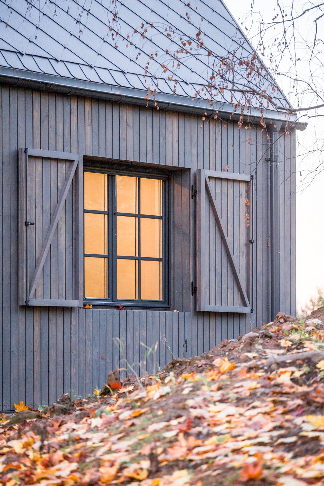 Projekt domu charakteryzują stroma, dwuspadowa forma dachu oraz rodzime detale, przy czym drewniane okiennice po zamknięciu stają się spójną częścią elewacji, nie zakłócając bryły budynku.
