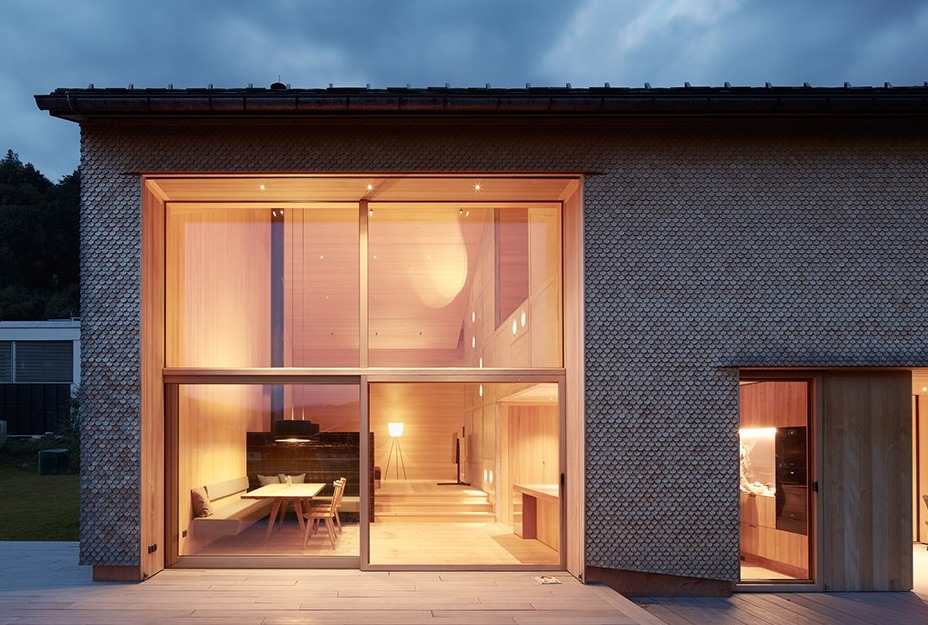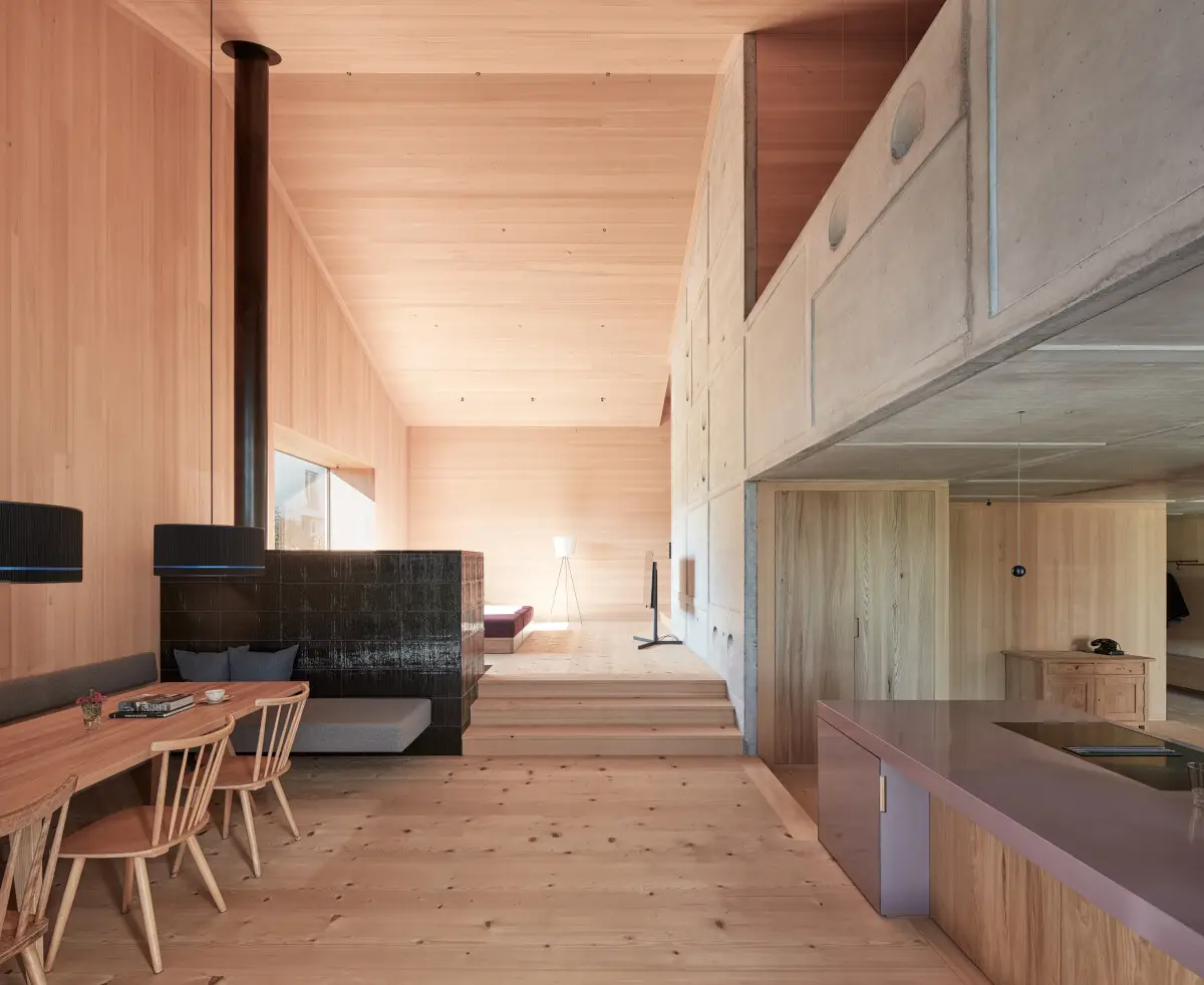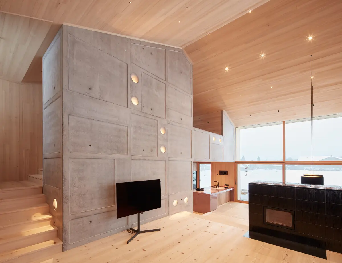 Dom cechuje się surowością i naturalnością materiałów – lite deski z jodły, beton, meble z wiązu i filc tworzą wyraziste, zmysłowe wnętrza. Architekturę wyróżnia zrównoważony styl życia, regionalna jakość i nowoczesna interpretacja wiejskiego domu.