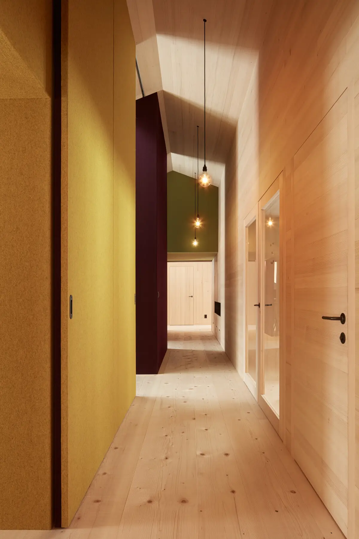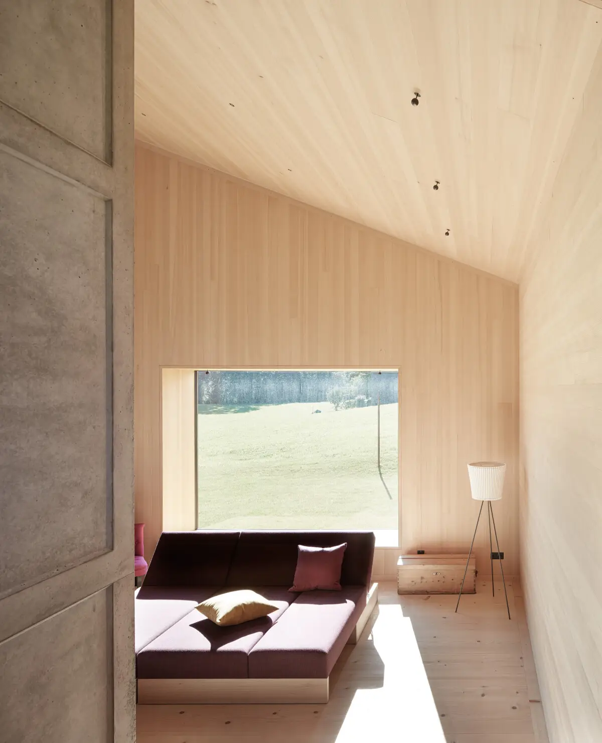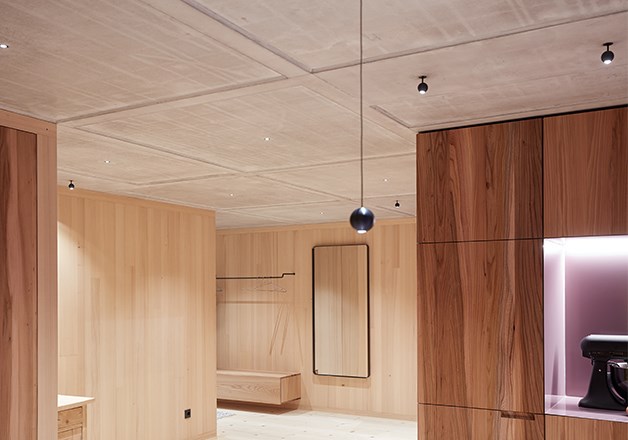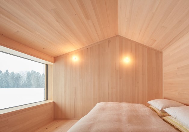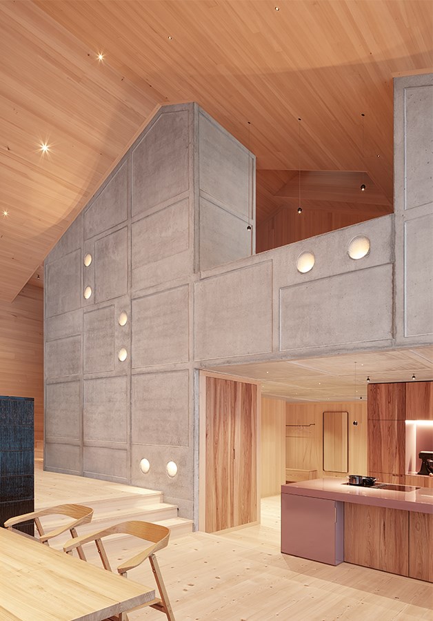Na dwóch piętrach rozwija się otwarty krajobraz życiowy: jedzenie, praca, odpoczynek. Zróżnicowanie poziomów, kominek, zmienne wysokości sufitów i betonowy rdzeń organizują przestrzeń i tworzą widoki na otaczającą naturę. Na piętrze znajduje się elastyczna przestrzeń dziecięca z modułowymi boksami, które można dzielić i zamykać przesuwanymi drzwiami.