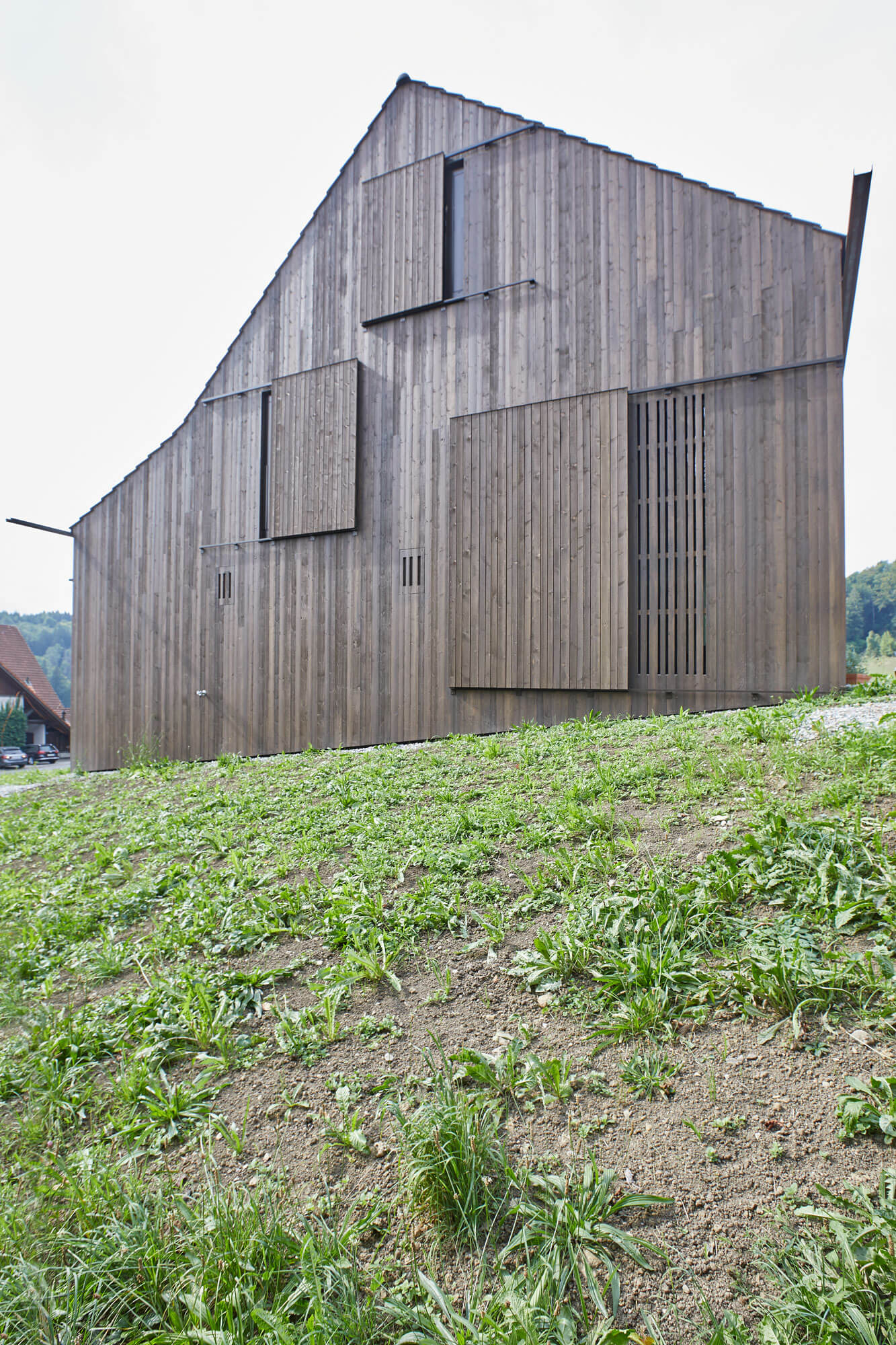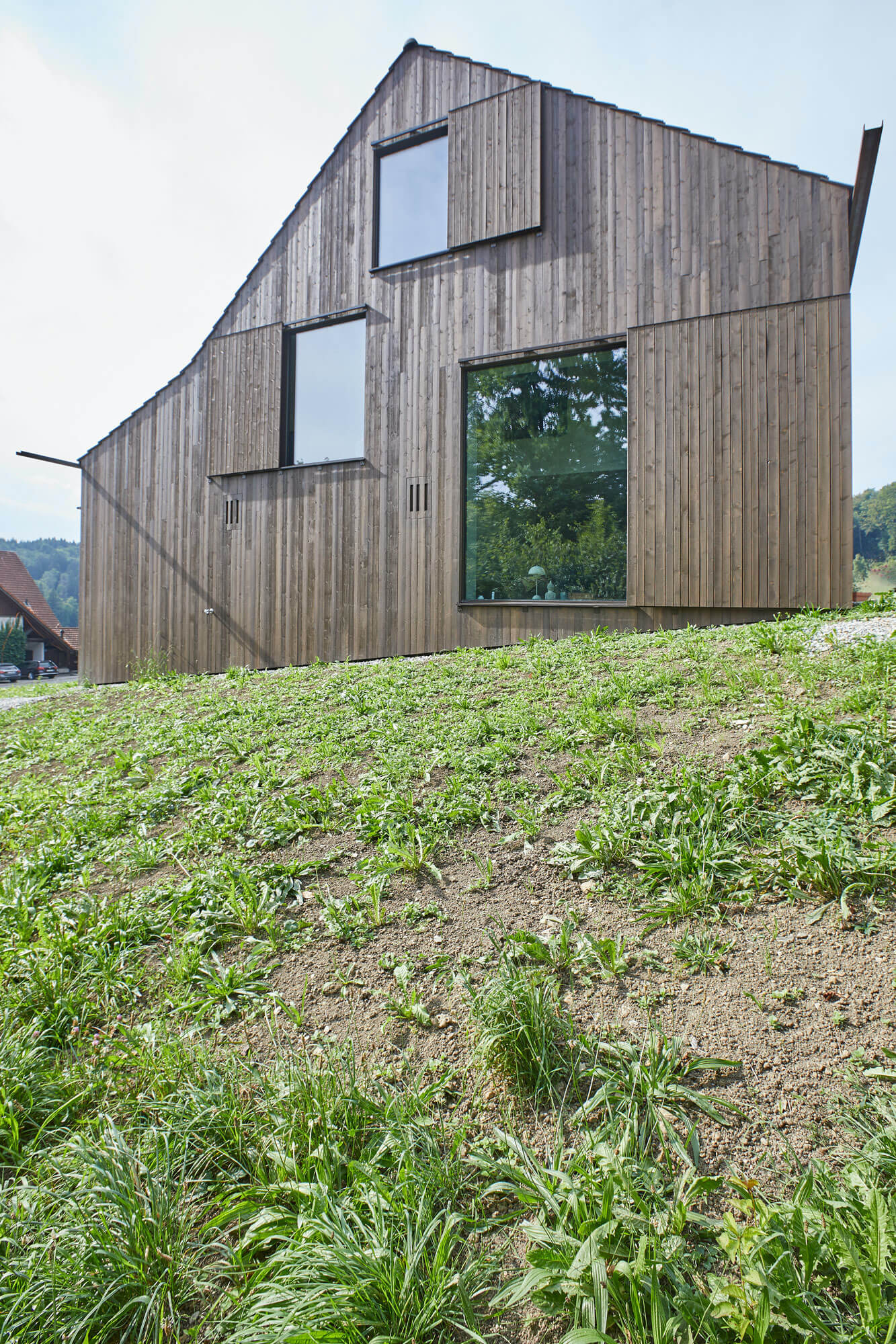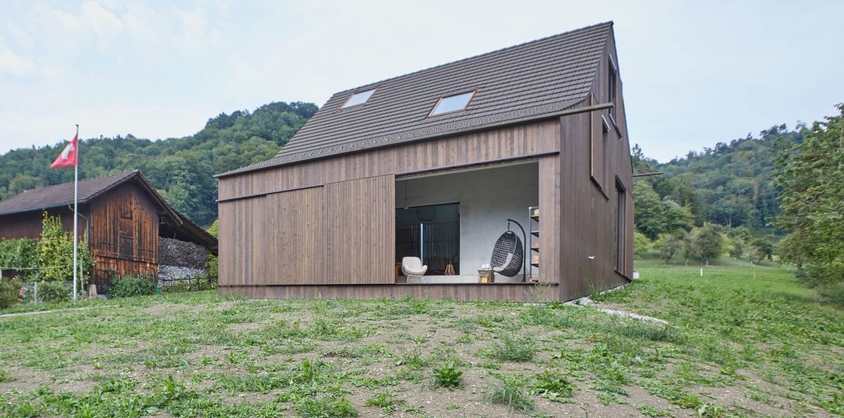 Reppischtal to wiejska, rolnicza wioska składająca się z 15 budynków. Nowy dom łączy w sobie elementy klasycznej stodoły i nowoczesnej architektury, co pozwala budynkowi płynnie wtopić się w wiejski krajobraz. Zewnętrzna fasada budynku jest pokryta przeszkleniami i okładziną z drewna świerkowego, co nawiązuje do drewna wykorzystywanego w tradycyjnych szwajcarskich stodołach. Dwuspadowy dach z lokalnej dachówki dodatkowo podkreśla związki z historyczną architekturą. Okna ukryte za drewnianymi okiennicami zachowują dyskretny wygląd, a duże stałe przeszklenia, chronione drewnianymi przesuwanymi drzwiami, zapewniają prywatność i ochronę przed słońcem. Surowa stalowa belka, pełniąca funkcję rynny wystającej poza dach, podkreśla minimalistyczny charakter budynku. Woda deszczowa spływa kaskadą wzdłuż bocznej elewacji, tworząc wrażenie wodospadu.