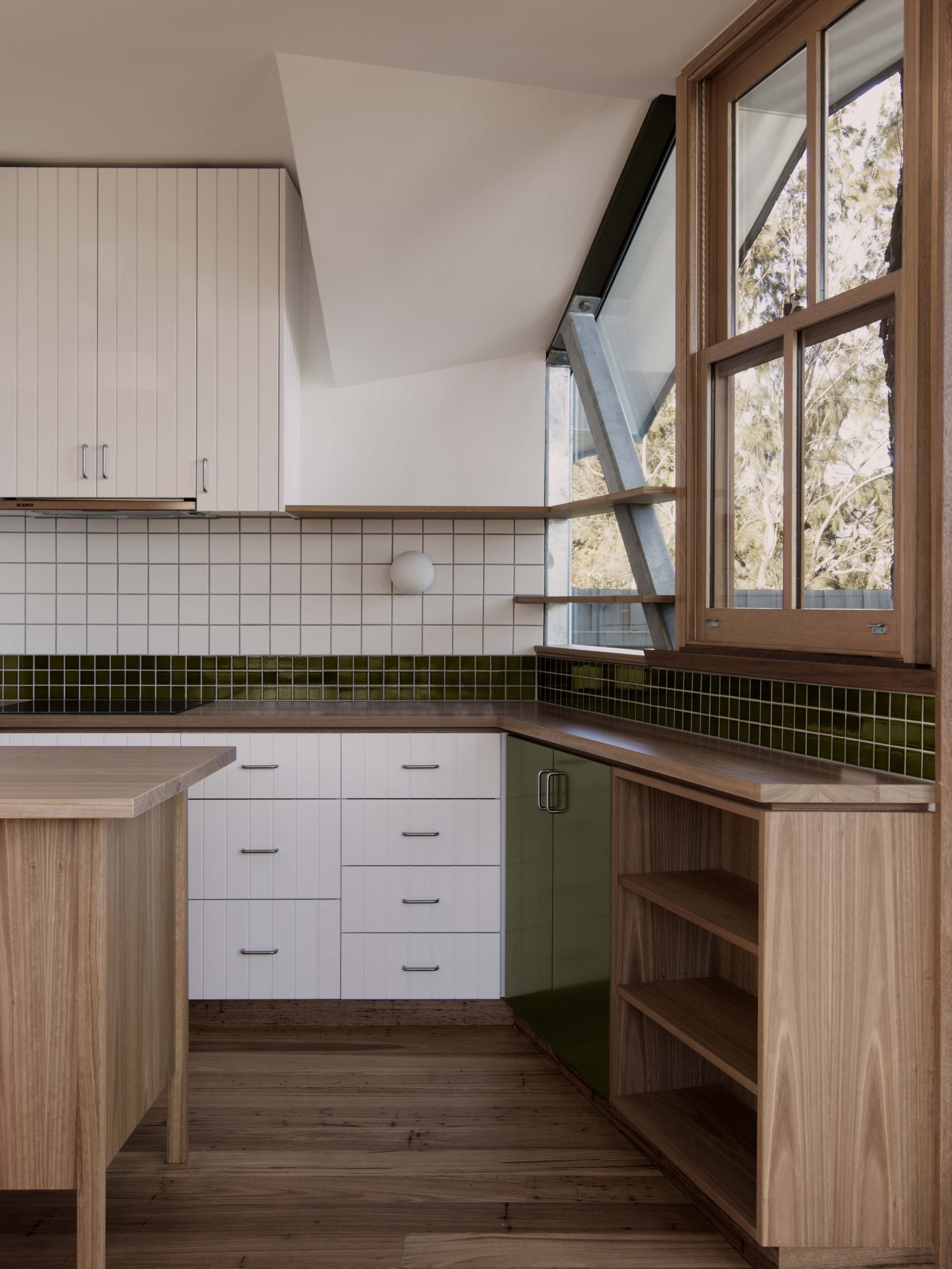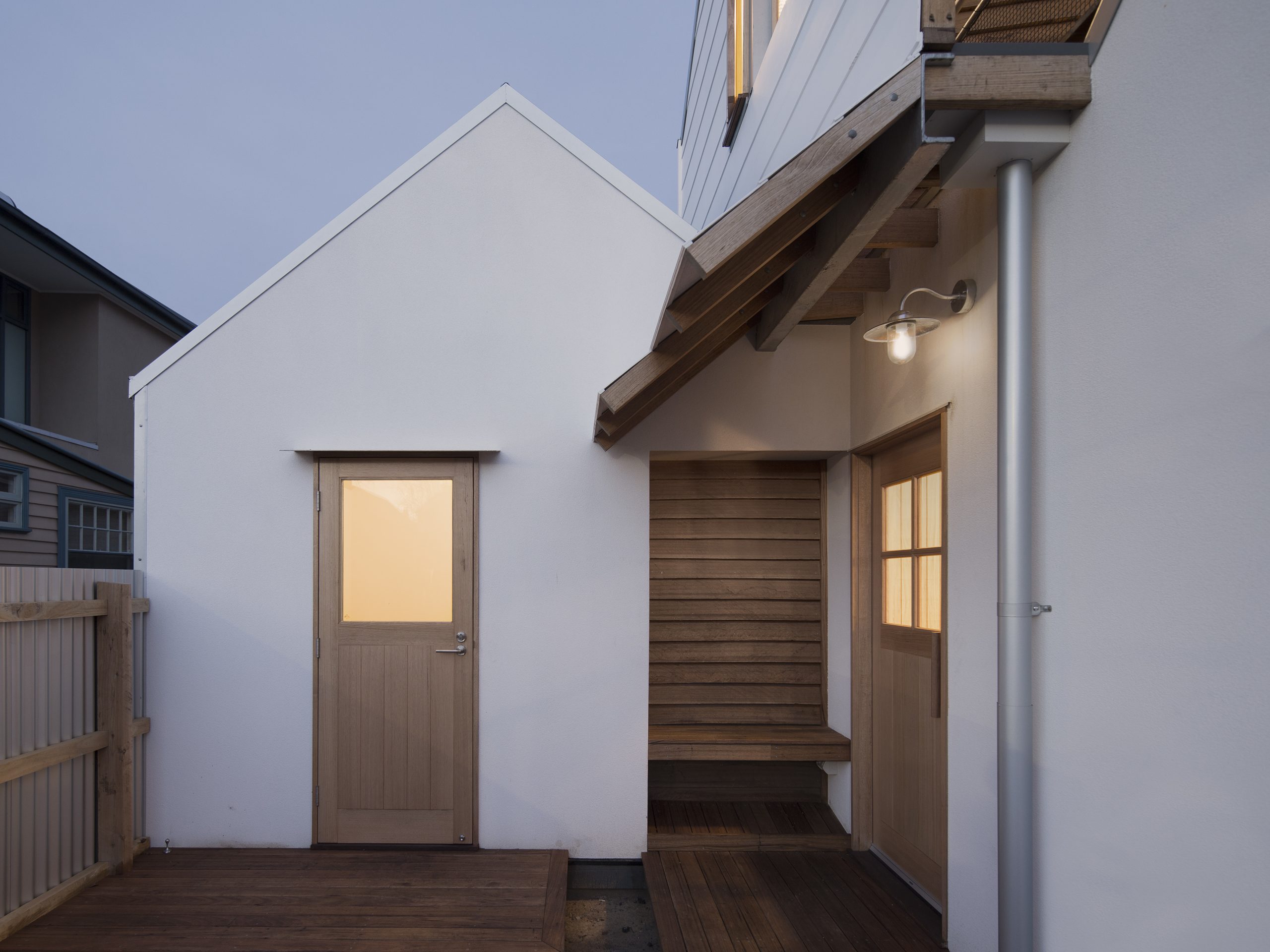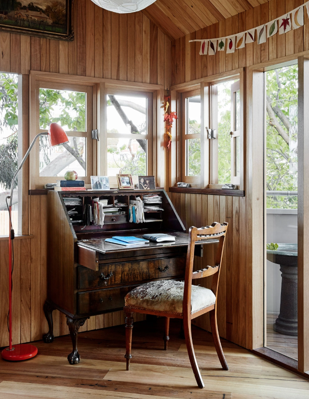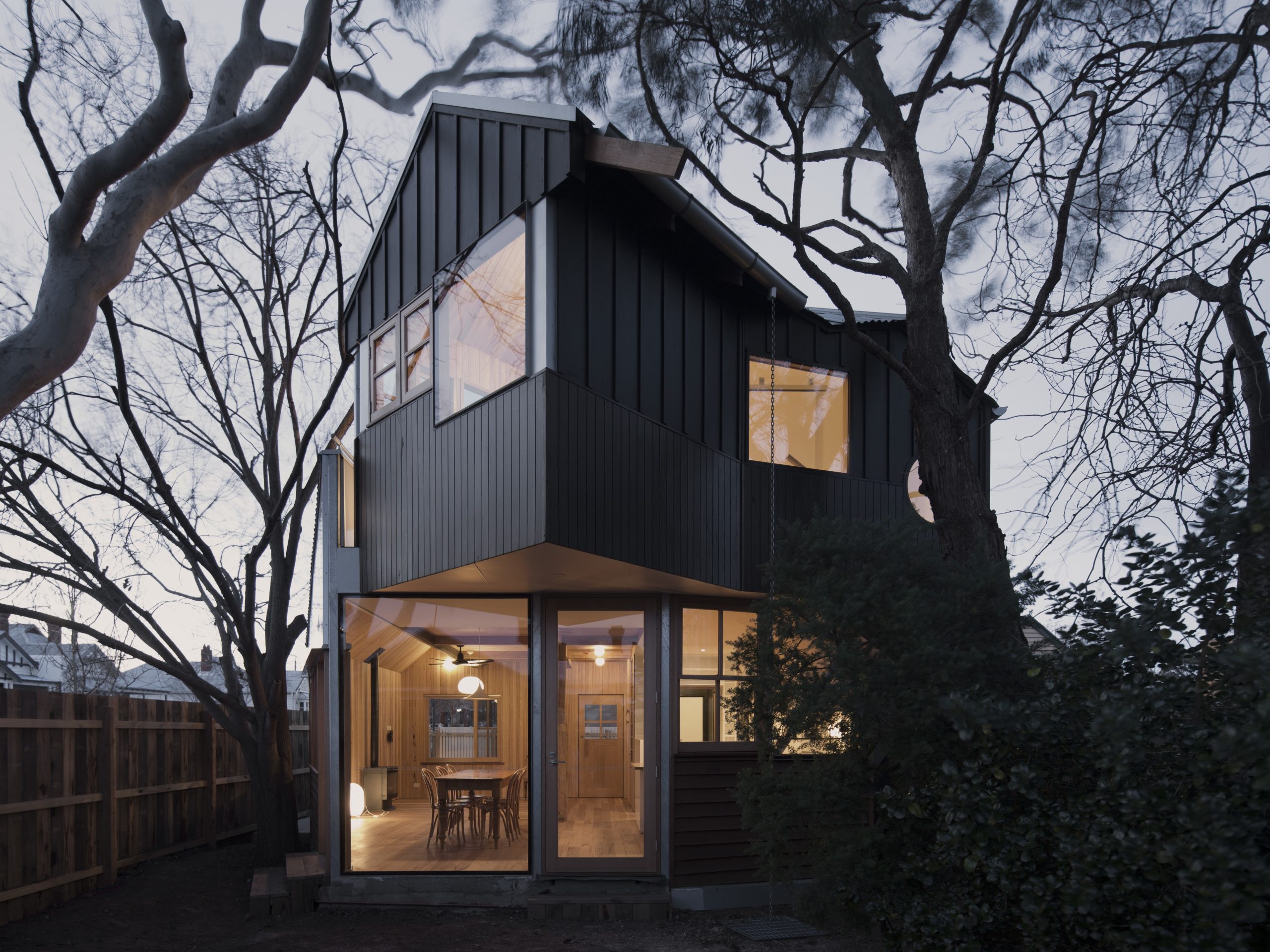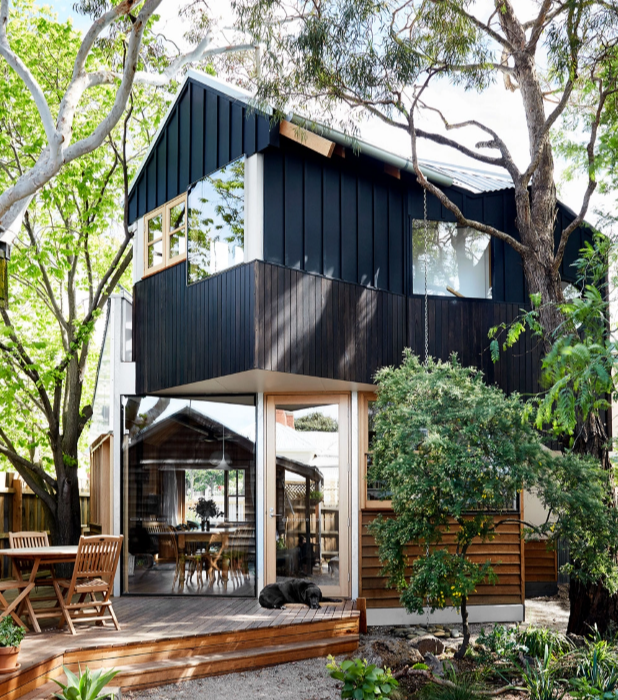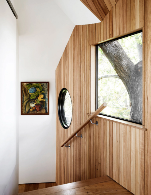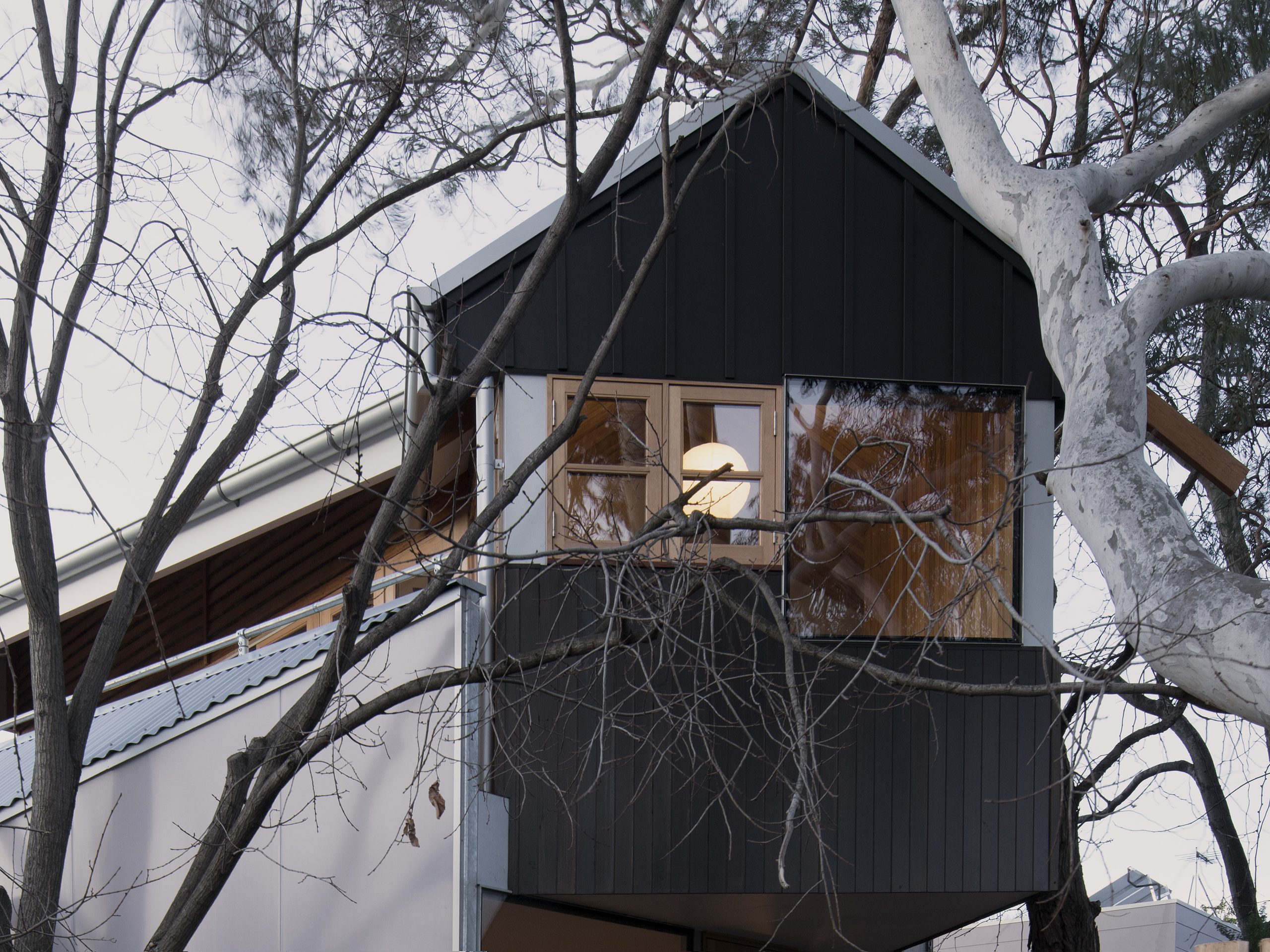 Fleur Glenn od ponad 30 lat mieszka w Clifton Hill w Melbourne. W 2016 roku zdecydowała się podzielić działkę i stworzyć swój wymarzony dom, inspirowany domkiem na drzewie. Projekt powierzono architektowi Murrayowi Barkerowi, który podjął się wyzwania stworzenia kompaktowego, ale elastycznego domu jednorodzinnego. Powstała bryła harmonijnie łączy minimalistyczną architekturę z otaczającymi ją eukaliptusami i miejskim kontekstem, tworząc prywatną, a jednocześnie otwartą przestrzeń do życia.
