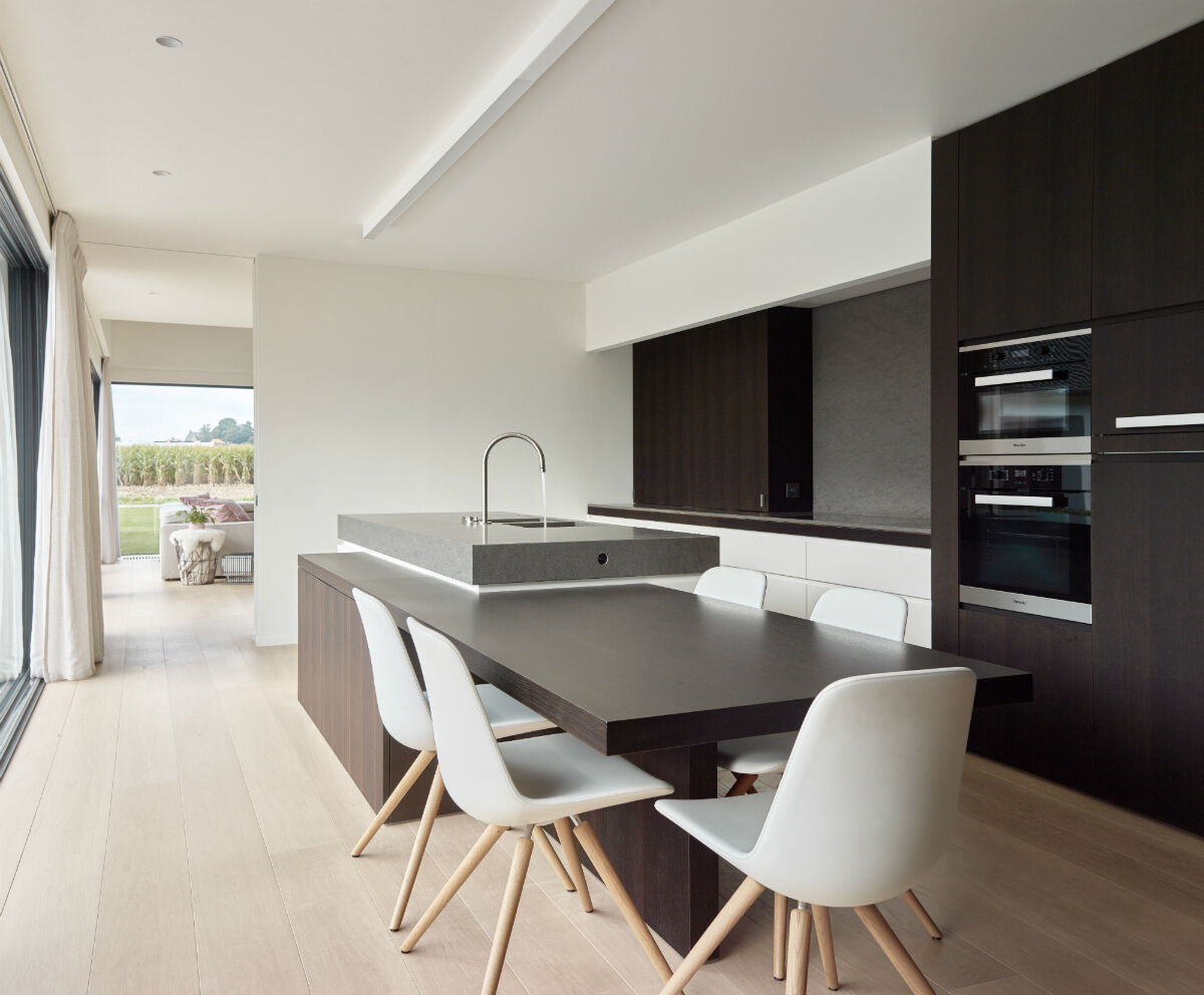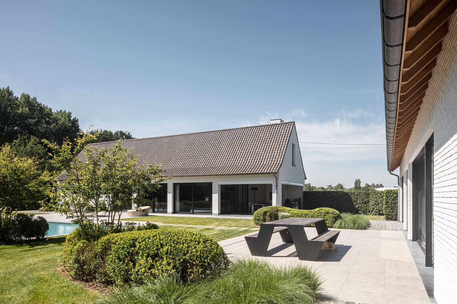 Powstały dwie wydłużone, parterowe konstrukcje z dwuspadowymi dachami, ustawione prostopadle względem siebie, a w głębi ogrodu zaplanowano trzecią, niezależną bryłę o niższym profilu. Ich minimalistyczna forma – białe elewacje z ciemnoszarymi dachami – tworzy spójną kompozycję, subtelnie wpisującą się w krajobraz. Co istotne, łączna kubatura nowych budynków jest mniejsza niż pierwotnych struktur, co dodatkowo wspiera zrównoważone podejście do planowania przestrzeni.
