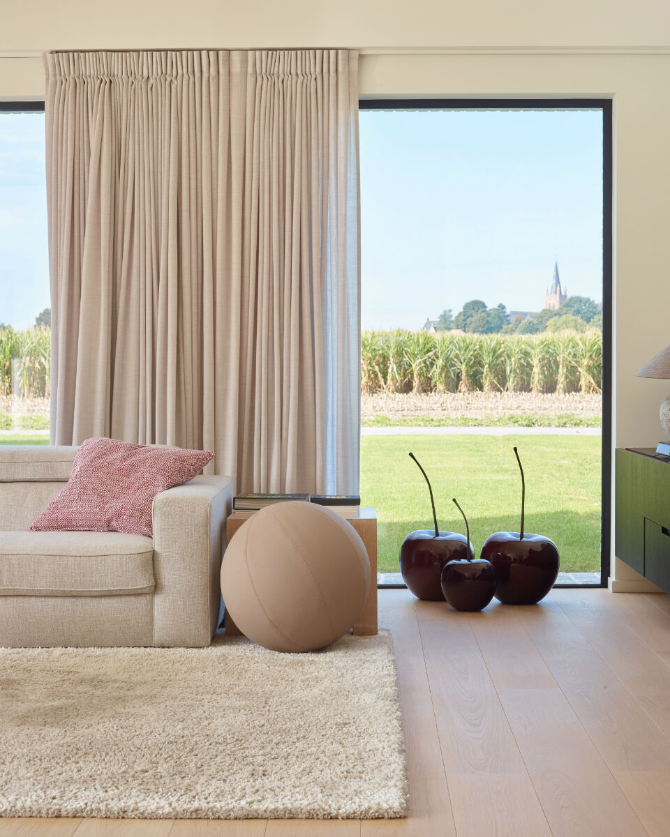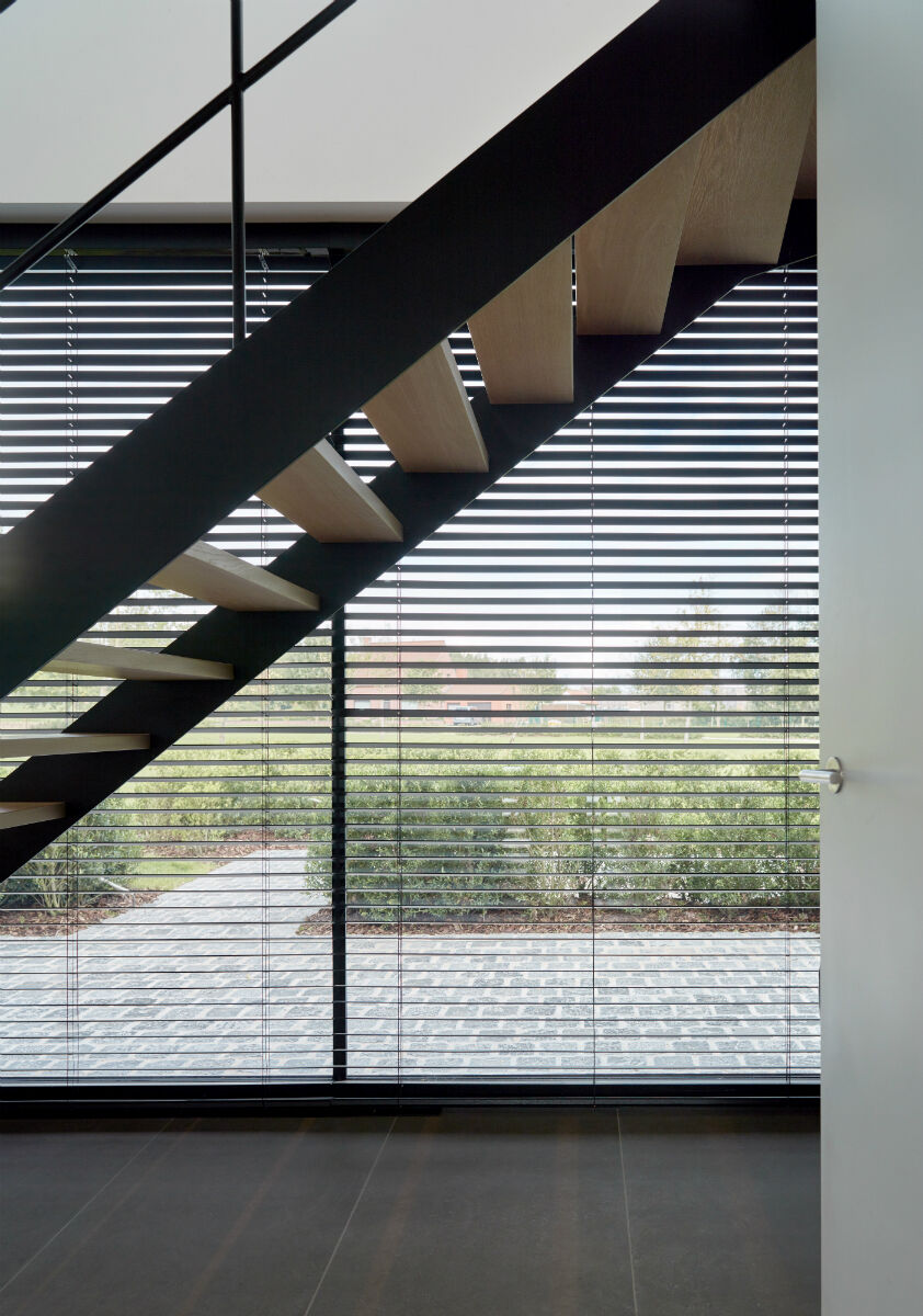 Wnętrza rezydencji zostały zaprojektowane tak, aby zapewniać rozległe widoki na ogród i otoczenie. Duże przeszklenia oraz naturalne światło wzmacniają relację między wnętrzem a zewnętrzem. To połączenie z przyrodą podkreśla również zadaszony taras oraz przylegający basen, które stanowią przedłużenie strefy dziennej i zachęcają do spędzania czasu na świeżym powietrzu.