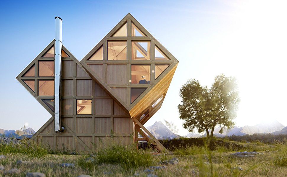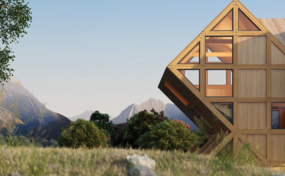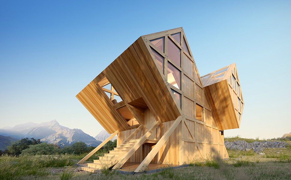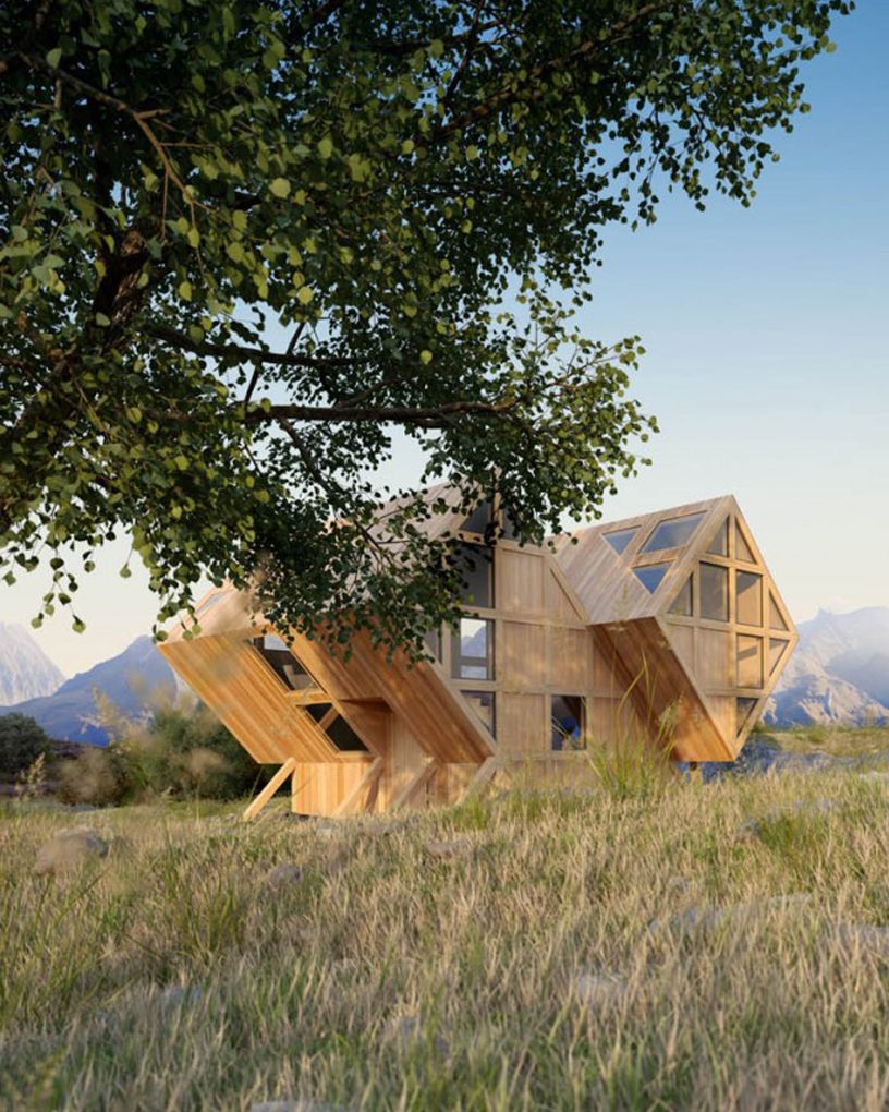 Górne sześciany zostały obrócone o 45 stopni, co wzmacnia wrażenie ruchu i bezpośrednio nawiązuje do górskiej geometrii. Tak zaprojektowana forma tworzy intrygujące przestrzenie zarówno na zewnątrz, jak i we wnętrzu domu. Z głównej bryły wyrasta ukośnie kolejny element konstrukcyjny, podkreślający architektoniczny charakter budynku i nadający mu wyrazistej tożsamości. Widoczne drewniane ramy konstrukcyjne oraz kratownica stanowią integralną część projektu, akcentując rotację bryły i jej silne osadzenie w krajobrazie.