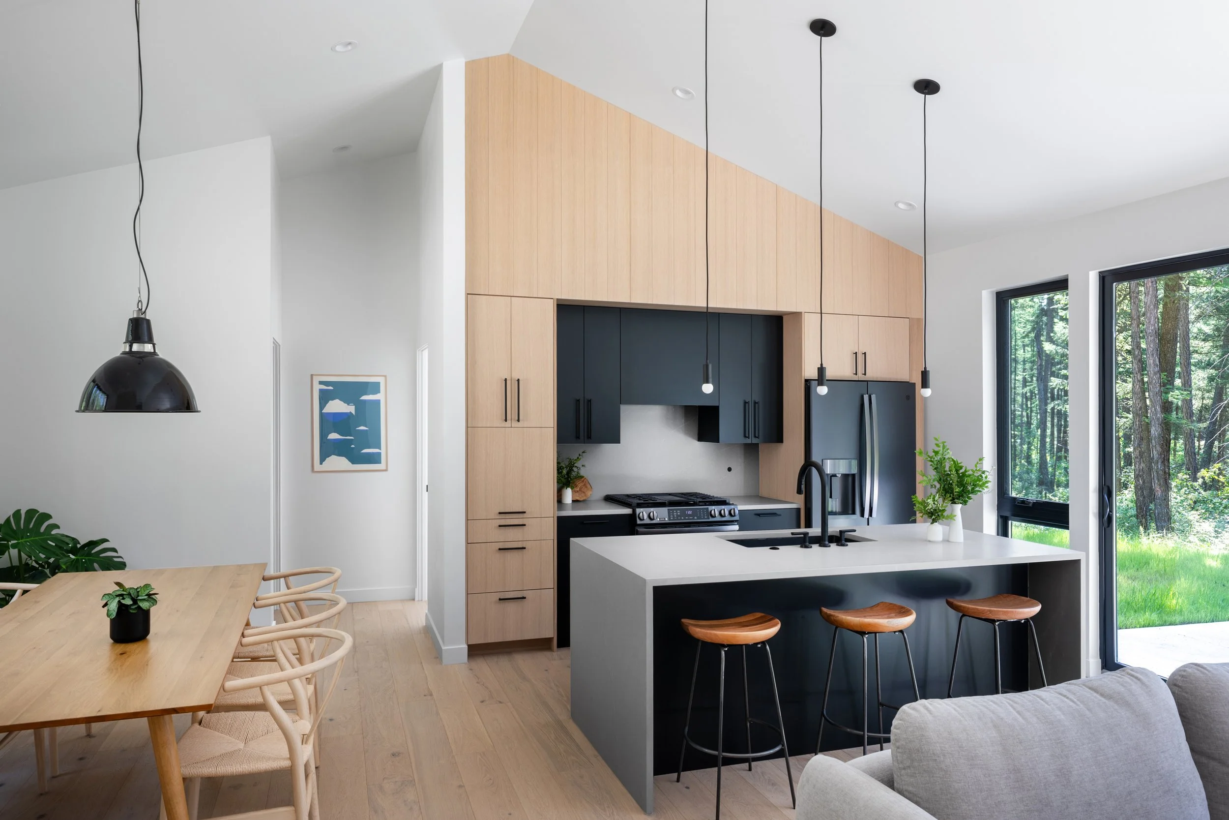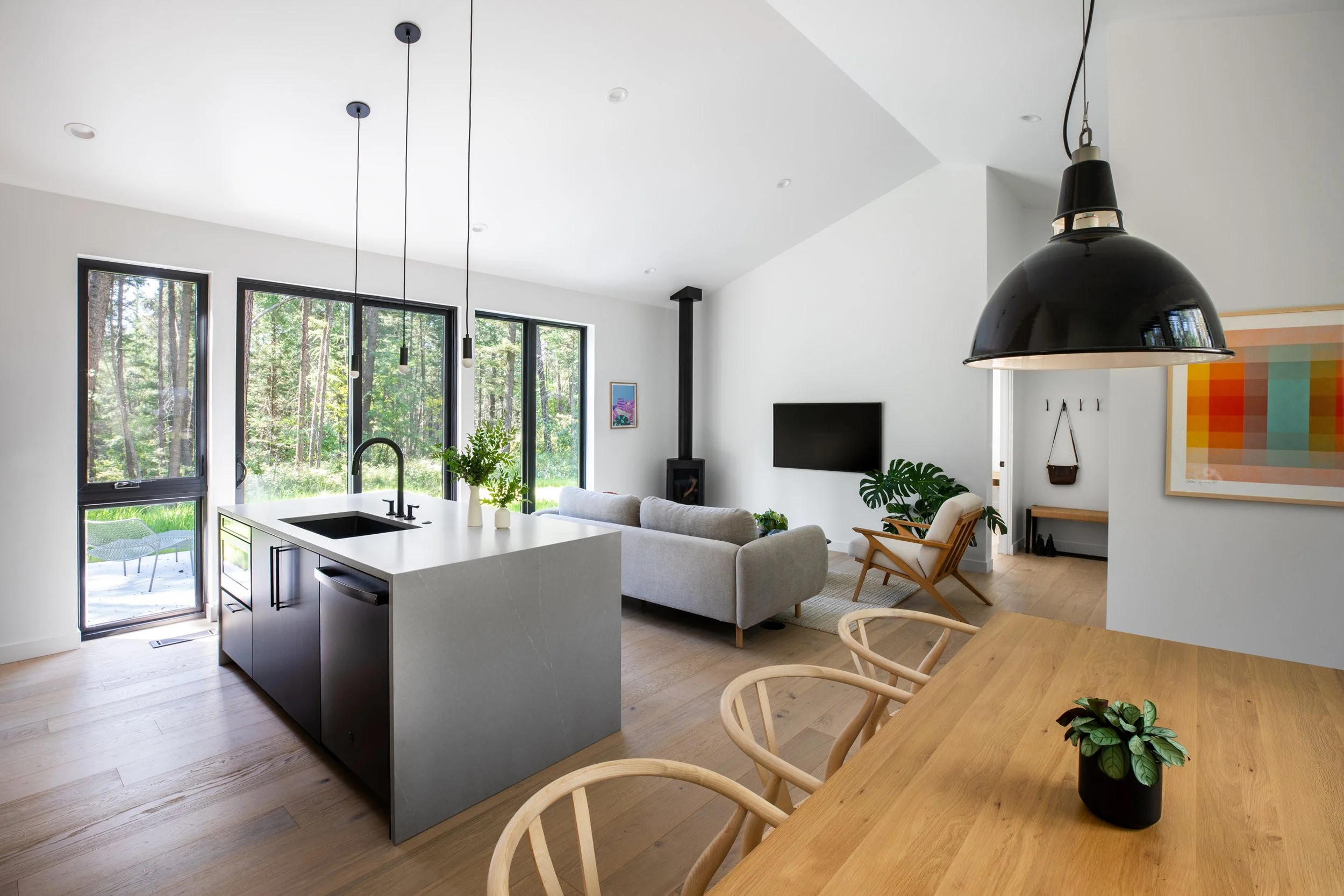 Układ wnętrza został zaprojektowany tak, by maksymalnie wykorzystać każdy metr przestrzeni – otwarta strefa dzienna płynnie łączy kuchnię, jadalnię i salon, a duże okna wprowadzają do środka naturalne światło i widoki na las, tworząc nieustanny dialog między wnętrzem a naturą.