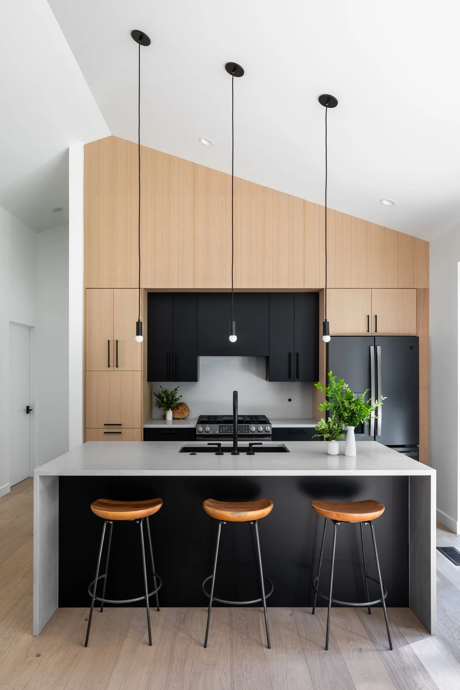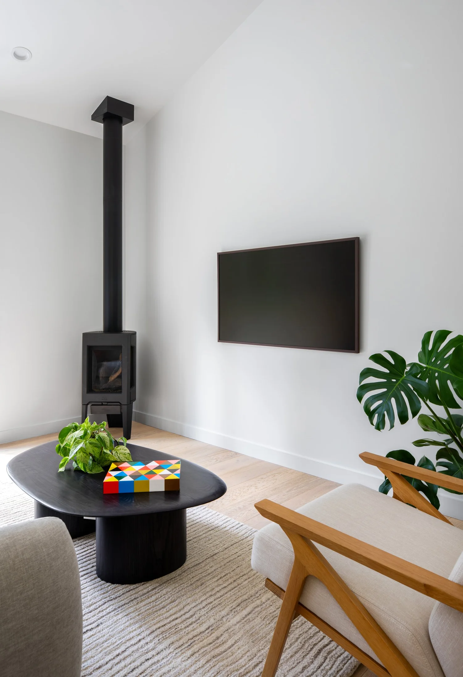 Z zewnątrz budynek wtapia się w otoczenie dzięki czarnej, matowej elewacji z bejcowanego drewna, która pozwala mu niemal zniknąć w cieniu drzew. Wewnątrz natomiast czeka zupełnie inny świat – ciepły, jasny i naturalny, w którym dominują drewno, miękkie światło i harmonia przestrzeni.