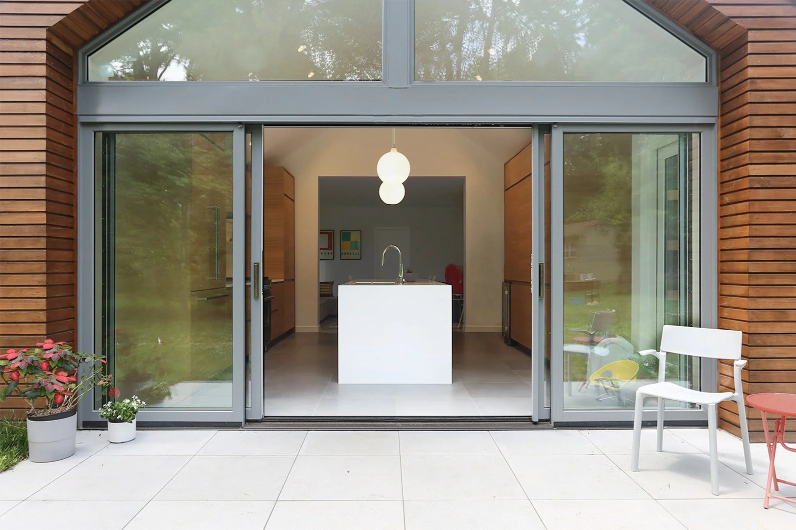 - wykorzystuje naturalne światło i widoki poprzez duże przeszklenia i otwarte przestrzenie,