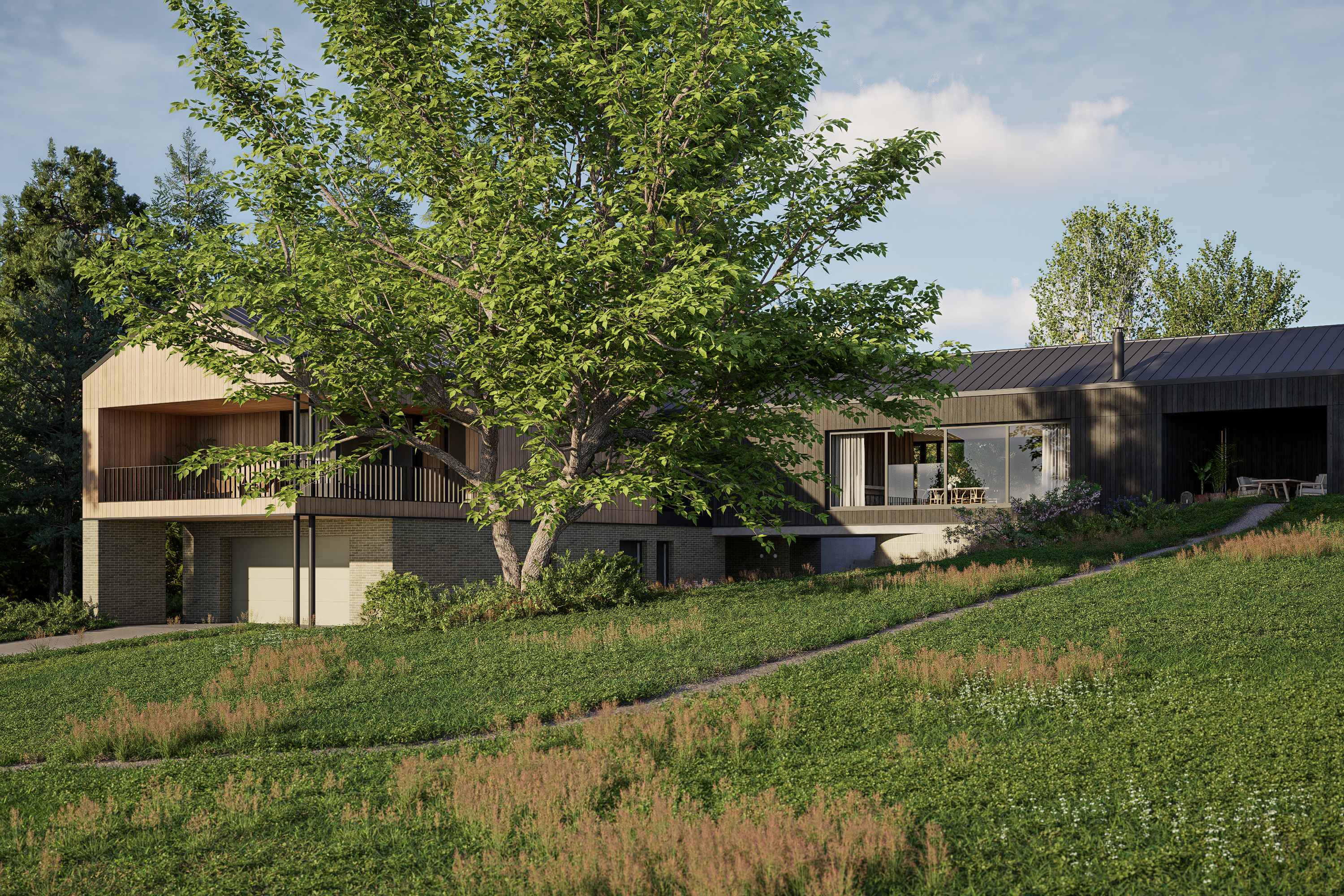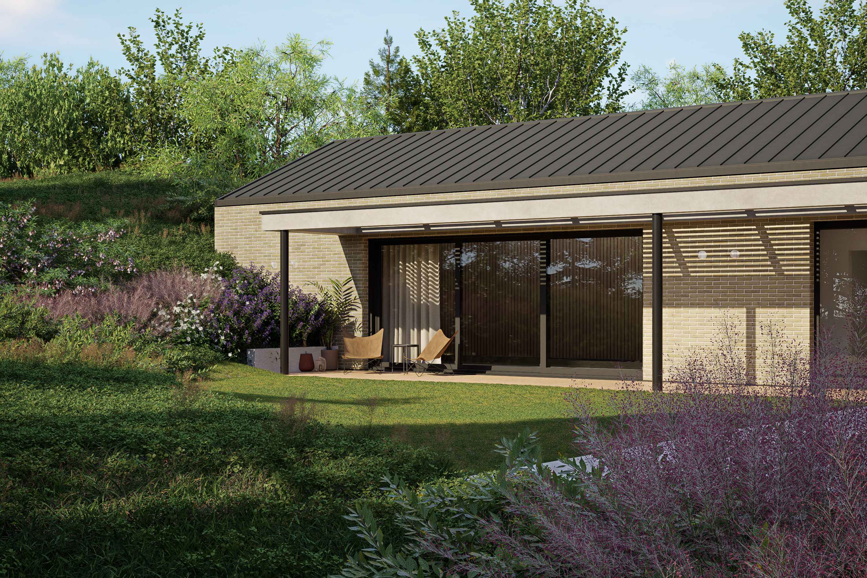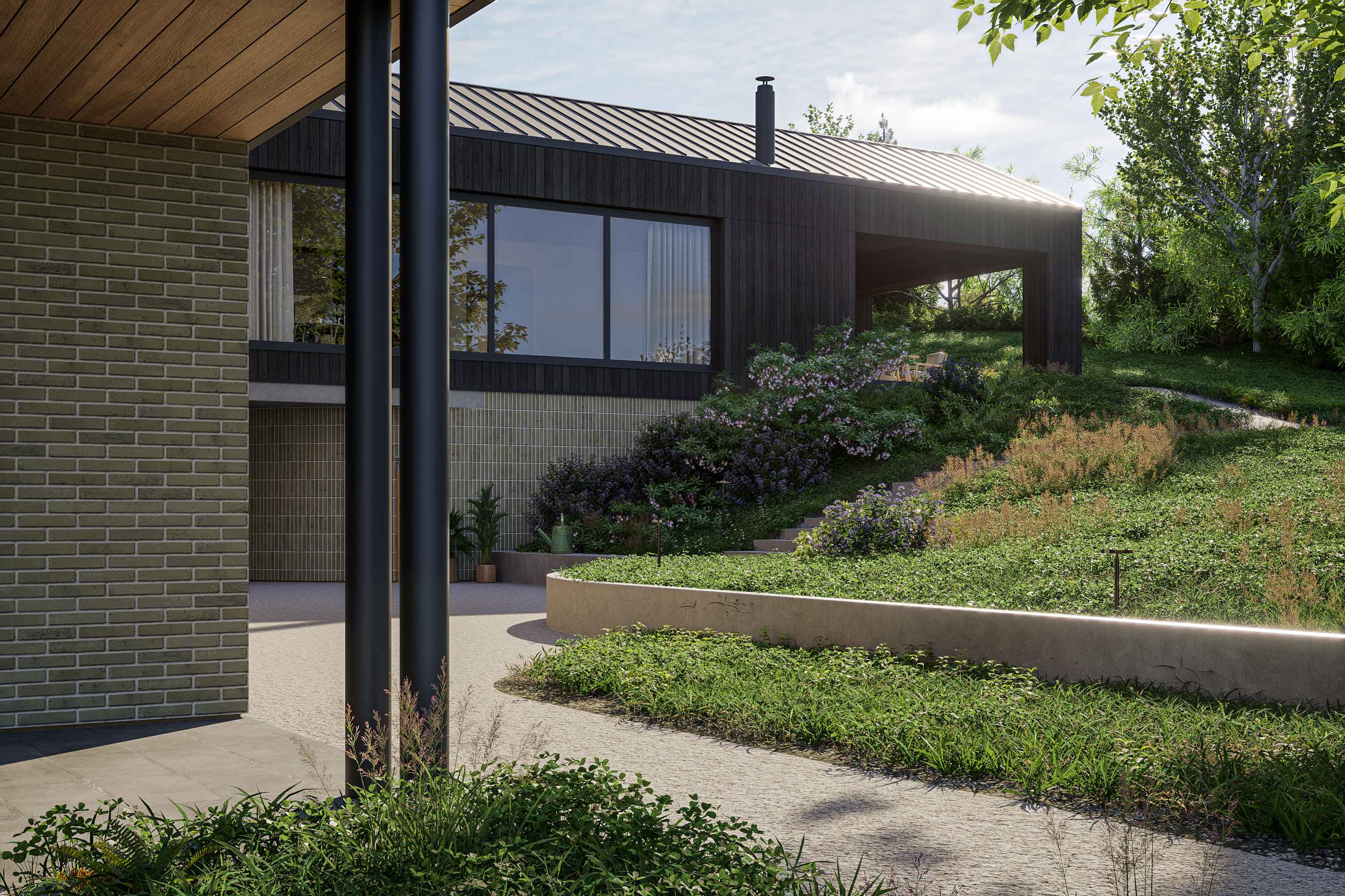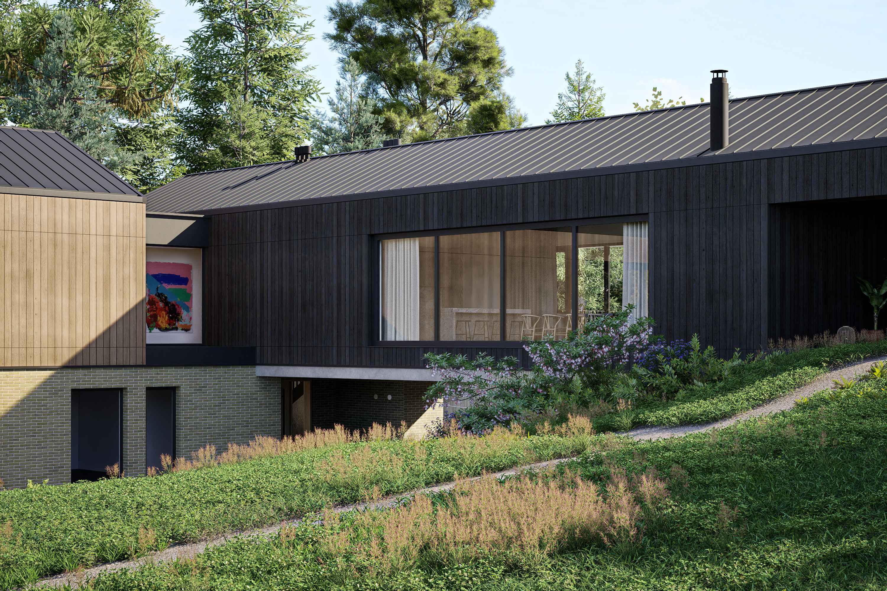 Dom, który nie dominuje nad krajobrazem, lecz pozwala się przez niego prowadzić. Zmienia się wraz z porą dnia i sposobem użytkowania, oferując różne doświadczenia tej samej przestrzeni — od porannego światła filtrowanego przez korony drzew, przez intymność ogrodu ukrytego w skarpie, po spokojne wieczory na zadaszonym tarasie. Projekt ten doskonale wpisuje się w sposób myślenia o architekturze, który my, jako nowoczesna stodoła, szczególnie cenimy — uważny, zakorzeniony w miejscu i oparty na świadomych decyzjach projektowych, gdzie forma wynika z dialogu z krajobrazem i realnymi potrzebami użytkowników.
