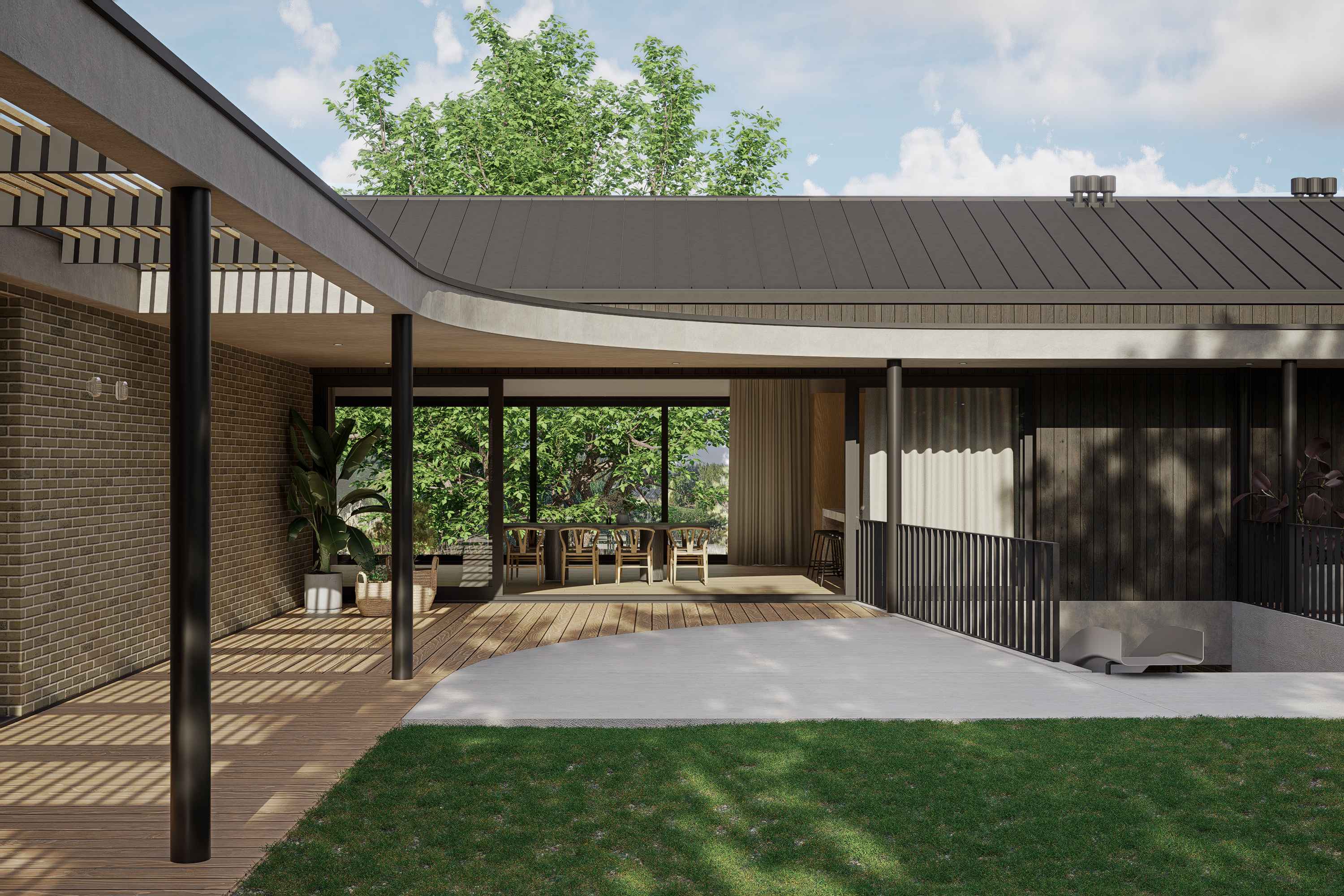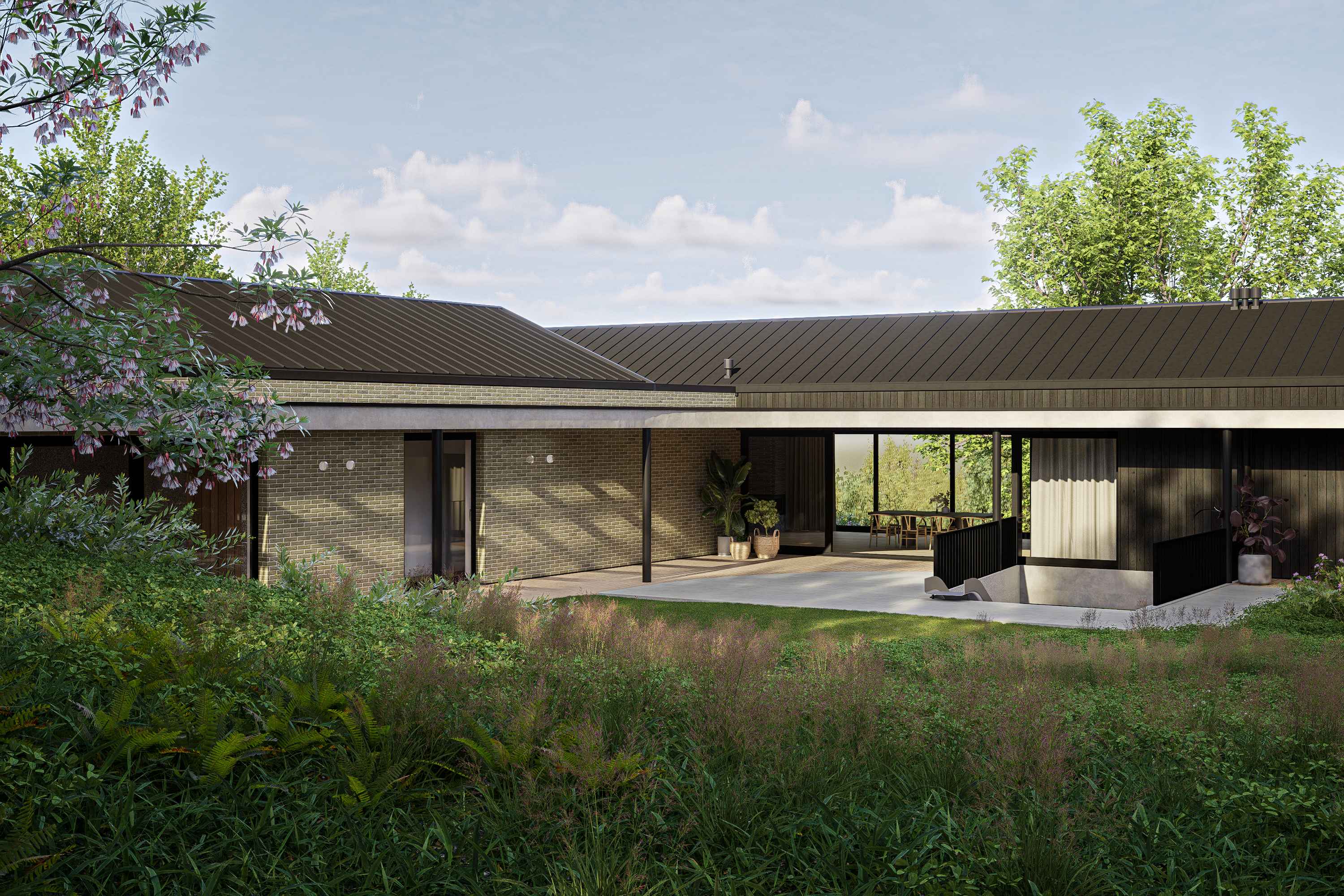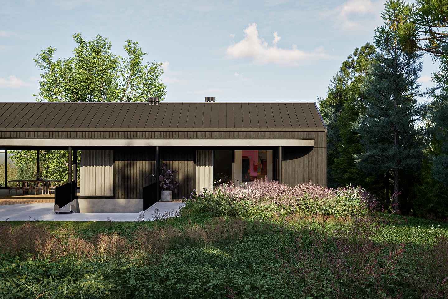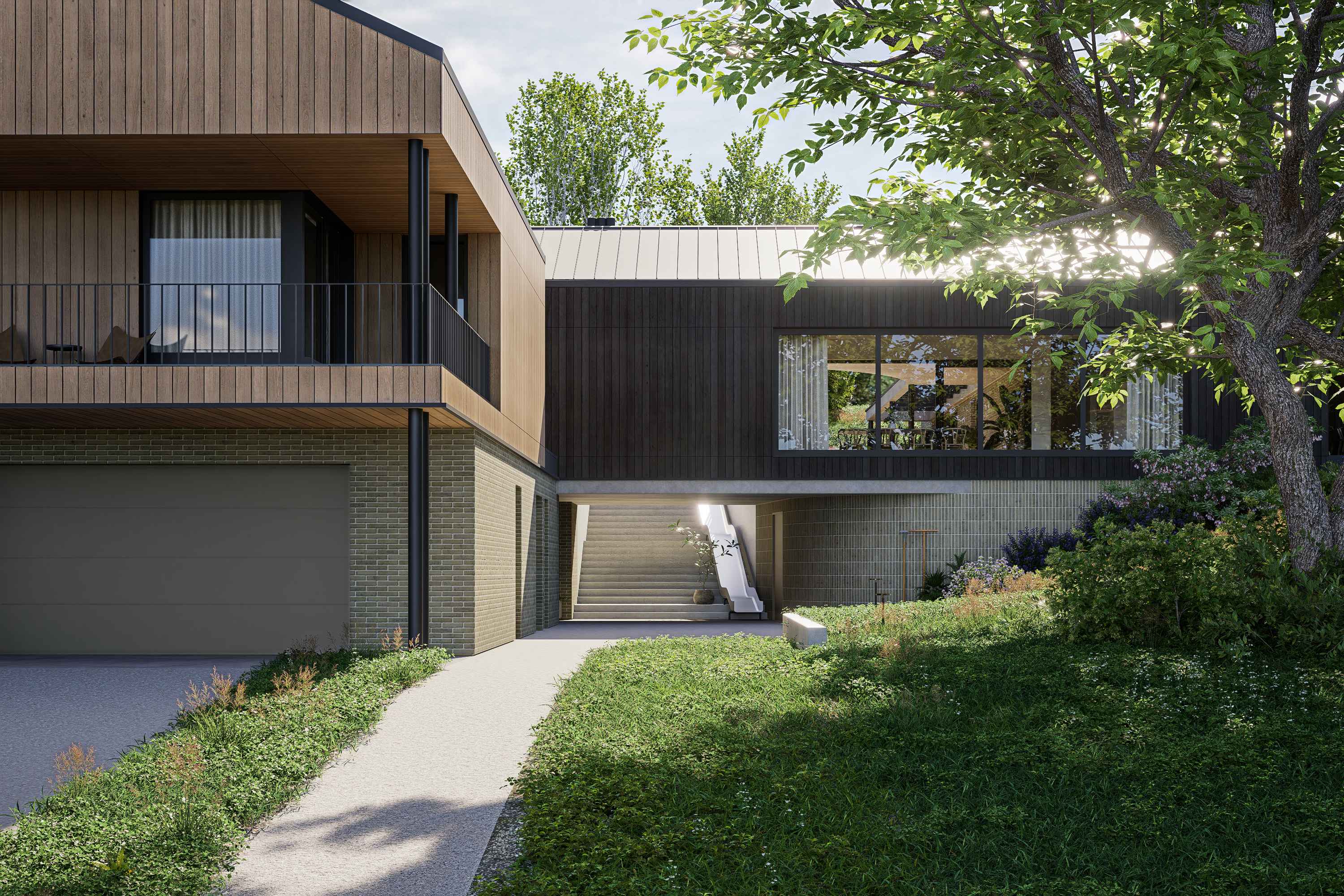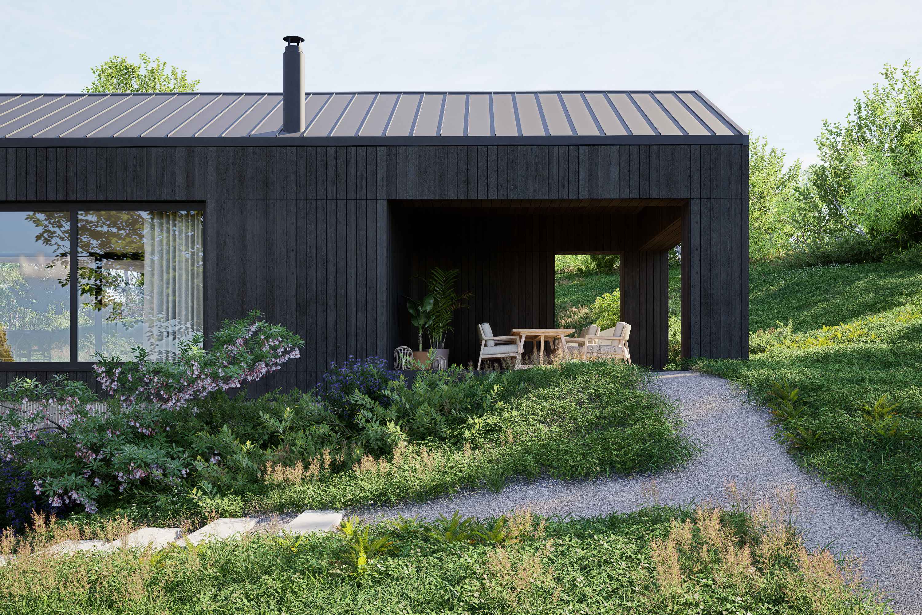 Dom, który nie dominuje nad krajobrazem, lecz pozwala się przez niego prowadzić. Zmienia się wraz z porą dnia i sposobem użytkowania, oferując różne doświadczenia tej samej przestrzeni — od porannego światła filtrowanego przez korony drzew, przez intymność ogrodu ukrytego w skarpie, po spokojne wieczory na zadaszonym tarasie. Projekt ten doskonale wpisuje się w sposób myślenia o architekturze, który my, jako nowoczesna stodoła, szczególnie cenimy — uważny, zakorzeniony w miejscu i oparty na świadomych decyzjach projektowych, gdzie forma wynika z dialogu z krajobrazem i realnymi potrzebami użytkowników.