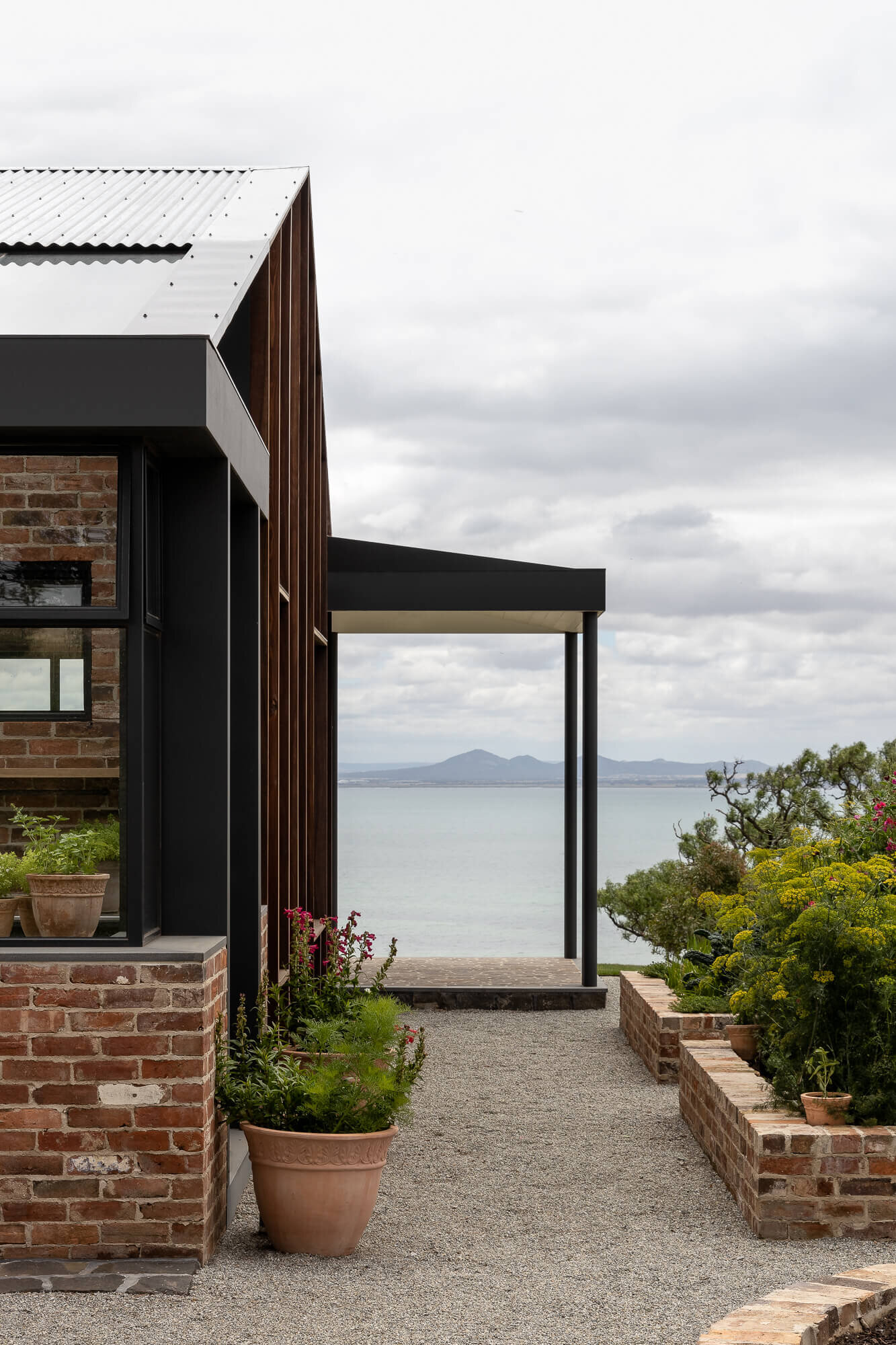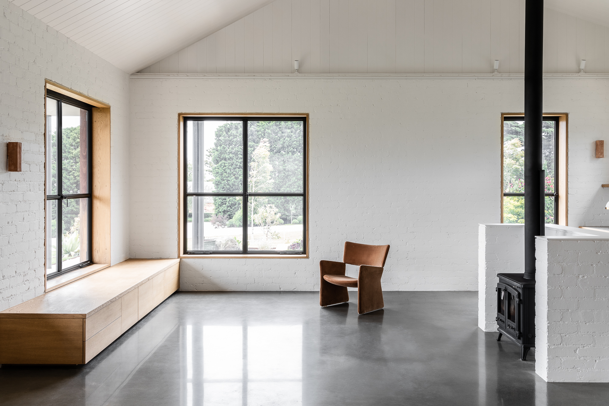 Wnętrza Spray Farm są utrzymane w duchu minimalizmu i luksusu – dominują tu bielone cegły, jasne drewniane szafki oraz polerowane betonowe podłogi. Kuchnia, biuro i pracownia artystyczna otwierają się na widoki zatoki Corio i pasmo górskie You Yangs, dzięki czemu to krajobraz staje się naturalną dekoracją. Projekt udowadnia, że współczesna architektura może łączyć funkcjonalność, elegancję i historyczne dziedzictwo, tworząc przestrzeń spójną i ponadczasową.