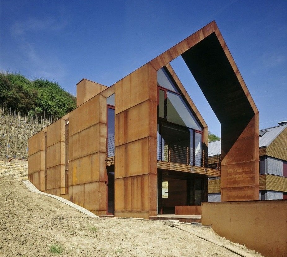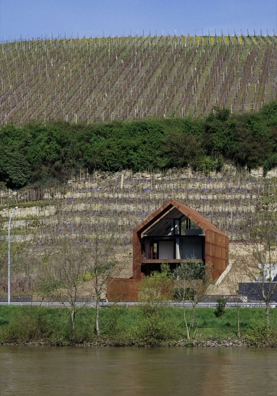 Dom dyplomaty z Luksemburga, miłośnika sztuki i malarstwa, powstał na lewym brzegu rzeki Mozeli, przy wjeździe do malowniczej miejscowości Wormeldange, słynącej z winnic. Budynek jest integralną częścią jednej z nich i został zaprojektowany tak, aby maksymalnie wykorzystać nachylenie terenu. Trzykondygnacyjna bryła z zaadaptowanym strychem od strony rzeki prezentuje się w pełnej wysokości, natomiast od strony zbocza niemal całkowicie wtapia się w krajobraz. Najniższy poziom mieści wejście, garaż oraz piwnicę częściowo ukrytą w ziemi, co wiąże się z koniecznością uwzględnienia okresowych podtopień. Całość nawiązuje do idei, jaką reprezentuje nowoczesna stodoła, łącząc surową formę z funkcjonalnością i lokalnym kontekstem.