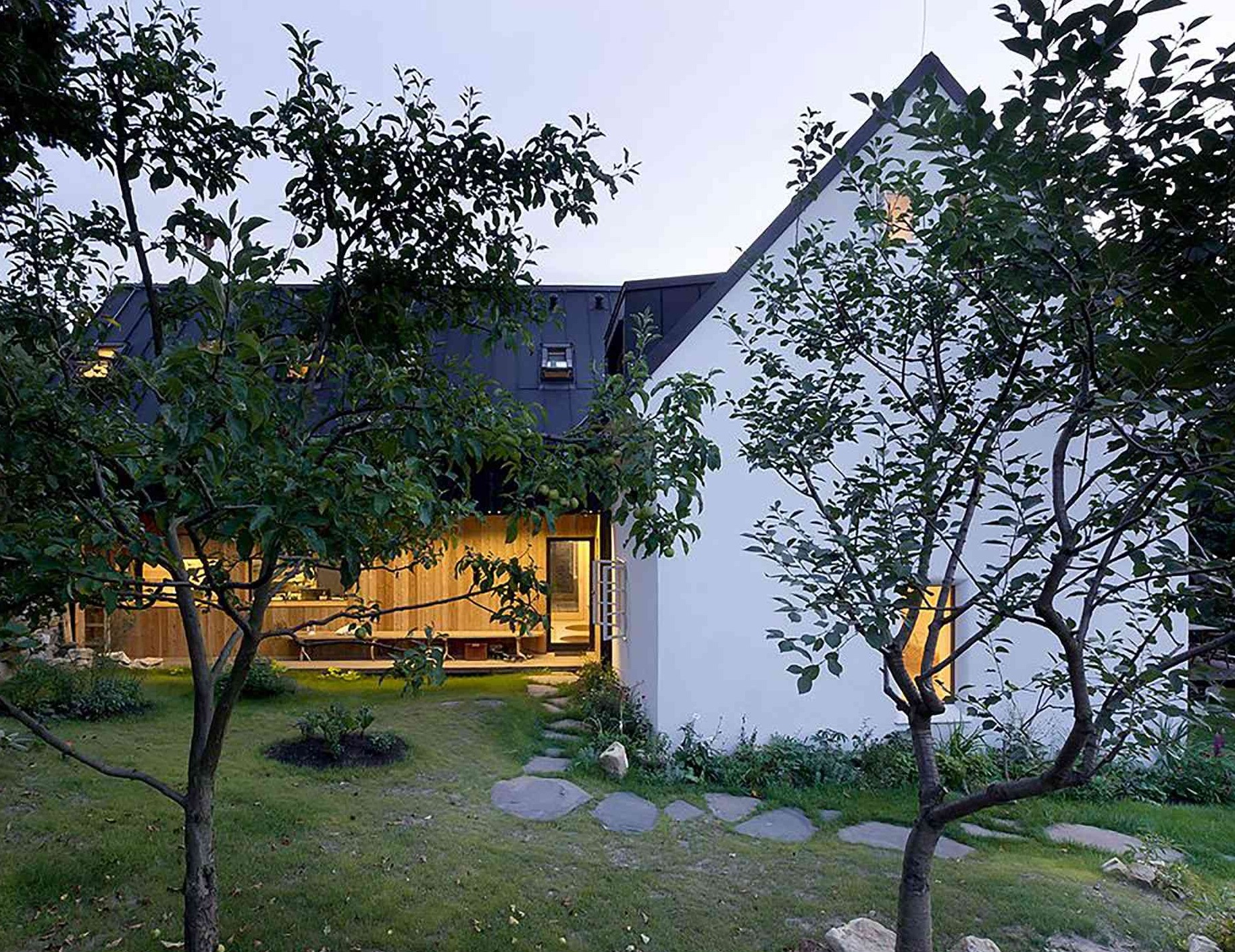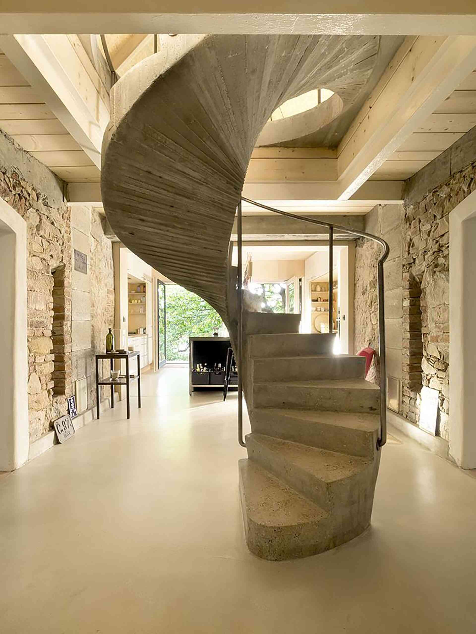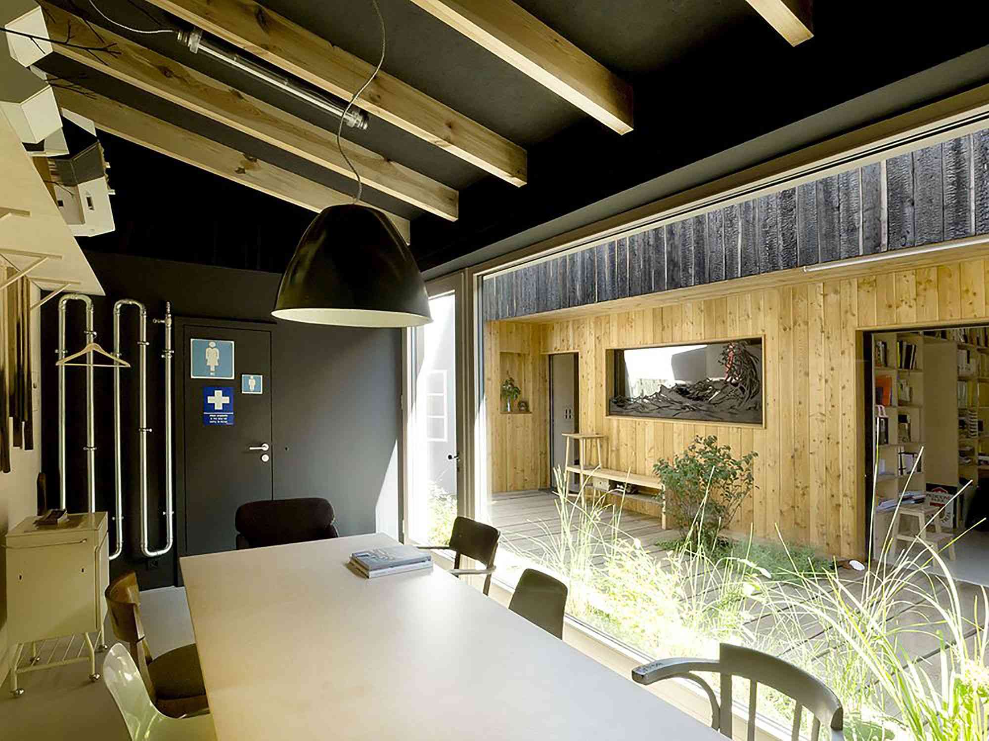 Renowacja starego domu zajęła dwa i pół roku, a po jej zakończeniu można było stworzyć spójną przestrzeń do życia i pracy. Biuro ulokowano od strony ulicy i oddzielono od prywatnej części niewielkim patio, a wspólny hall stał się strefą dzielącą funkcje. Efektem jest wyjątkowa realizacja, w której historia spotyka się z nowoczesną architekturą, a dawna wiejska zabudowa płynnie łączy się z funkcjonalnym układem współczesnego domu, przypominającym w formie i idei nowoczesną stodołę.