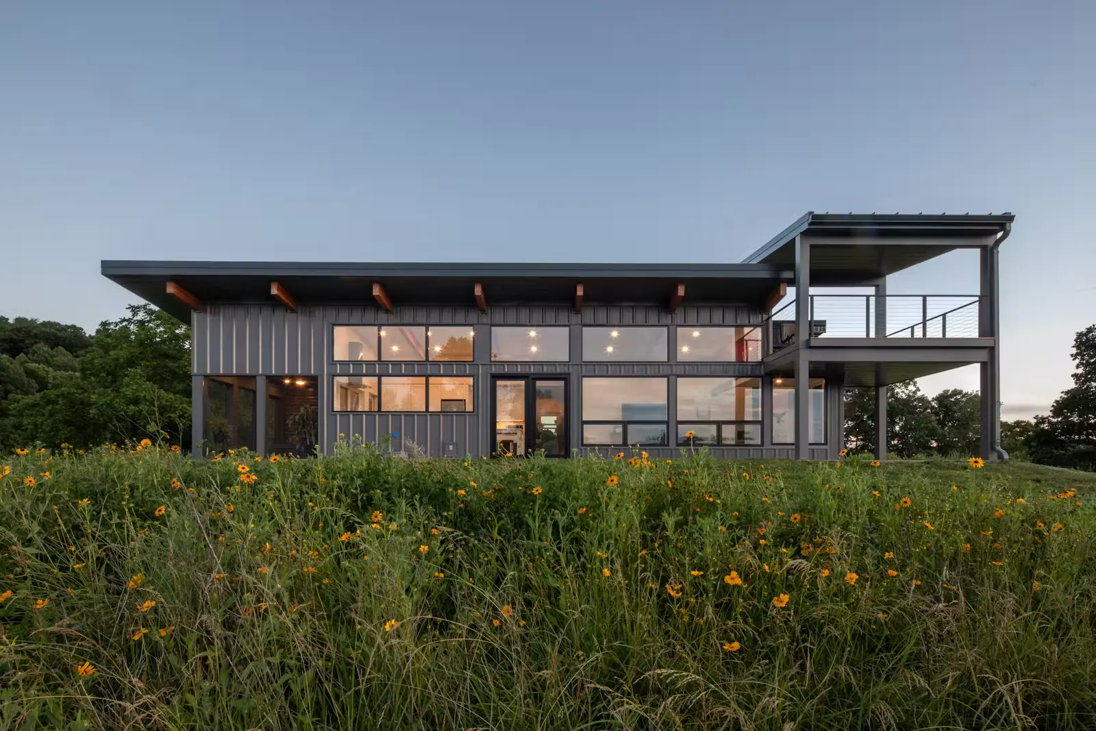 Nową elewację pokryto szarymi panelami stalowymi, aby pasowały do nowego budynku, który Loren Wood również zbudował dla pary. Ten budynek ma „wieżę strażniczą” i, jak mówi Herndon, ma naśladować formę i wysokość szklarni, tworząc poczucie spójności między dwoma budynkami. Oba mają nowoczesny, industrialny styl, charakteryzujący się czystymi, prostymi liniami.