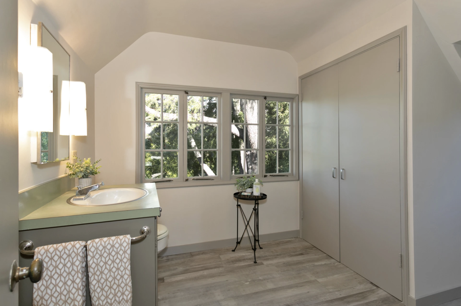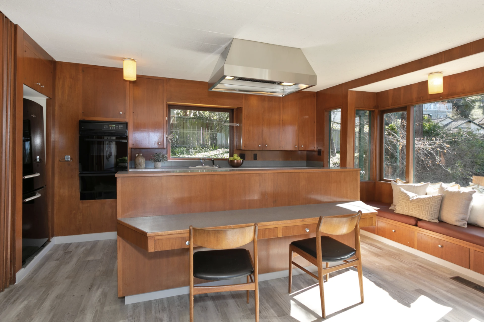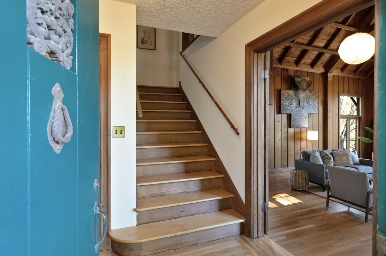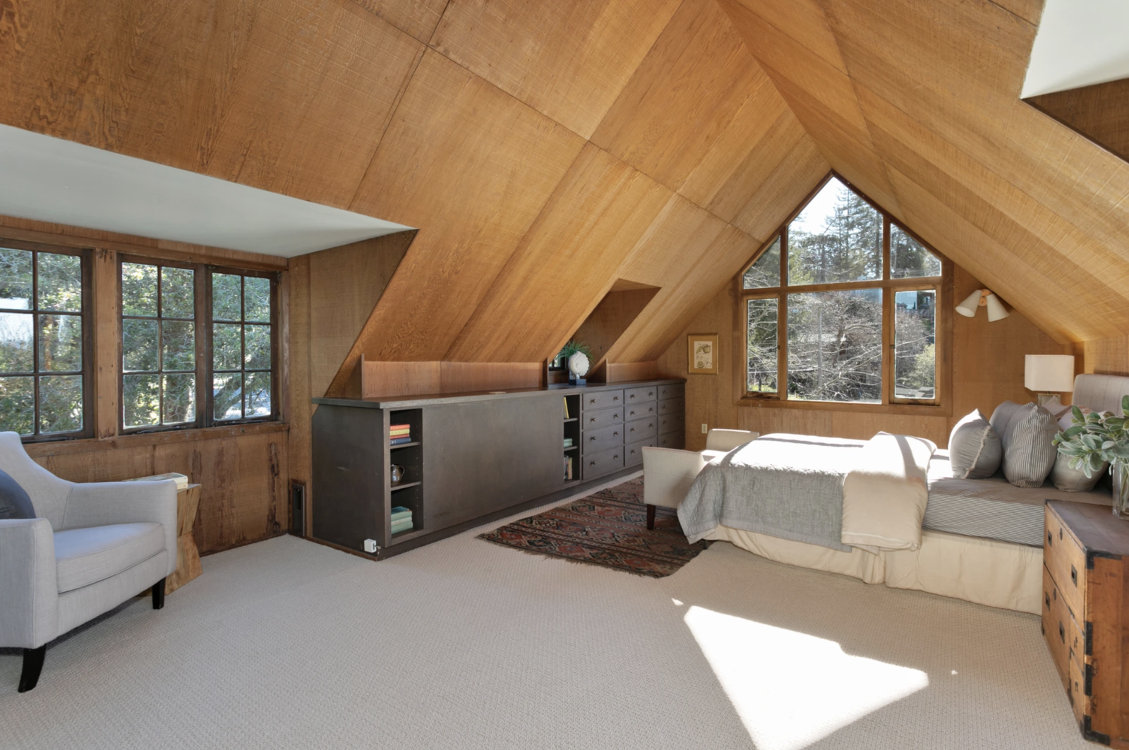 Rezydencja o powierzchni blisko 280 m2 ma trzy poziomy i cztery sypialnie, w tym sypialnię główną, która zajmuje całe najwyższe piętro, ciesząc właścicieli pięknymi widokami na okolice. Trzy pozostałe sypialnie znajdują się na drugim piętrze, ale cały dom utrzymany jest w pięknej stylistyce znanej jako „Arts and Crafts”. Ten ruch artystyczny zrzeszał malarzy, rzeźbiarzy, architektów i rzemieślników, którzy skupiali się na tworzeniu sztuki użytkowej. Dom pełen jest więc oryginalnych, czarujących detali, ale nie brakuje mu też przytulności i funkcjonalności. W budynku dominuje wysokiej jakości drewno, które nadaje całości specyficzny charakter minionej epoki.Przestrzeń salonu ma wysokość dwóch poziomów, a jej głównym elementem – poza drewnianymi ścianami i sufitami – jest duży, kamienny kominek. Dom ma mnóstwo okien, które pozwalają docenić otoczenie, oraz wiele drzwi, które otwierają wnętrza na obszerny, dwupoziomowy taras zewnętrzny.