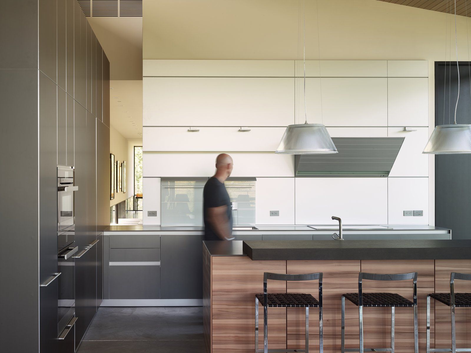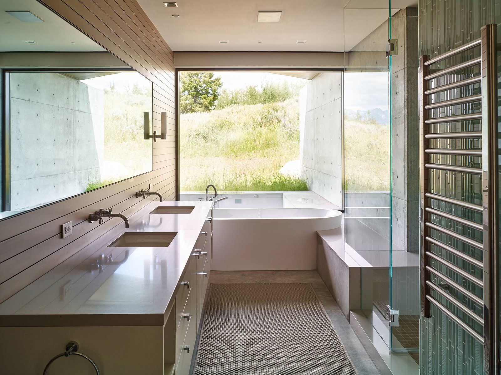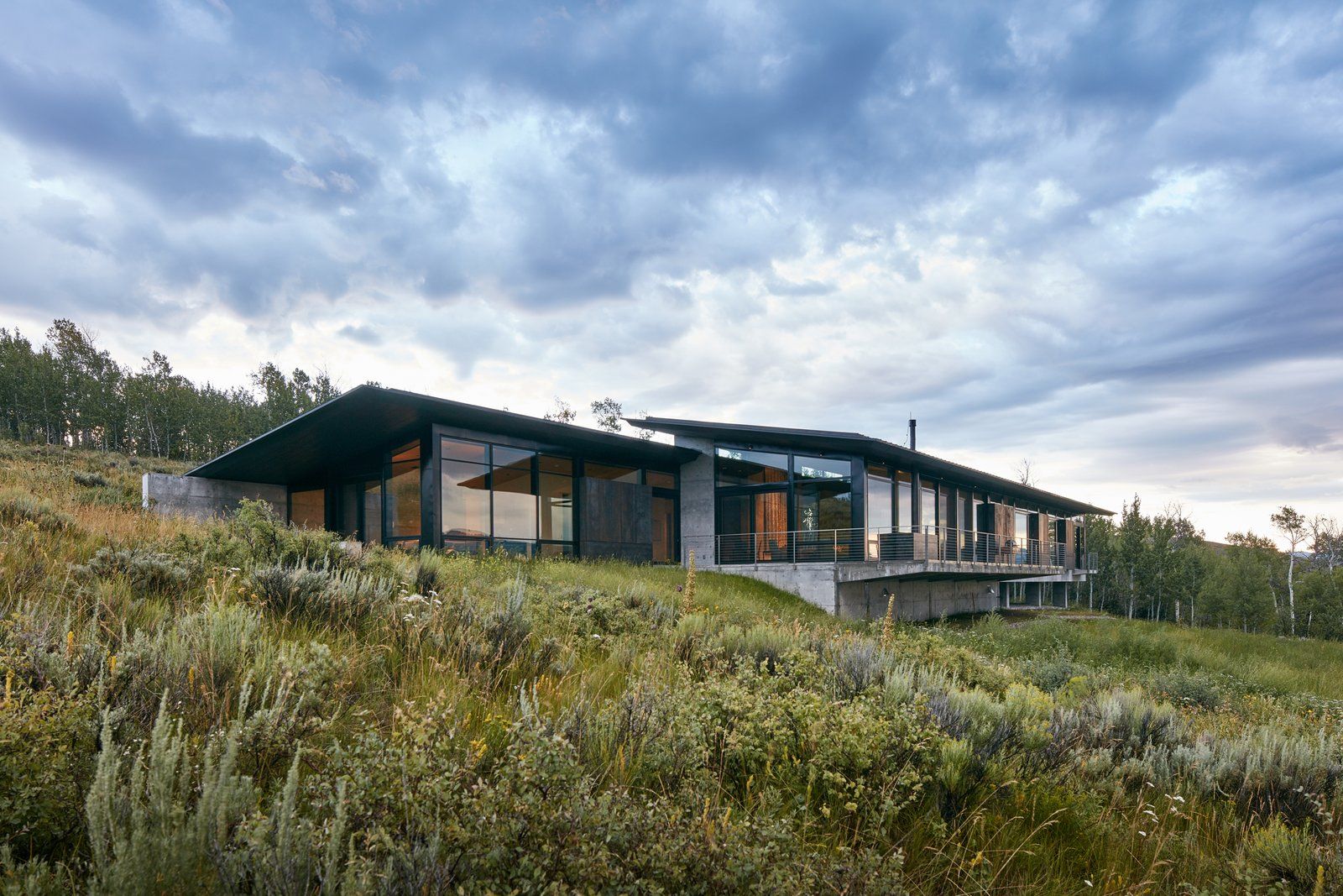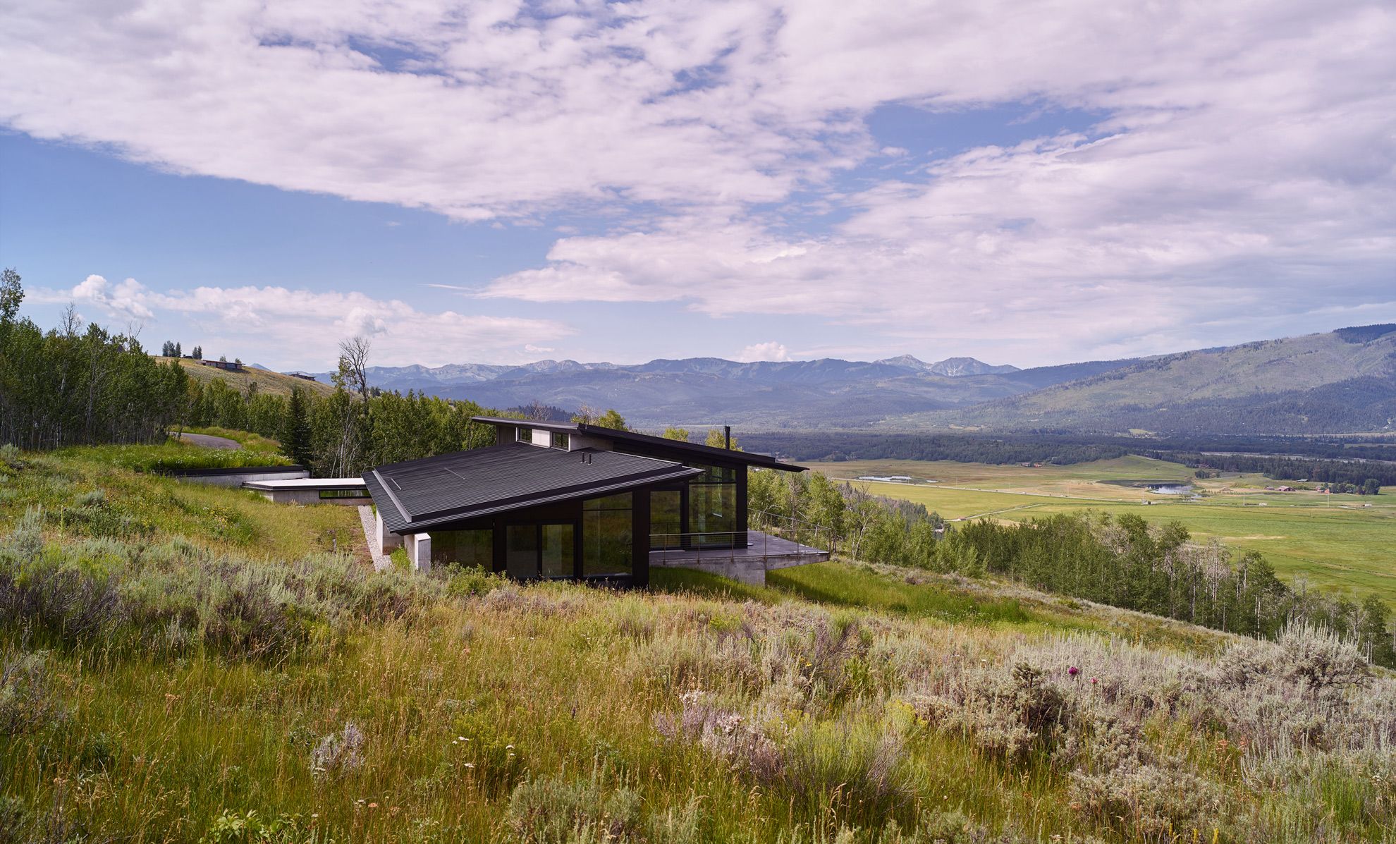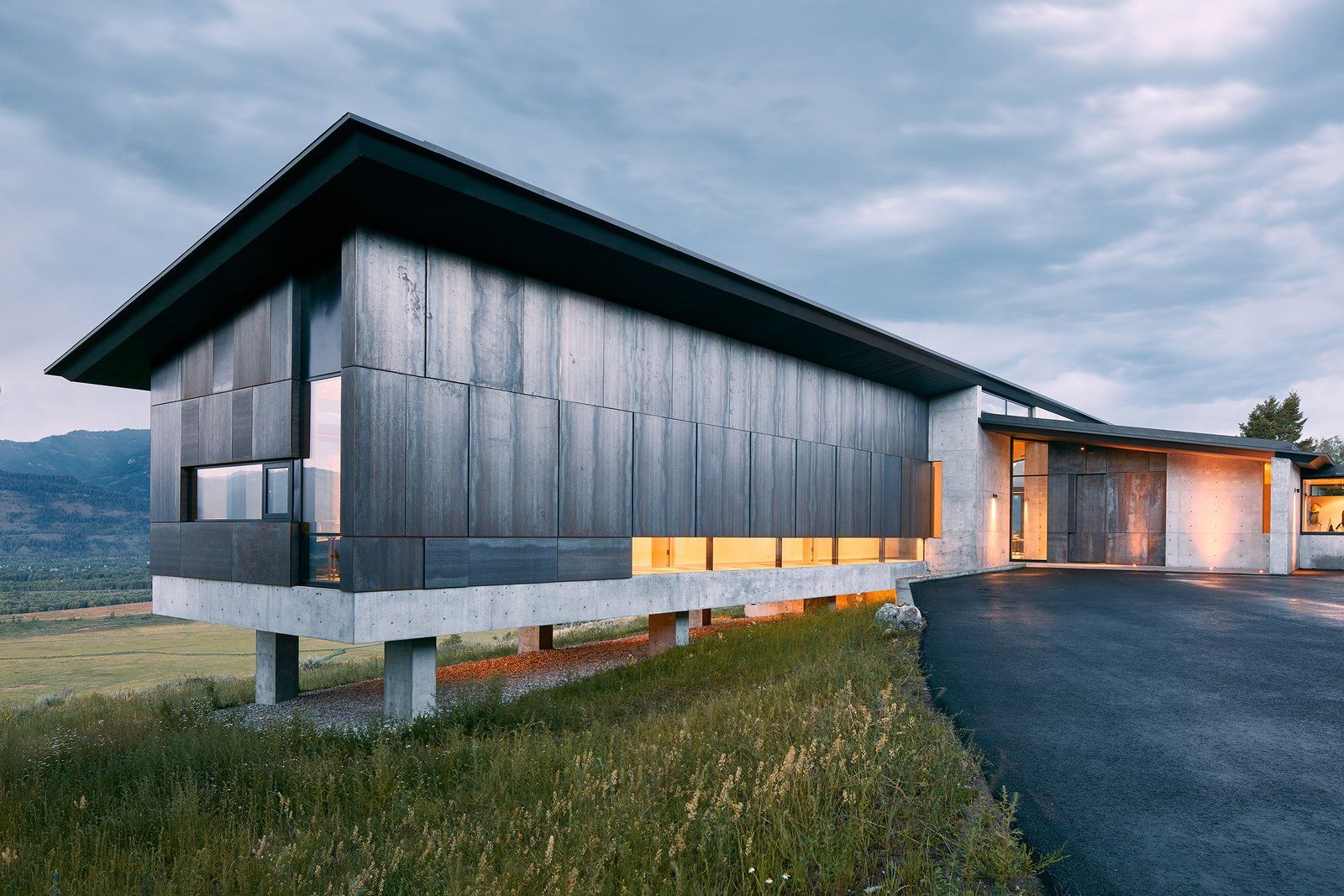 Rezydencja w Wyoming została zaprojektowana z myślą o pełnej harmonii z otaczającym krajobrazem gór Tetons, gdzie naturalne zbocza i porośnięte łąkami tereny stały się integralną częścią projektu. Budynek został umieszczony na trawiastym zboczu, z minimalną ingerencją w teren, miejscami uniesiony na kolumnach, by zachować naturalny spadek. Elewacja z stali kortenowskiej i detale z betonu podkreślają prostotę i trwałość materiałów, które starzeją się w sposób naturalny, zyskując dodatkowy urok z czasem. Projekt integruje również przestrzeń galerii sztuki, z niskimi oknami chroniącymi obrazy przed słońcem, a jednocześnie wprowadzającymi dużo naturalnego światła, co tworzy harmonijną przestrzeń łączącą funkcjonalność i estetykę. Całość projektu nawiązuje do idei nowoczesnej stodoły, w której prostota formy i bliskość natury tworzą wyjątkowe doświadczenie mieszkalne.