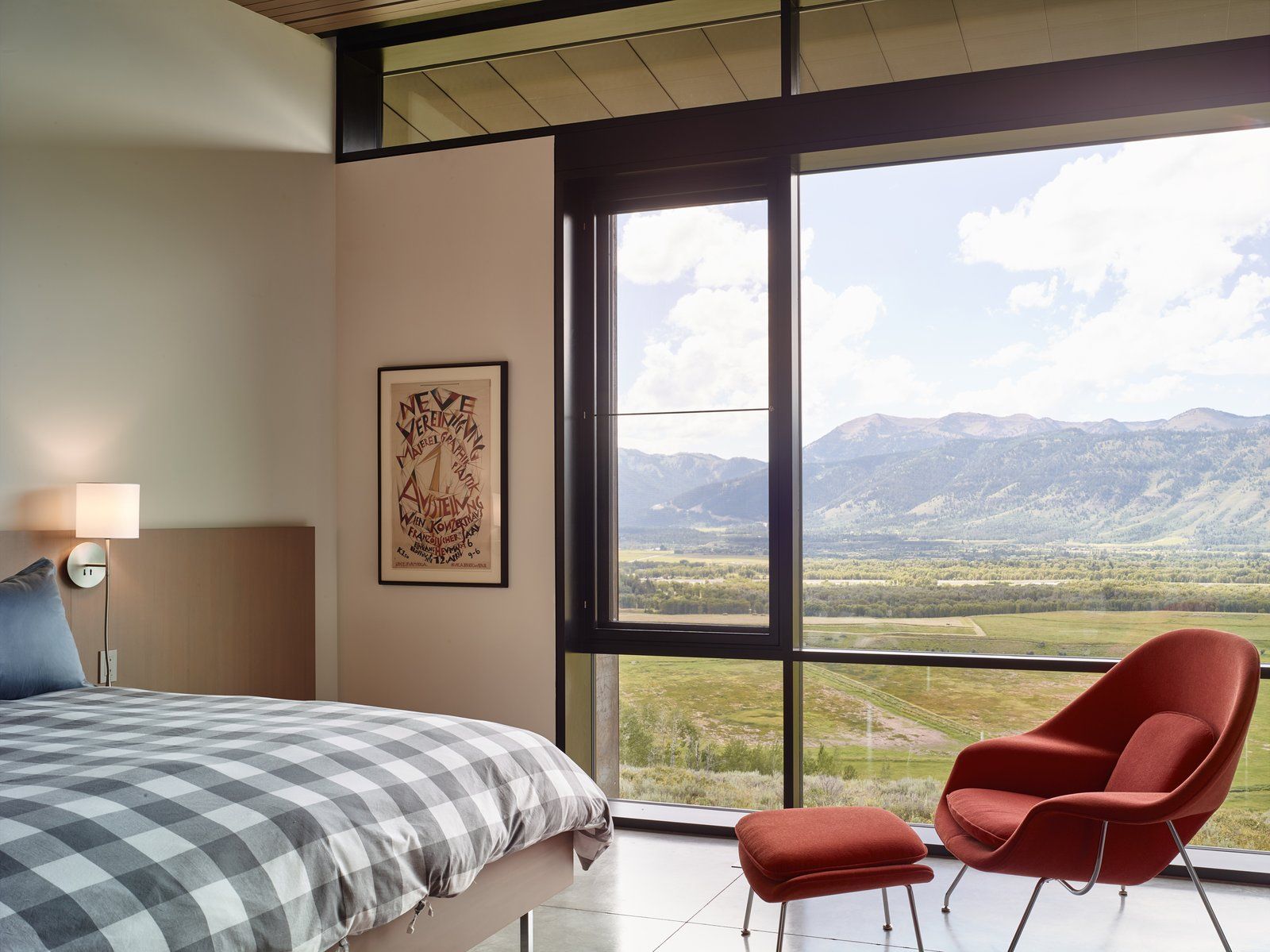 Wnętrze domu zostało zaprojektowane tak, aby minimalistyczna kuchnia, jadalnia i salon płynnie łączyły się w otwartą przestrzeń dzienną z widokiem na góry. Drewniane sufity kontrastują z betonowymi i gipsowymi ścianami, a okna od podłogi do sufitu maksymalizują kontakt z naturą, pozwalając podziwiać panoramę Teton z komfortu wnętrza. Salon i kominek tworzą przytulną strefę relaksu, a przemyślana organizacja przestrzeni podkreśla minimalizm i funkcjonalność. Cały projekt eksponuje prostotę i elegancję materiałów, jednocześnie harmonijnie współistniejąc z otoczeniem i nawiązując do koncepcji nowoczesnej stodoły – budynku trwałego, praktycznego, a jednocześnie pełnego wizualnego uroku i naturalnej harmonii z krajobrazem.