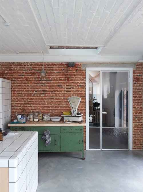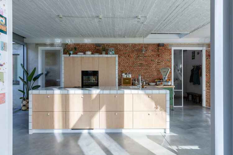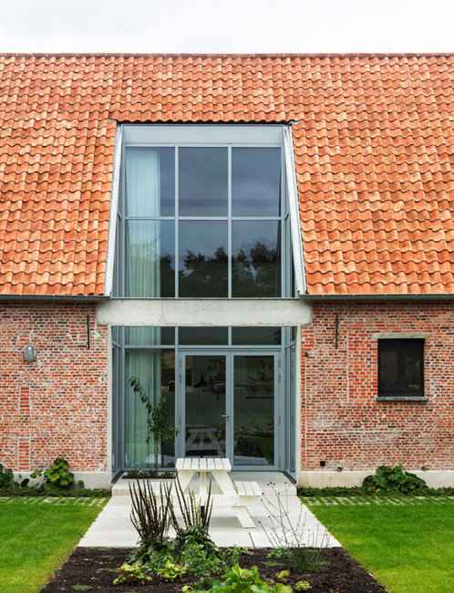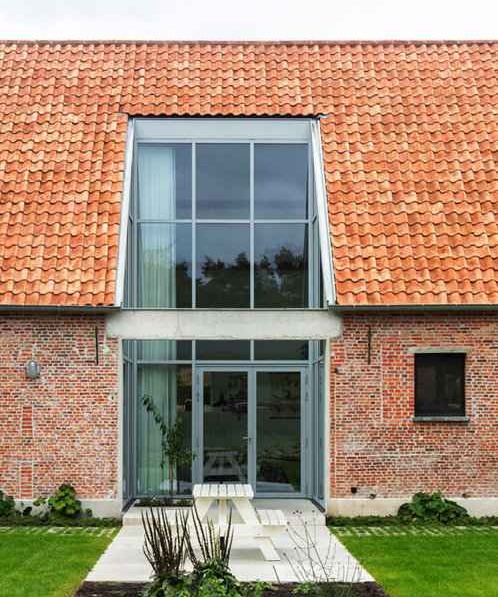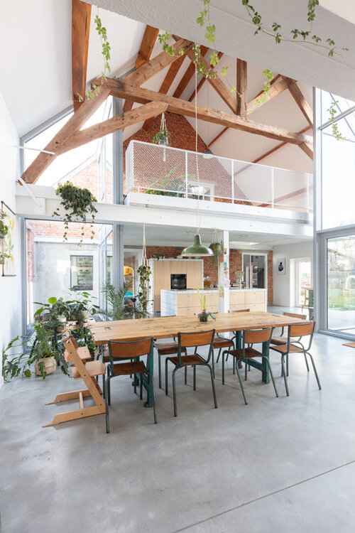We wnętrzu tej nowoczesnej stodoły usunięto część stropu, tworząc imponującą antresolę, która nadaje całości lekkości i otwartości. Antresola stała się naturalną scenografią dla przestrzeni dziennej, wprowadzając atrakcyjne podziały wysokości i perspektywę wizualną. Wszystkie istniejące otwory i perforacje elewacji zostały zachowane, dzięki czemu nowy dom jednorodzinny wciąż zachowuje ślad swojej historii, prezentując przy tym świeżą, współczesną jakość architektury.