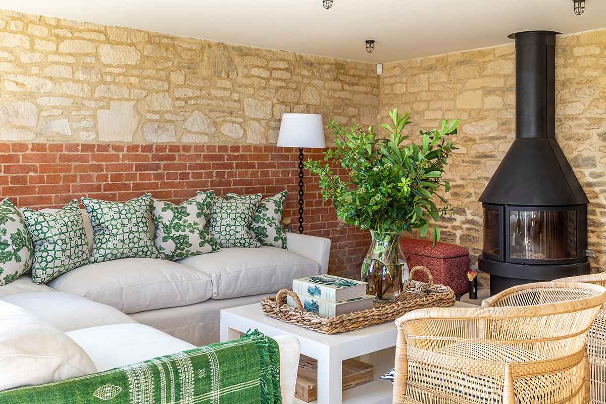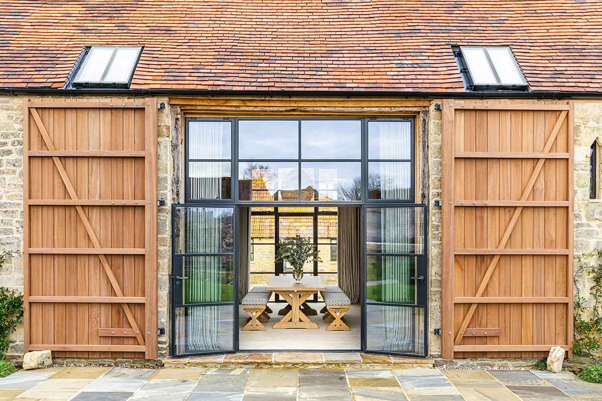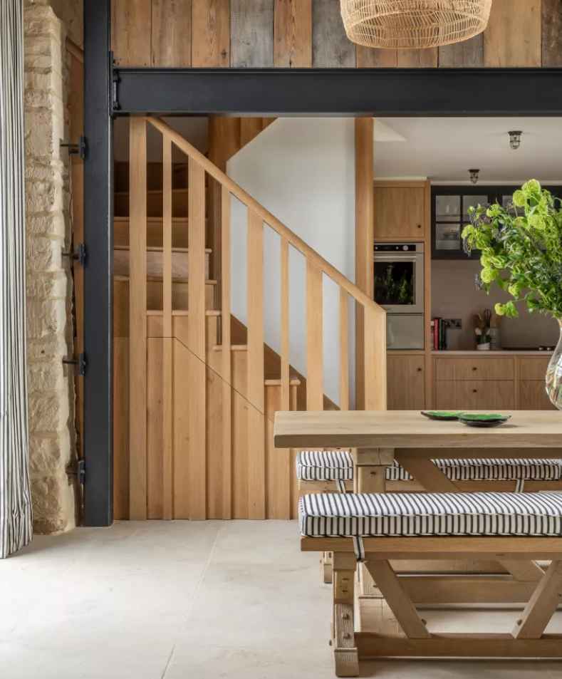 Architekci zaprojektowali otwartą przestrzeń parteru, w której połączono kuchnię, jadalnię i strefę wypoczynkową. Nad nią umieszczono sypialnię w formie kapsuły. W centrum domu znajduje się imponująca, sklepiona jadalnia ze stalową konstrukcją i przeszklonymi otworami po dawnych wrotach stodoły. Praktyczne wyposażenie, takie jak dębowy stół i solidne ławy, nadają wnętrzu ciepły, wiejski charakter. Projekt wnętrz autorstwa Samanthy Todhunter łączy nowoczesny minimalizm z rustykalnymi detalami – białe meble kontrastują z zielonymi tkaninami, a elementy z trzciny i sitowia podkreślają naturalny klimat przestrzeni.