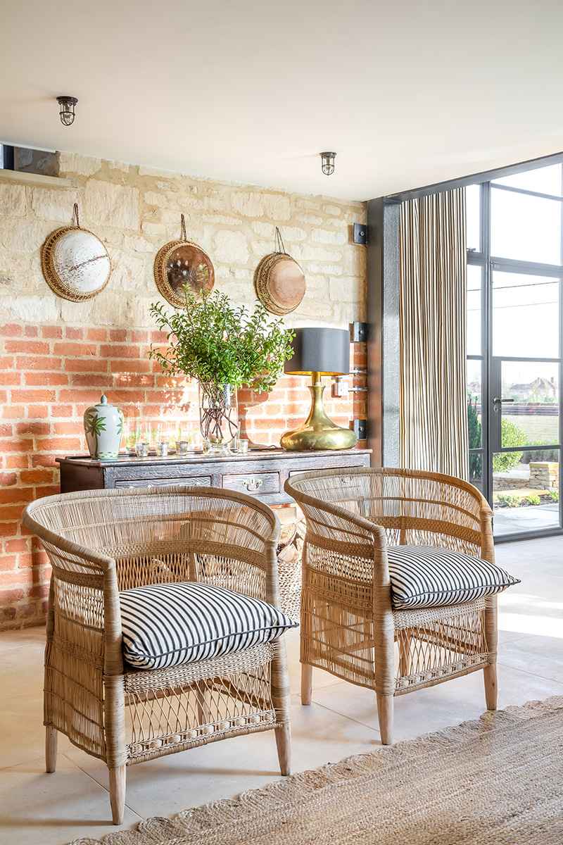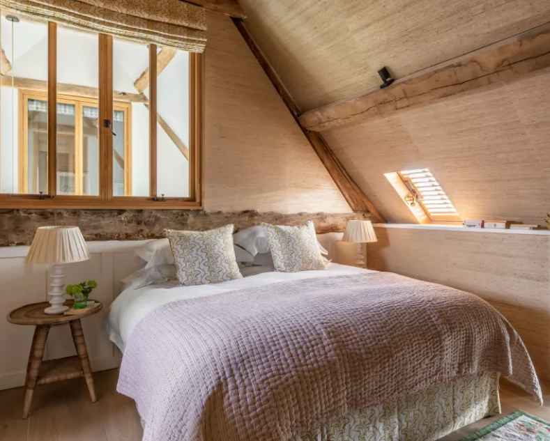 Część sypialna, dostępna po drewnianych schodach, nawiązuje do pierwotnego przeznaczenia budynku. Ściany wyściełane słomą, okna „Romea i Julii” oraz tkaniny w stylu indyjskim tworzą nastrojową i przytulną atmosferę. Nowoczesna stodoła w Dorset łączy w sobie historię z nowoczesnością – zachowuje dawny urok, a jednocześnie spełnia współczesne wymagania estetyki i funkcjonalności. To przestrzeń stworzona z myślą o rodzinie, spotkaniach i celebrowaniu prostych, autentycznych chwil w wyjątkowym miejscu.