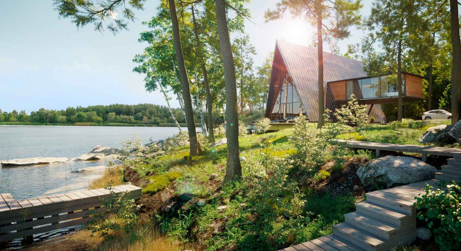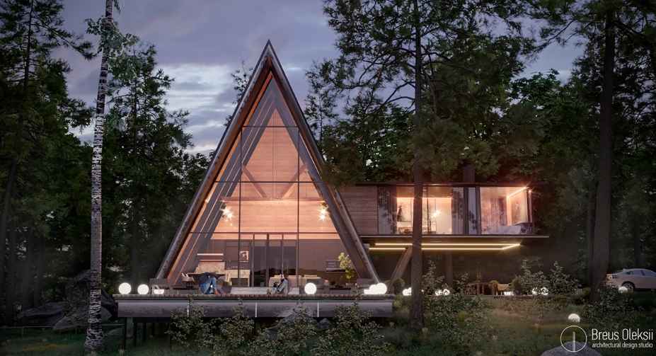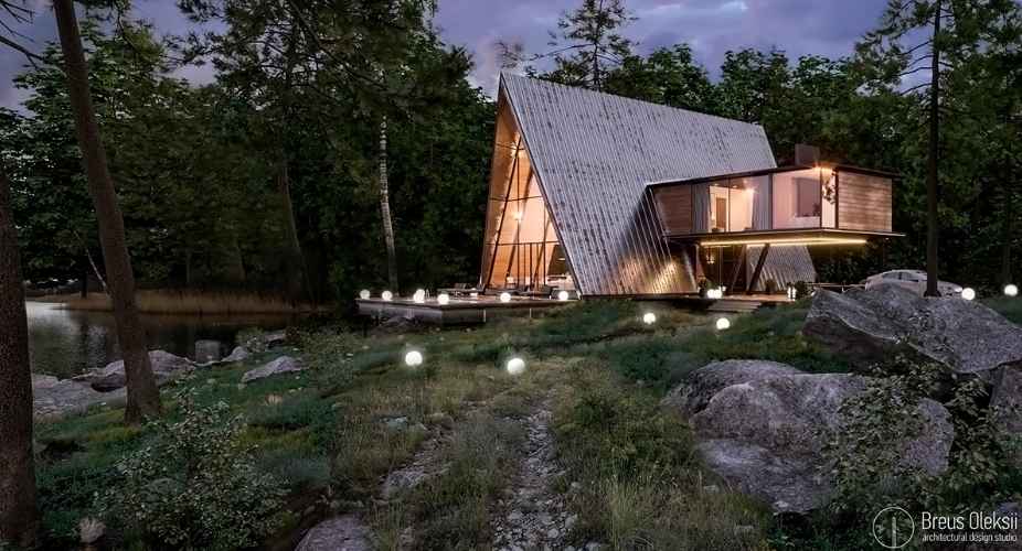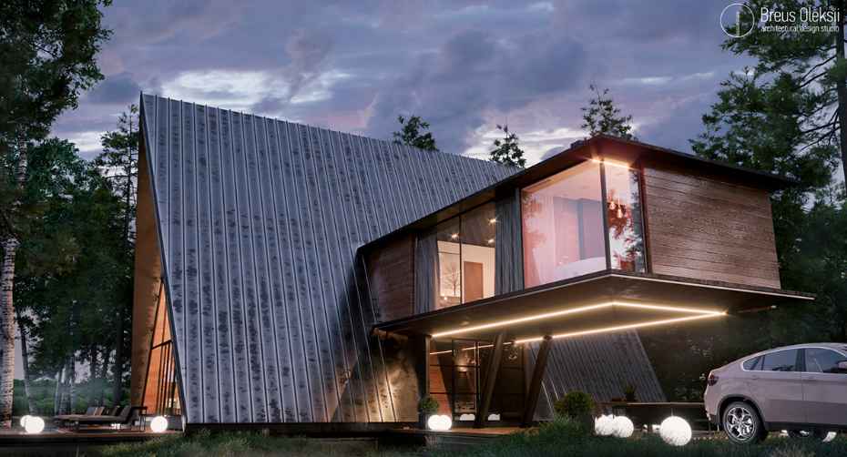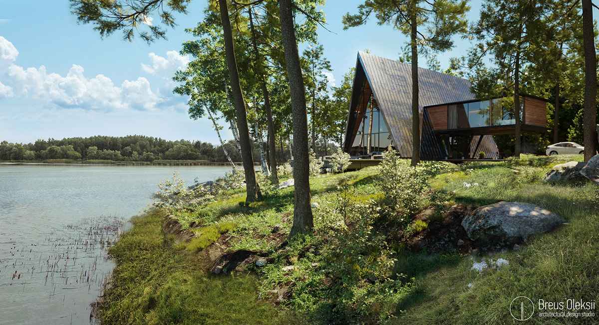 Projekt House by the Dniepr River powstał w ukraińskim studiu architektonicznym Breus Oleksii i stanowi nowoczesną interpretację klasycznych form PRL. Bryła domu nawiązuje do charakterystycznych, strzelistych trójkątów znanych z tamtej epoki, jednak w unowocześnionej odsłonie. Nowością jest wysunięte boczne skrzydło domu, które nadaje konstrukcji dynamicznego charakteru, a futurystycznego wyrazu dodają przeszklone ściany i starannie zaprojektowane oświetlenie. W ten sposób House by the Dniepr River łączy tradycję z nowoczesnym designem, przypominając subtelnie nowoczesną stodołę w minimalistycznej formie.