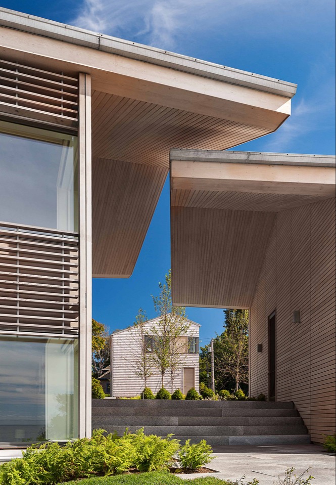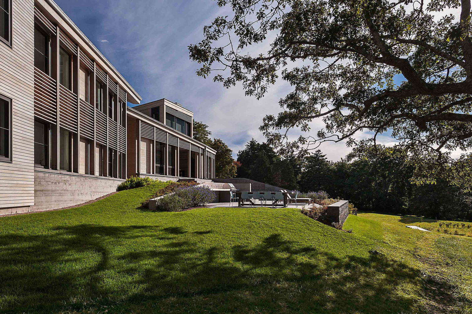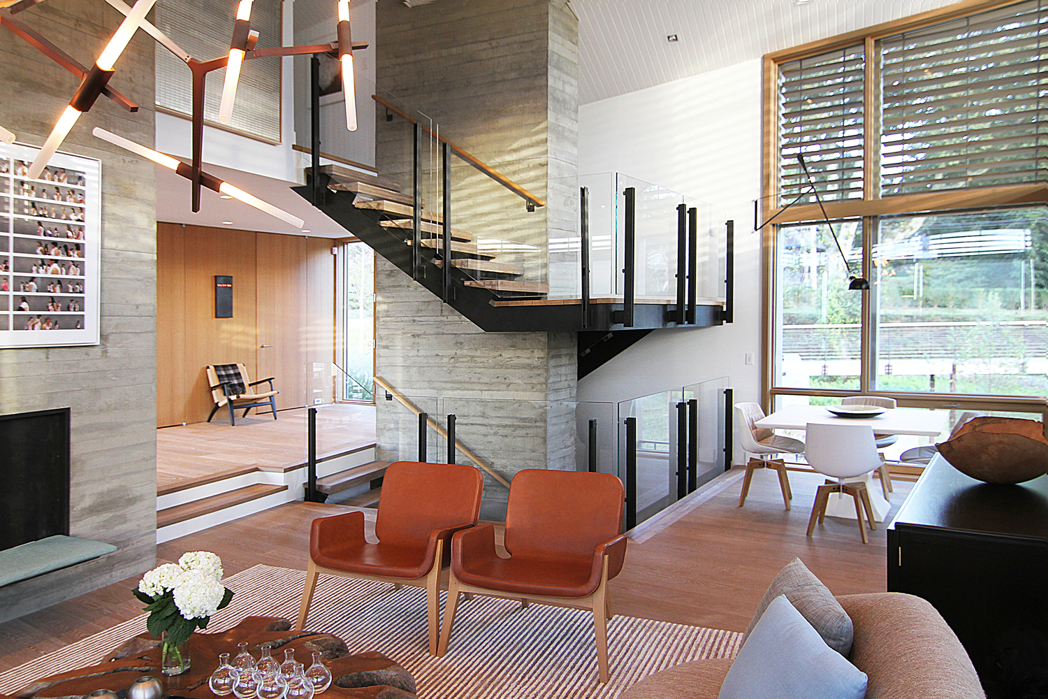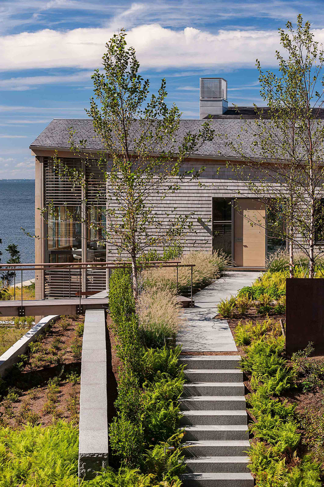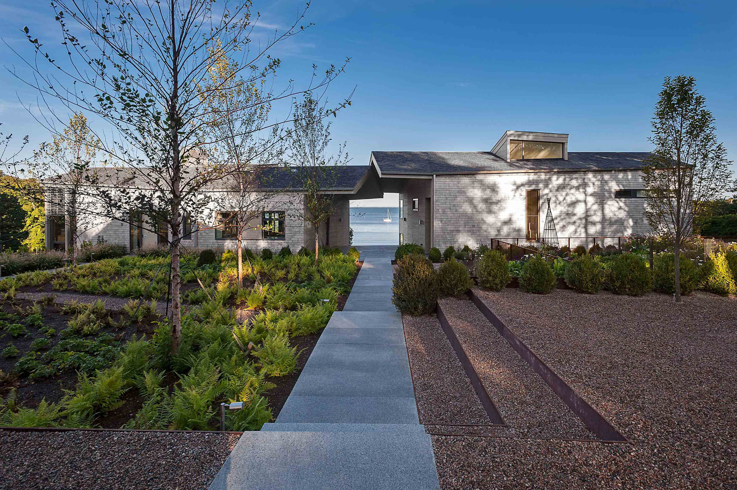 Betonowe kominki oraz kolumny schodów to punkty główne we wnętrzach, które przyciągają również uwagę pięknymi drewnianymi podłogami i subtelnym podziałem na funkcje. Ogromne przeszklenia w fasadzie od strony zatoki pozwalają podziwiać widok na pływające łodzie i naturalny krajobraz. Elewacja budynku została wykonana z drewna cedrowego, co nadaje mu naturalny wygląd od strony ulicy, a także tworzy specjalną kładkę, która łączy dom z miejscem parkingowym. Przejście prowadzi nad dawnym ogrodem różanym, gdzie miejscowi architekci odtworzyli kamienne mury i posadzili rodzime rośliny. Przechodząc przez lukę między budynkami, schodzimy na taras w kierunku wody, gdzie rodzina może cieszyć się pięknym widokiem zachodzącego słońca, jedząc na świeżym powietrzu późny obiad.