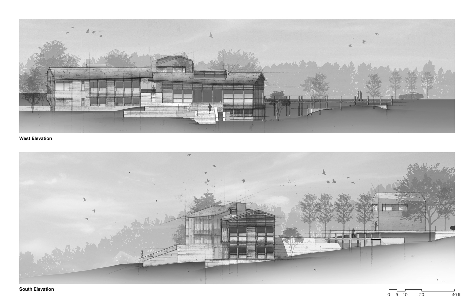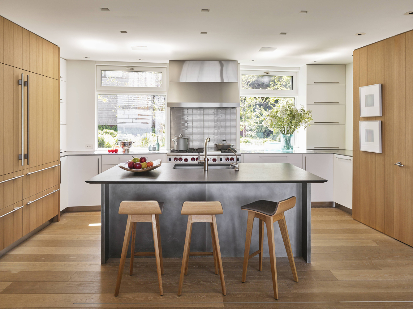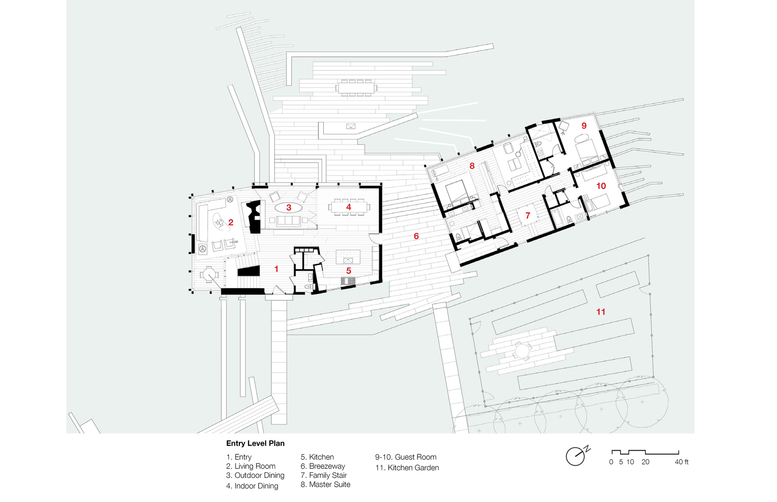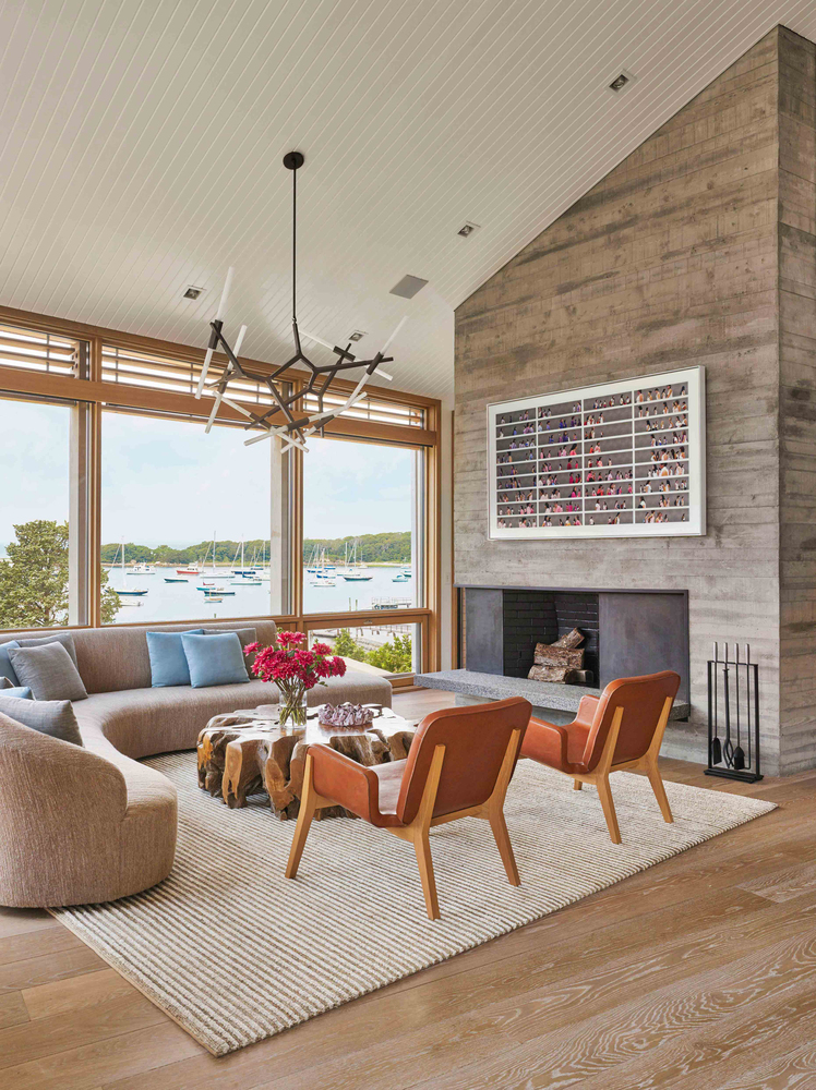 Betonowe kominki oraz kolumny schodów to punkty główne we wnętrzach, które przyciągają również uwagę pięknymi drewnianymi podłogami i subtelnym podziałem na funkcje. Ogromne przeszklenia w fasadzie od strony zatoki pozwalają podziwiać widok na pływające łodzie i naturalny krajobraz. Elewacja budynku została wykonana z drewna cedrowego, co nadaje mu naturalny wygląd od strony ulicy, a także tworzy specjalną kładkę, która łączy dom z miejscem parkingowym. Przejście prowadzi nad dawnym ogrodem różanym, gdzie miejscowi architekci odtworzyli kamienne mury i posadzili rodzime rośliny. Przechodząc przez lukę między budynkami, schodzimy na taras w kierunku wody, gdzie rodzina może cieszyć się pięknym widokiem zachodzącego słońca, jedząc na świeżym powietrzu późny obiad.