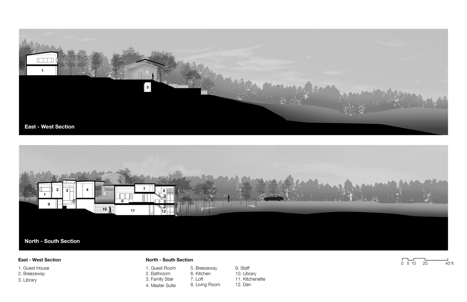 Para budynków pełni różne funkcje. Sypialnie znajdują się w części północnej – główna sypialnia oraz dwa pokoje gościnne zostały usytuowane na poziomie wejścia, a trzy sypialnie dziecięce oraz pomieszczenia pomocnicze umieszczono poniżej. W części południowej, na dwóch poziomach, zorganizowano przestrzenie do wypoczynku, jedzenia, gotowania, czytania i ćwiczeń. Niewielka zmiana poziomów w domu pomaga zdefiniować poszczególne miejsca oraz dostosowuje dom do nachylenia terenu.