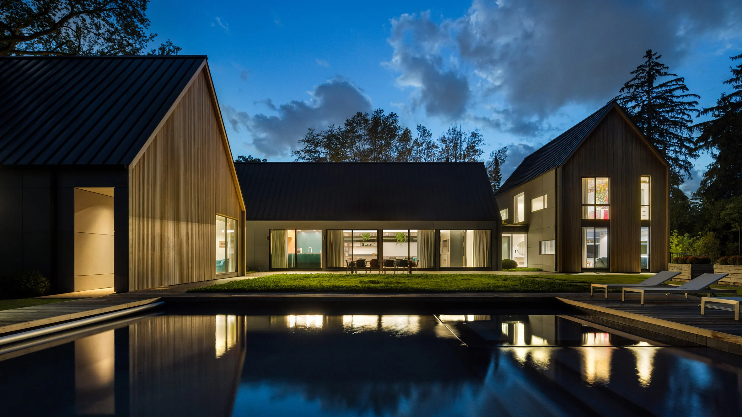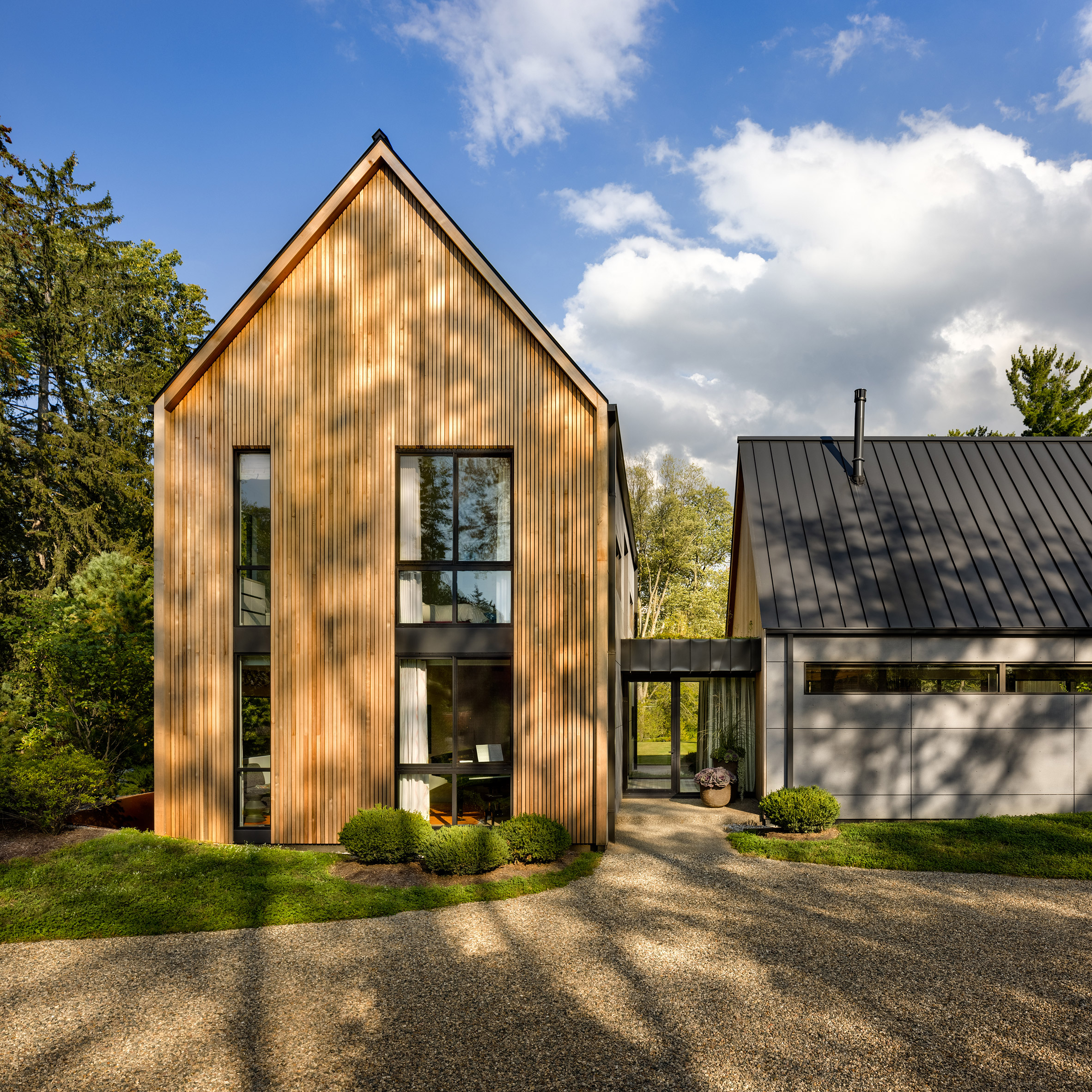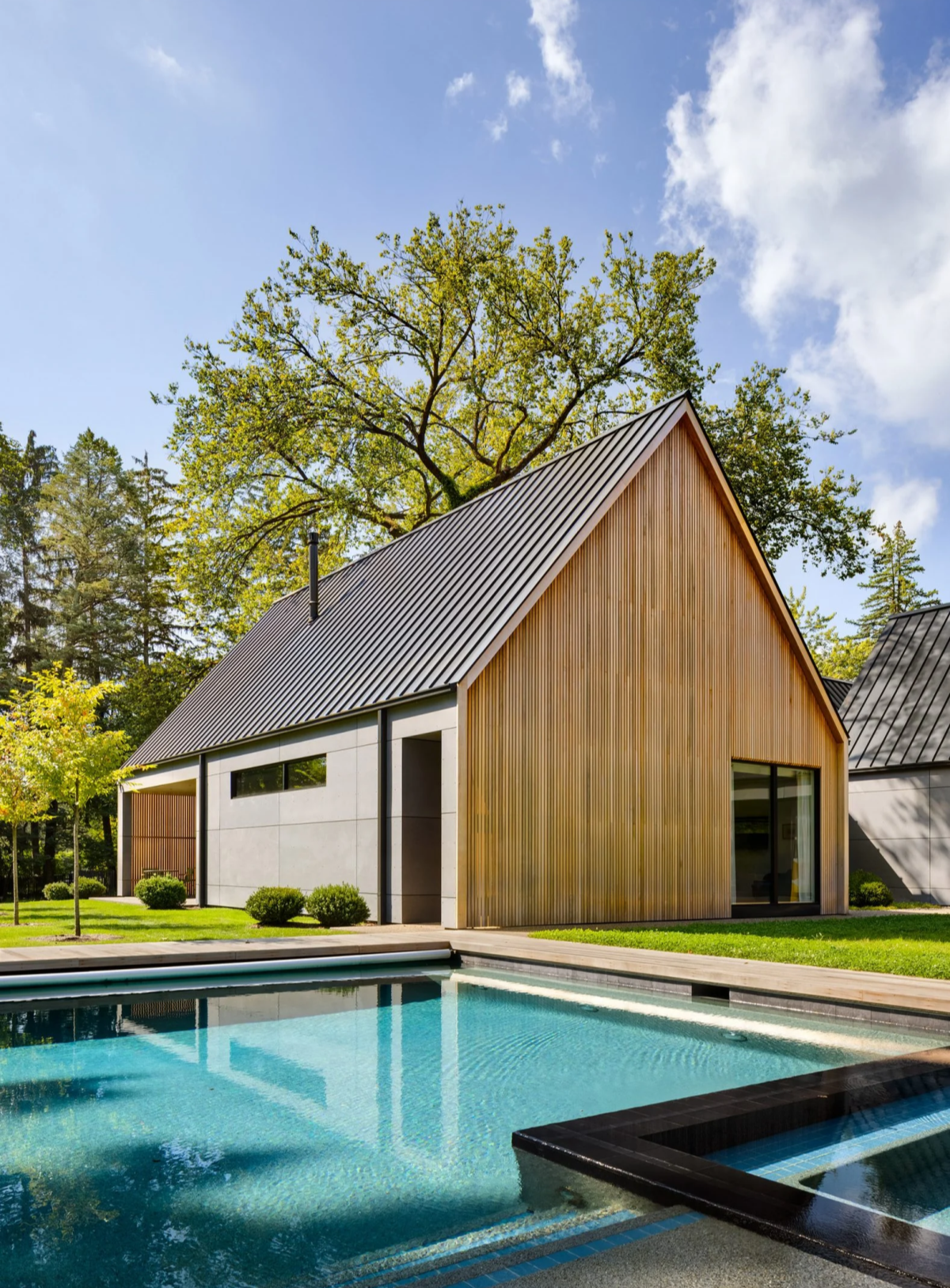 Architekci połączyli tradycyjne drewno, beton i stal, aby stworzyć elegancką i funkcjonalną przestrzeń. Ściany zewnętrzne pokryto szarymi panelami włókno-cementowymi i cedrem, co podkreśla wysokość konstrukcji. We wnętrzach zastosowano dębowe deski, orzech włoski i marmur, a przestrzenie wspólne wyróżniają się rustykalnymi detalami, jak otwarte stalowe zagięcia i sklepiony sufit. Dom ma cztery pawilony, z czego jeden pełni rolę centralnej przestrzeni rozrywkowej. Pozostałe zawierają prywatne strefy, jak sypialnie i biuro, a także salę muzyczną. Duże okna pozwalają na niezakłócony widok na zewnątrz, a basen oraz wanna z hydromasażem wprowadzają dodatkowy komfort. Przestronność i integracja z naturą to kluczowe cechy tej rezydencji.