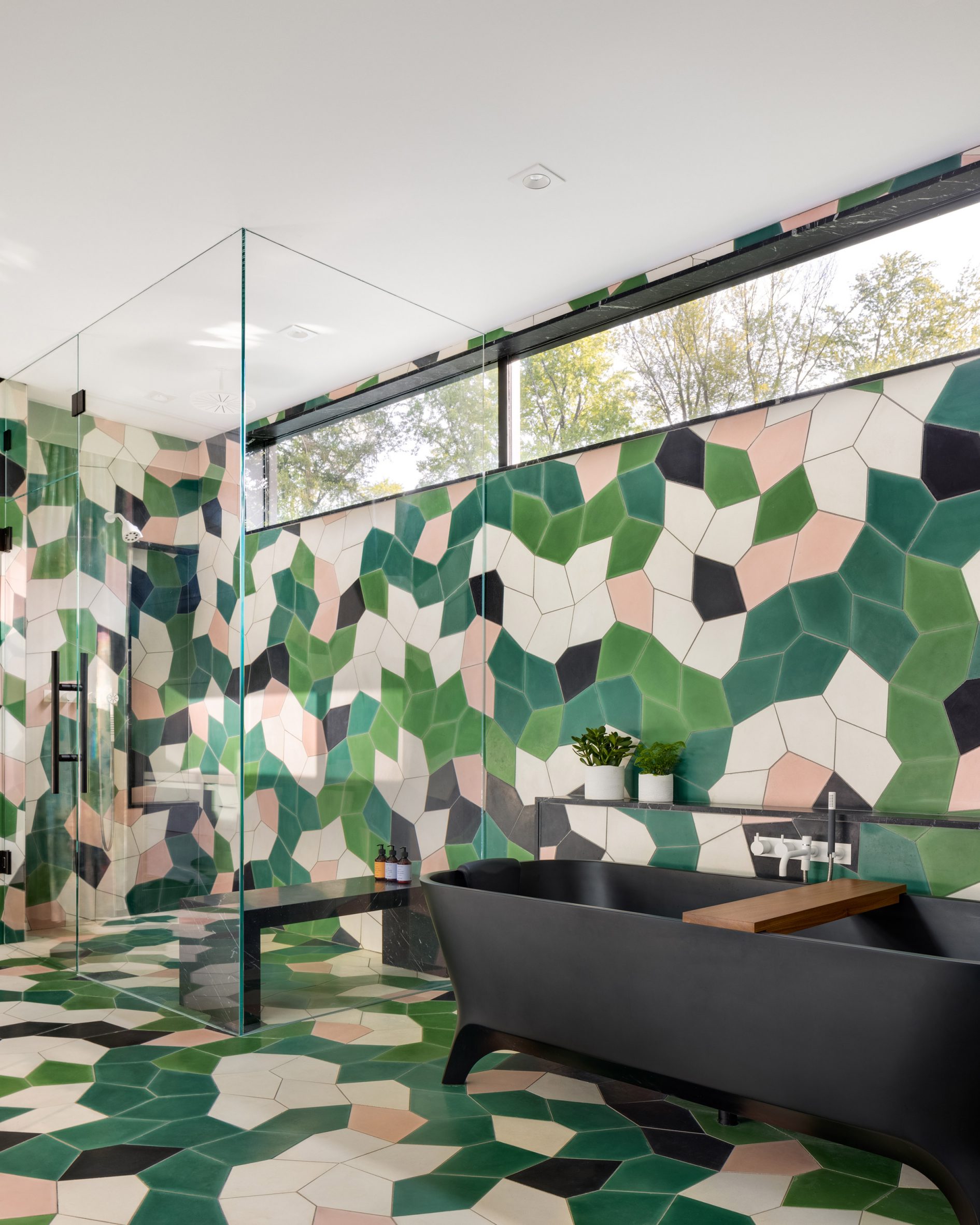 Wnętrza wyróżniają się wysokiej jakości materiałami: dębowe podłogi, marmurowe blaty w kuchni oraz szklane elementy w przestrzeniach wspólnych. Zastosowano także tęczową wykładzinę i wielobarwne kafelki w łazienkach, nadając pomieszczeniom lekko zabawny charakter. Całość tworzy przestronny i elegancki dom, idealny dla rodziny kochającej sztukę i muzykę.