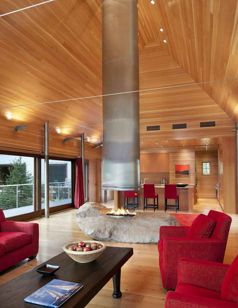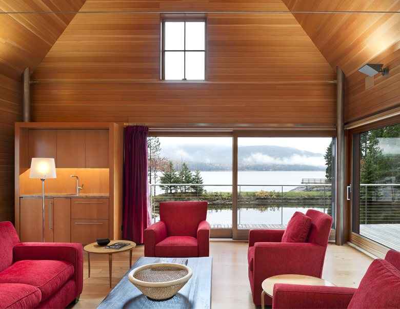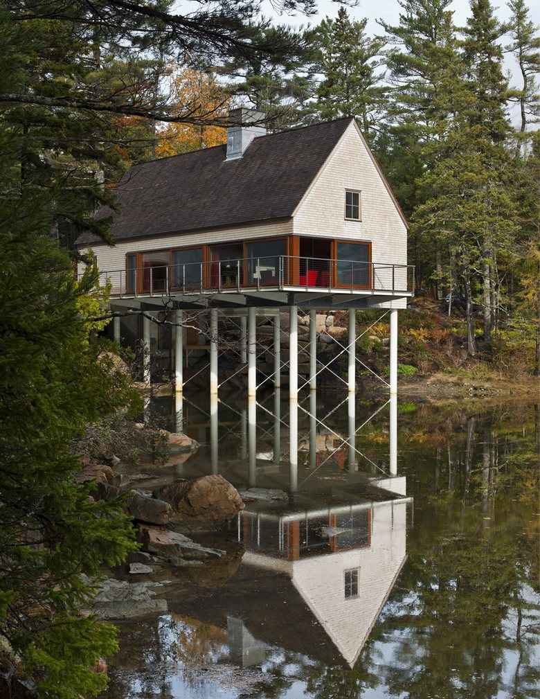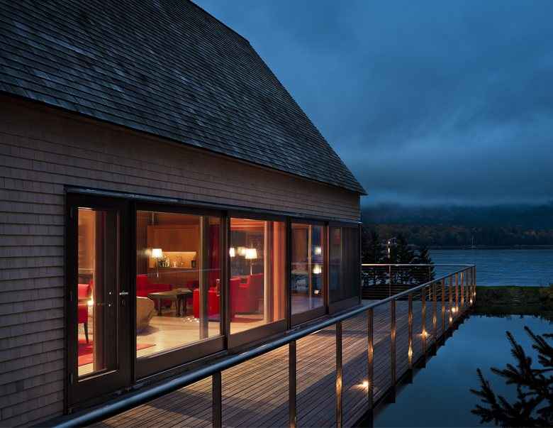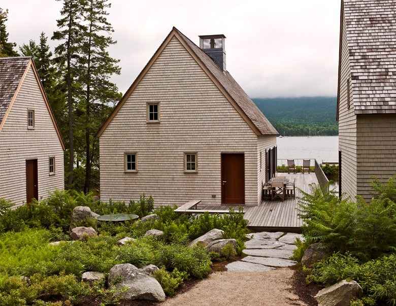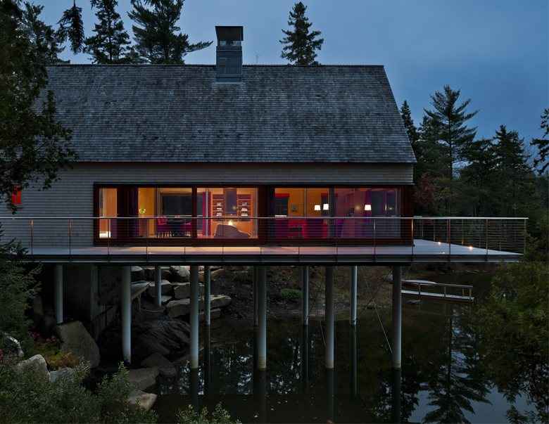 Położona na skraju surowego morskiego krajobrazu, ta nowoczesna stodoła to część unikalnego letniego kompleksu składającego się z trzech prostych domków nad jeziorem w Maine. Zainspirowana lokalnymi chatami rybackimi i tradycyjnymi budynkami nadmorskimi, kolekcja łączy znane formy z nieoczekiwanym designem. Dostęp do kompleksu prowadzi krętą leśną uliczką, która już na wejściu sugeruje tradycyjne wnętrza, skromne gontowe obicia i kompaktowe przestrzenie.